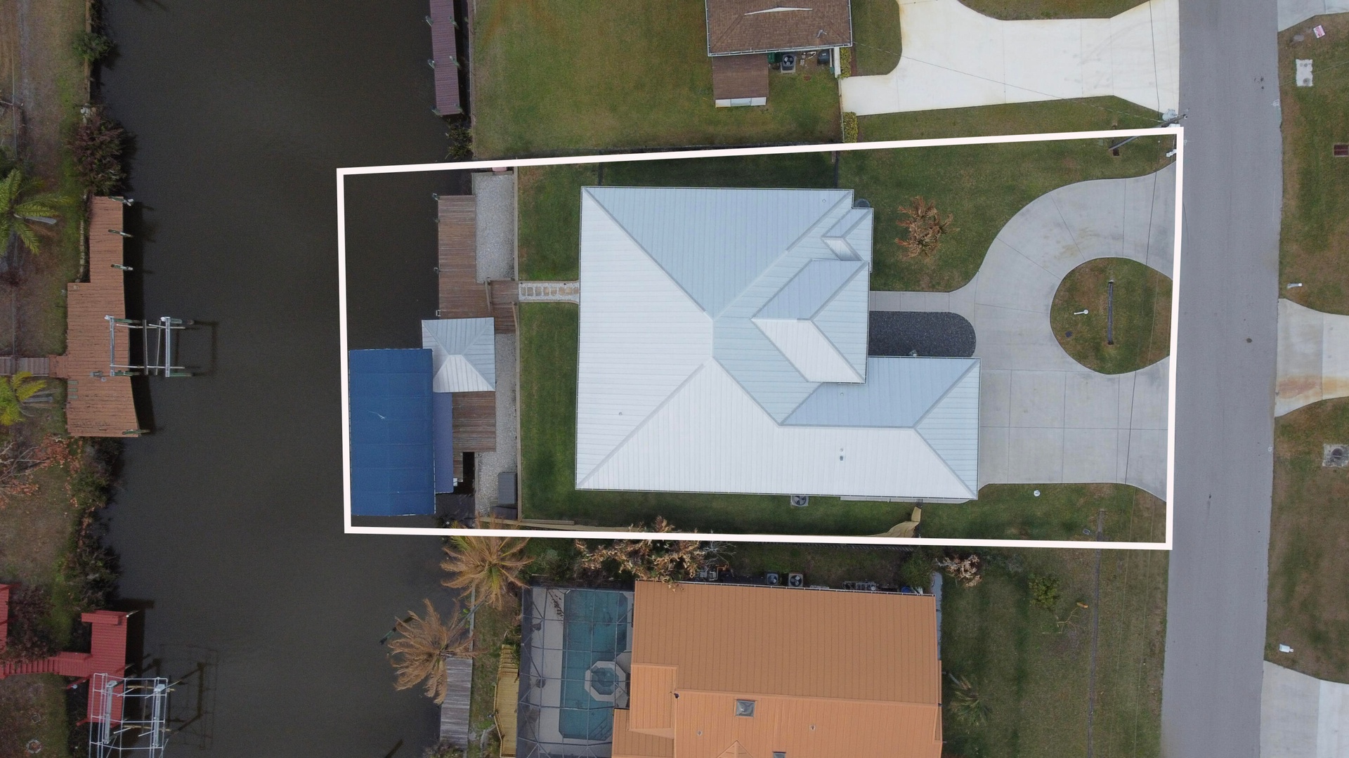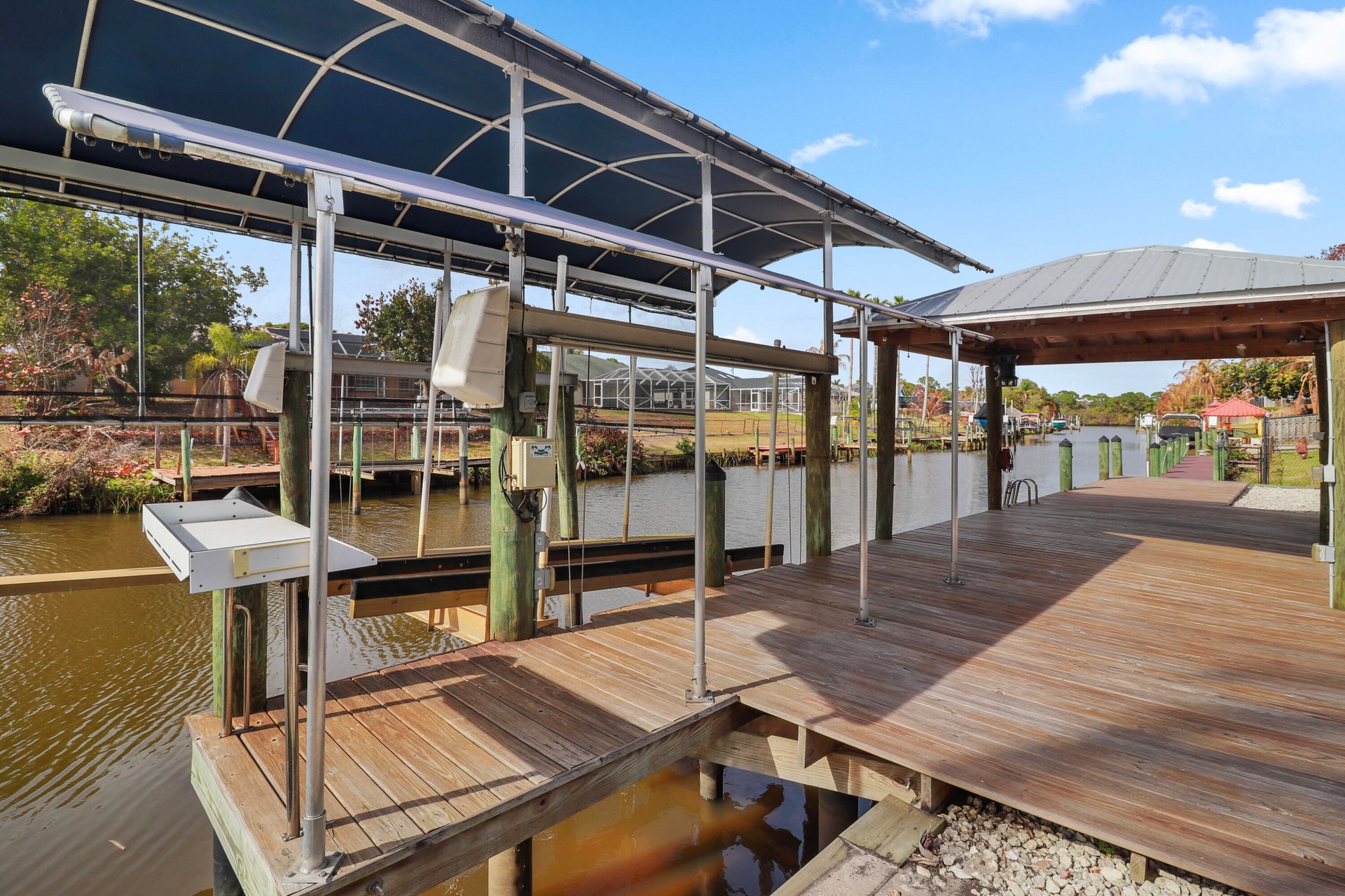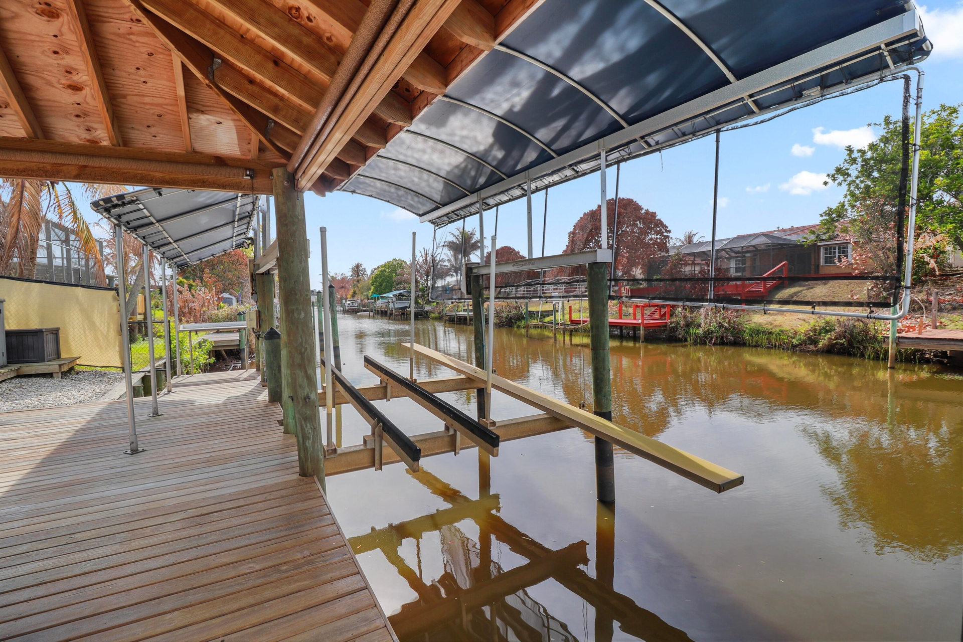 No expense was spared in the finishes and upgrades throughout the home. The open layout features a stunning kitchen with a large center island, propane cooking, and premium appliances that flow seamlessly into the main living and dining areas. Enjoy true South Florida waterfront living with a private dock and covered 16,000 lb boat lift, along with a covered patio, summer kitchen, Large Green Egg, and tiki hut overlooking the water. Additional features include six mounted Smart TVs, an integrated 8 camera Luma security system, smart home switches with Alexa capability, tankless gas water heater, water softener system, foam insulation construction, dog wash station in the laundry room, climate controlled garage, custom built in garage cabinetry, and a 50 amp RV hookup.