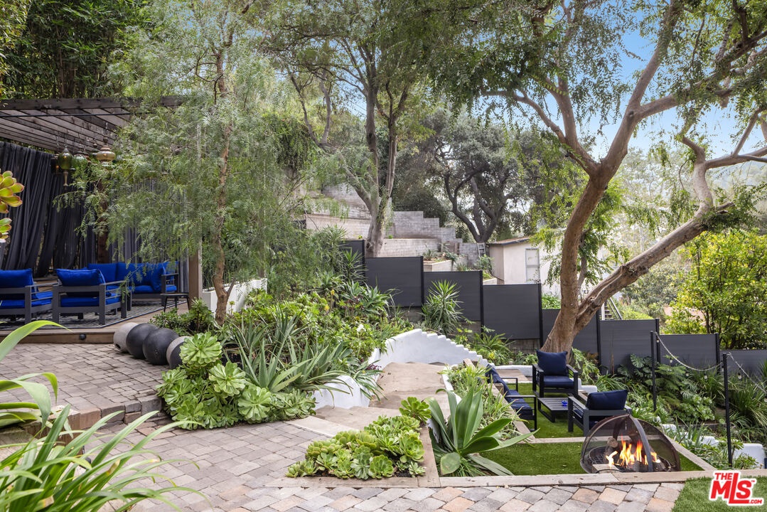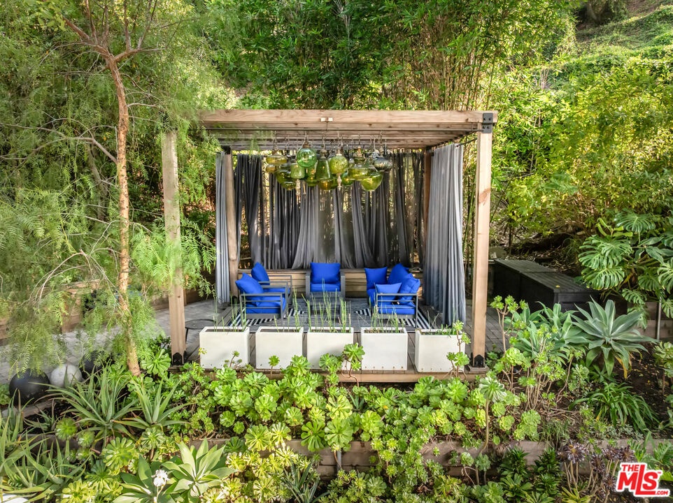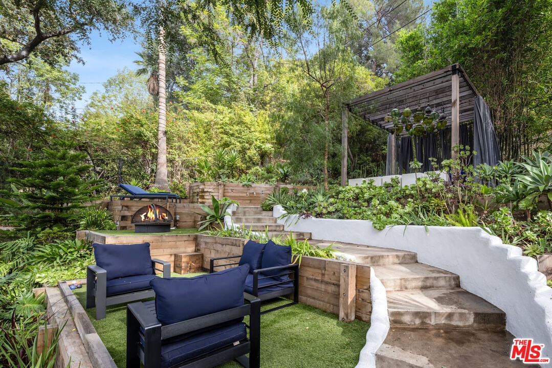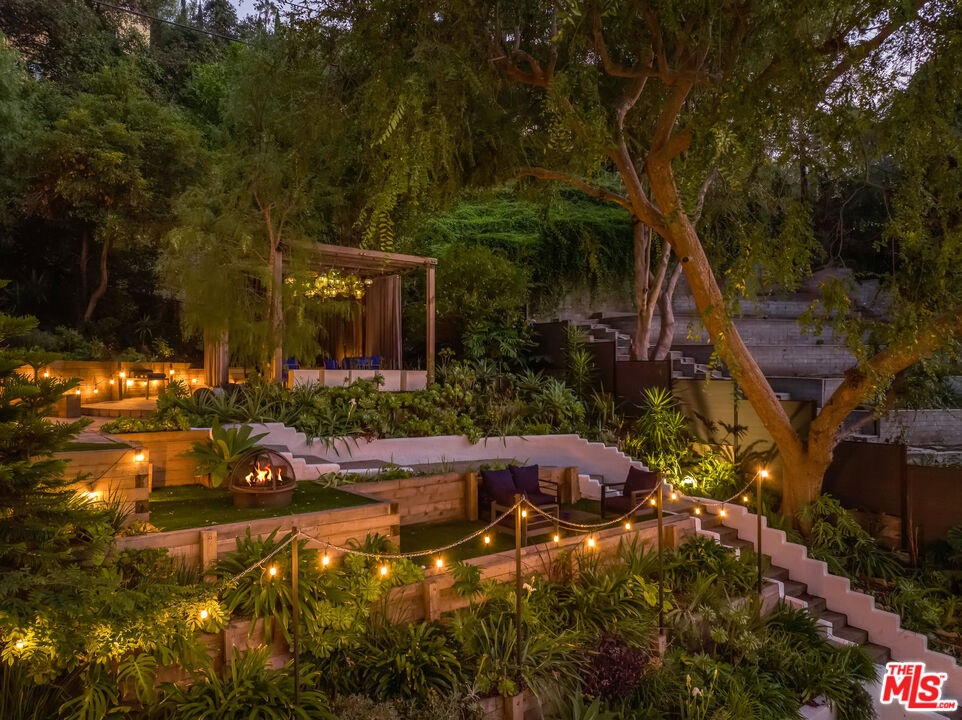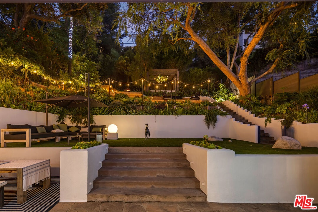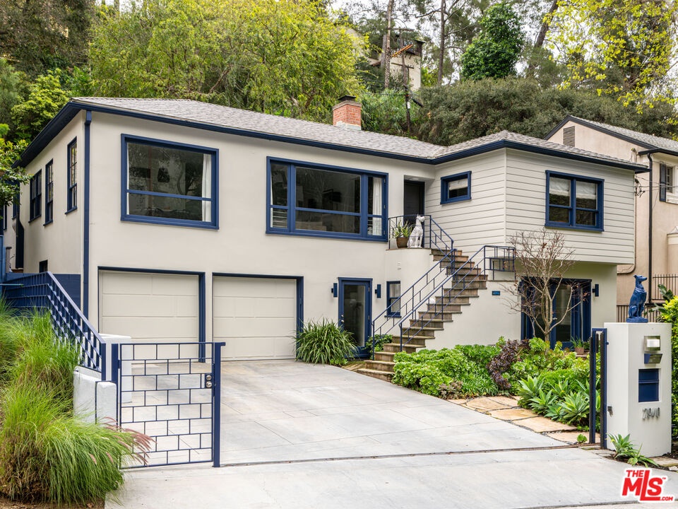 This gated Traditional home with mid-century modern influences sits on a large, wooded lot in upper Beachwood Canyon. Formerly celebrity-owned and tucked back from the street, this home's expansive rear yard is an outdoor sanctuary bringing the tranquility of nature to everyday living. Green canyon views can be seen from the oversized windows creating an airiness throughout the living space, anchored by a renovated kitchen which seamlessly joins both interior living and the outdoors. The kitchen is outfitted with built-in, luxury appliances, a large island, and plentiful countertop prep space. Whether you prefer entertaining or quiet fireside moments, this home offers the space for your household to sprawl on the 4 bedroom, 3 bath main level inclusive of an oversized, primary suite with custom Walnut built-in's and dedicated laundry/utility room. Rear French doors open to your own secluded park-like garden designed for entertaining. Winding paths of the curated grounds showcase its succulent gardens, professionally landscaped terraces, several lounging areas, banana and Meyer lemon trees, and private hilltop pergola illuminated by a masterfully designed light installation. Out of town guests can enjoy the privacy of a private guest suite on the lower level with its own kitchenette, bathroom, bedroom/office and private garden. The two-car garage features built-in cabinets & utility sink. Close to hiking trails, Beachwood market, city night life, and major studios. Experience the magic of this private sanctuary in iconic Beachwood Canyon.