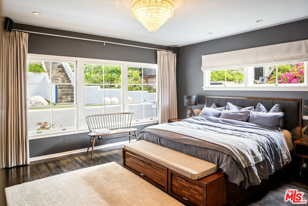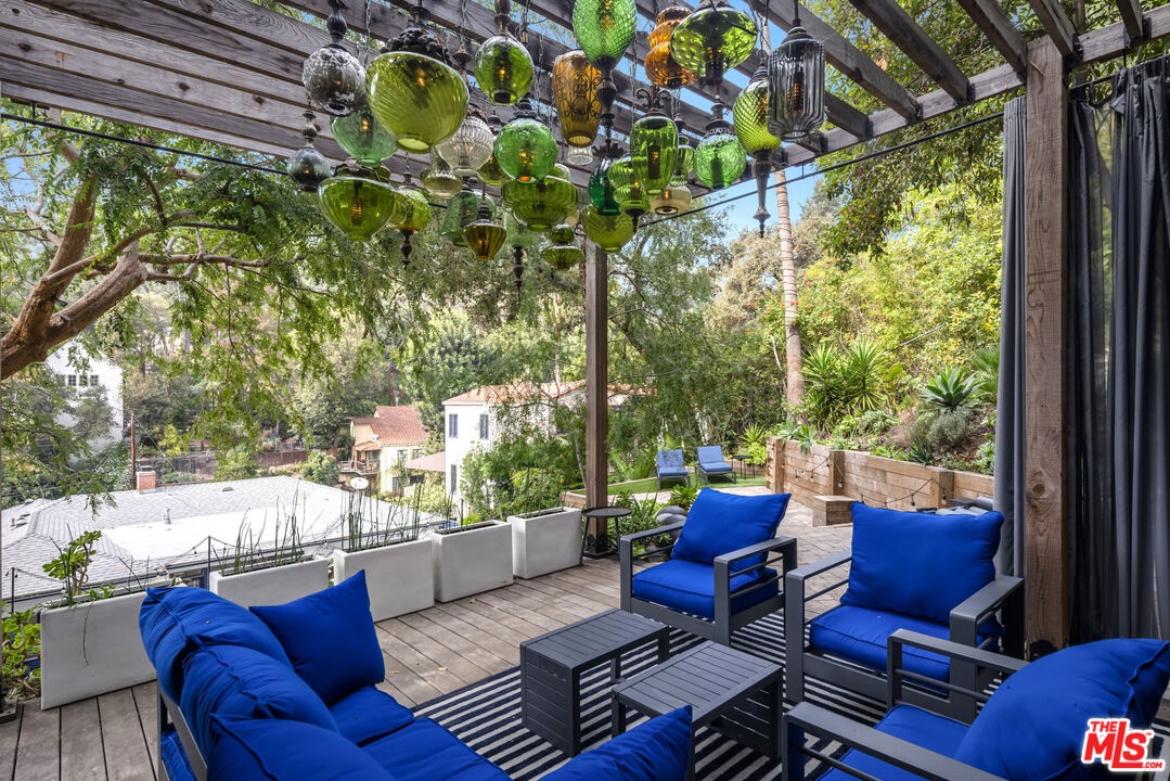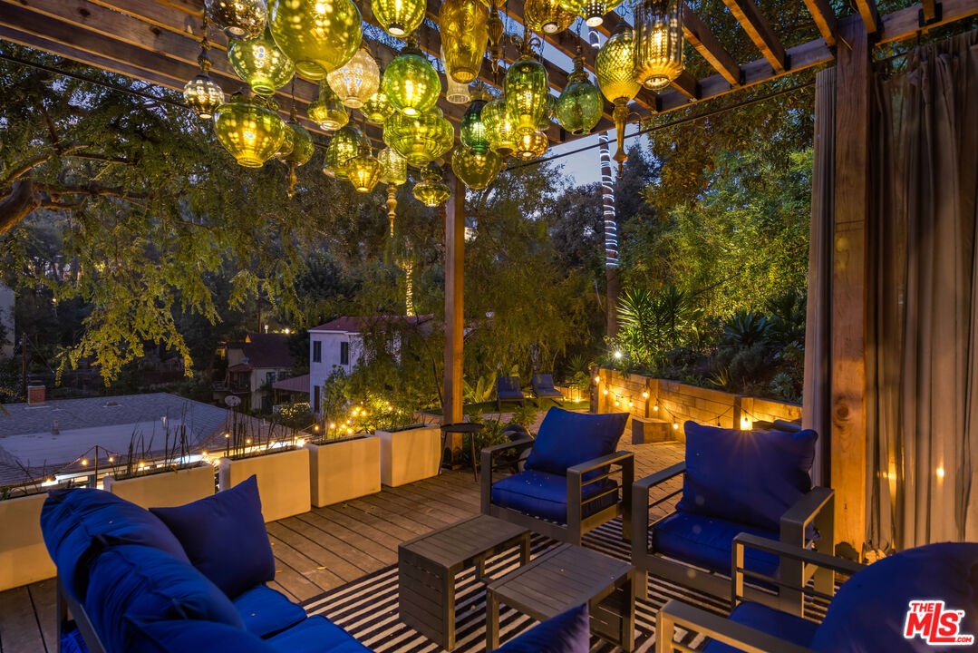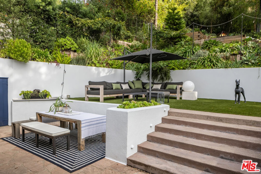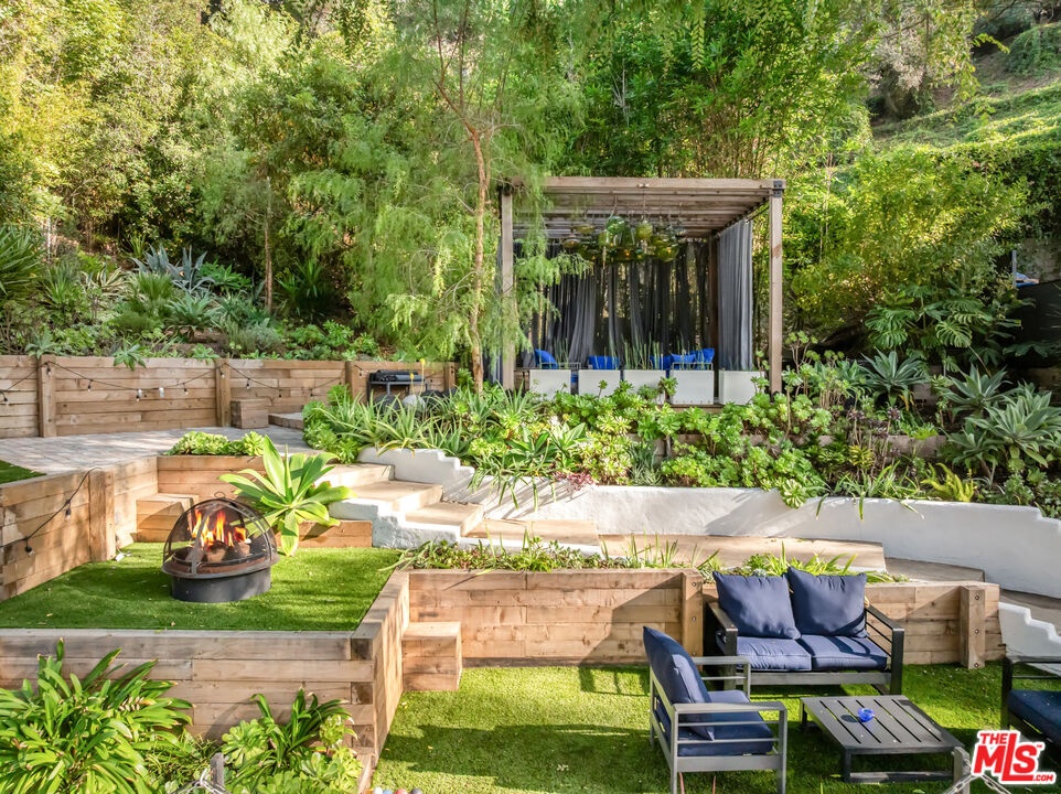 This gated Traditional home with mid-century modern influences sits on a large, wooded lot in upper Beachwood Canyon. Formerly celebrity-owned and tucked back from the street, this home's expansive rear yard is an outdoor sanctuary bringing the tranquility of nature to everyday living. Green canyon views can be seen from the oversized windows creating an airiness throughout the living space, anchored by a renovated kitchen which seamlessly joins both interior living and the outdoors. The kitchen is outfitted with built-in, luxury appliances, a large island, and plentiful countertop prep space. Whether you prefer entertaining or quiet fireside moments, this home offers the space for your household to sprawl on the 4 bedroom, 3 bath main level inclusive of an oversized, primary suite with custom Walnut built-in's and dedicated laundry/utility room. Rear French doors open to your own secluded park-like garden designed for entertaining. Winding paths of the curated grounds showcase its succulent gardens, professionally landscaped terraces, several lounging areas, banana and Meyer lemon trees, and private hilltop pergola illuminated by a masterfully designed light installation. Out of town guests can enjoy the privacy of a private guest suite on the lower level with its own kitchenette, bathroom, bedroom/office and private garden. The two-car garage features built-in cabinets & utility sink. Close to hiking trails, Beachwood market, city night life, and major studios. Experience the magic of this private sanctuary in iconic Beachwood Canyon.
