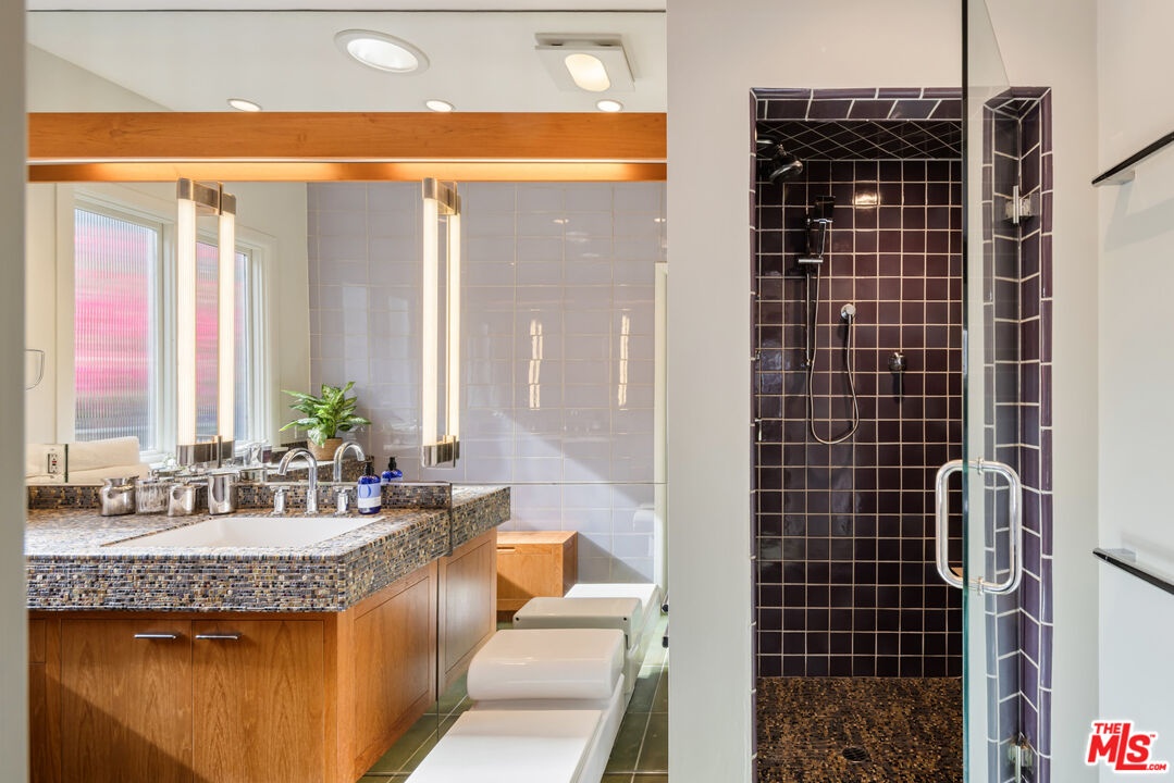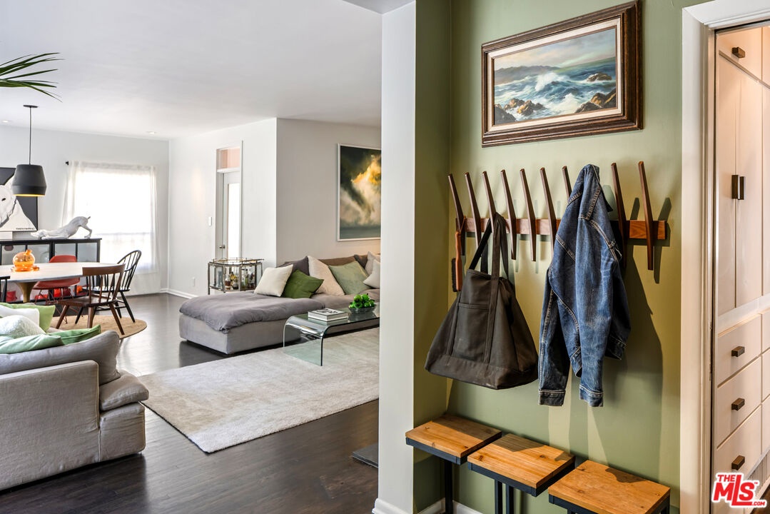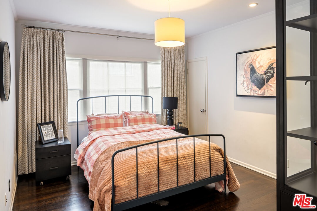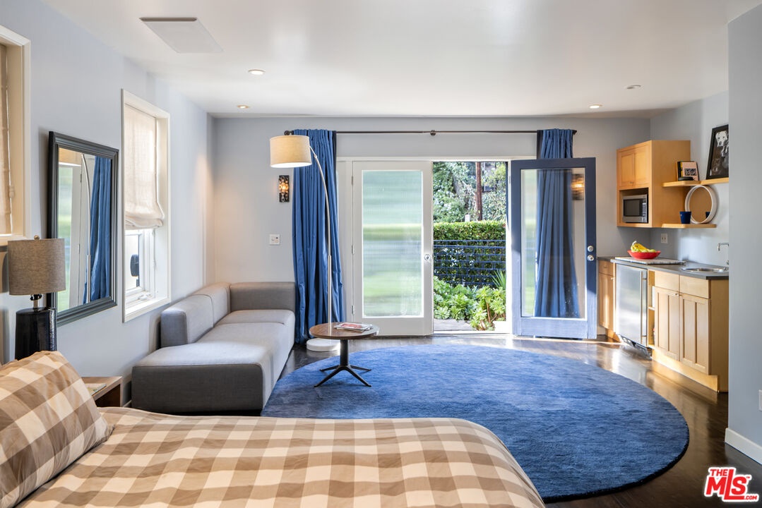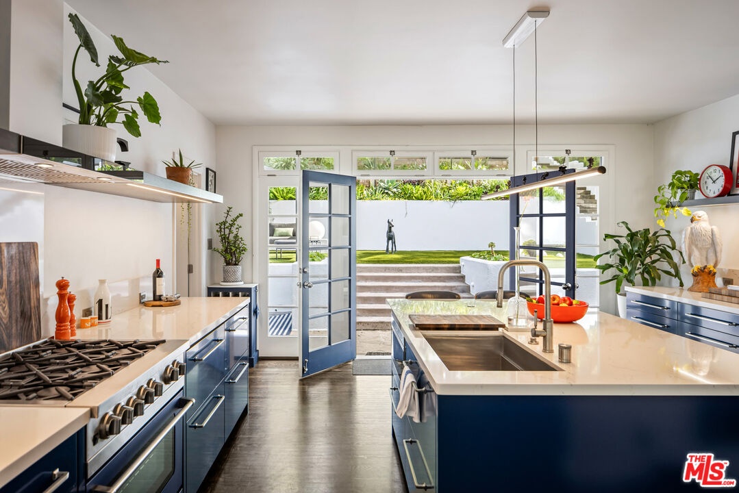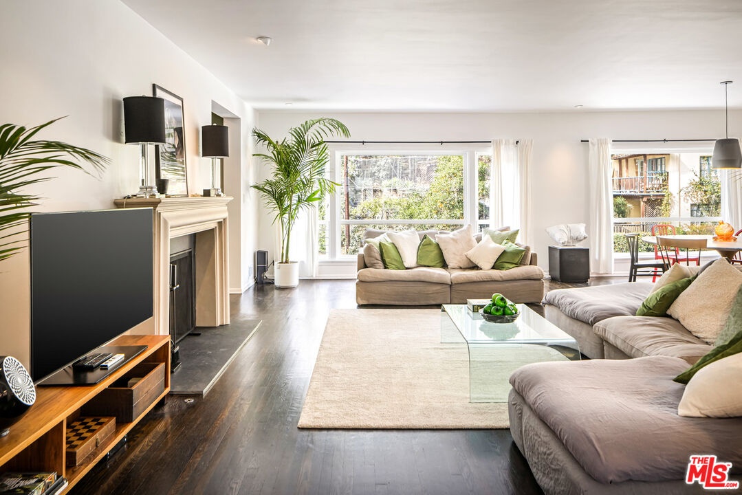 This gated Traditional home with mid-century modern influences sits on a large, wooded lot in upper Beachwood Canyon. Formerly celebrity-owned and tucked back from the street, this home's expansive rear yard is an outdoor sanctuary bringing the tranquility of nature to everyday living. Green canyon views can be seen from the oversized windows creating an airiness throughout the living space, anchored by a renovated kitchen which seamlessly joins both interior living and the outdoors. The kitchen is outfitted with built-in, luxury appliances, a large island, and plentiful countertop prep space. Whether you prefer entertaining or quiet fireside moments, this home offers the space for your household to sprawl on the 4 bedroom, 3 bath main level inclusive of an oversized, primary suite with custom Walnut built-in's and dedicated laundry/utility room. Rear French doors open to your own secluded park-like garden designed for entertaining. Winding paths of the curated grounds showcase its succulent gardens, professionally landscaped terraces, several lounging areas, banana and Meyer lemon trees, and private hilltop pergola illuminated by a masterfully designed light installation. Out of town guests can enjoy the privacy of a private guest suite on the lower level with its own kitchenette, bathroom, bedroom/office and private garden. The two-car garage features built-in cabinets & utility sink. Close to hiking trails, Beachwood market, city night life, and major studios. Experience the magic of this private sanctuary in iconic Beachwood Canyon.