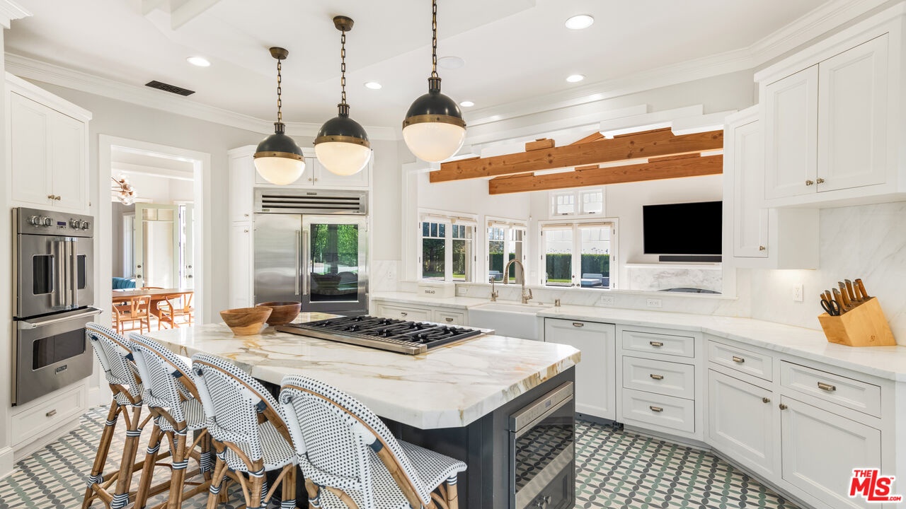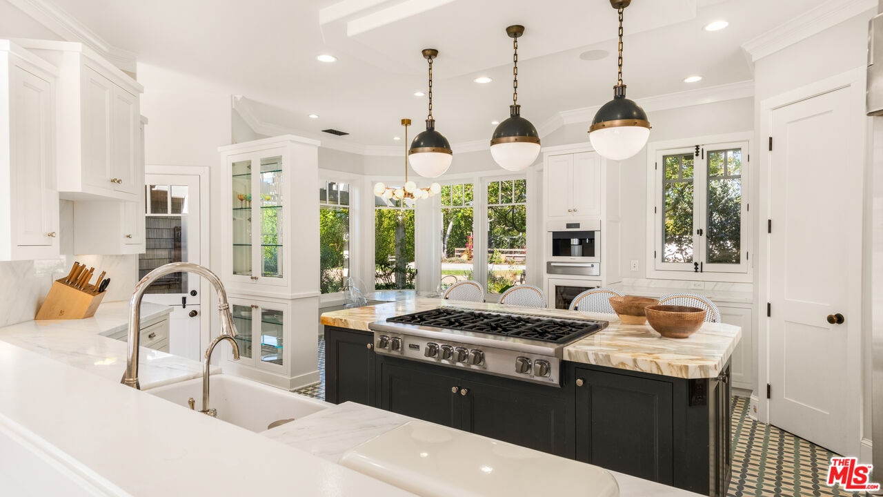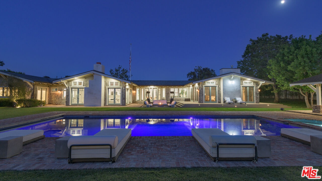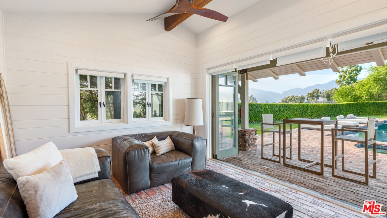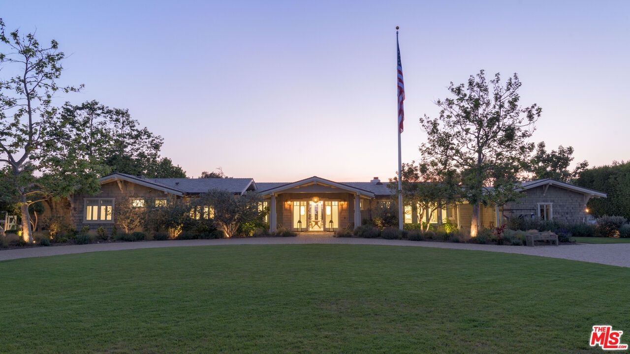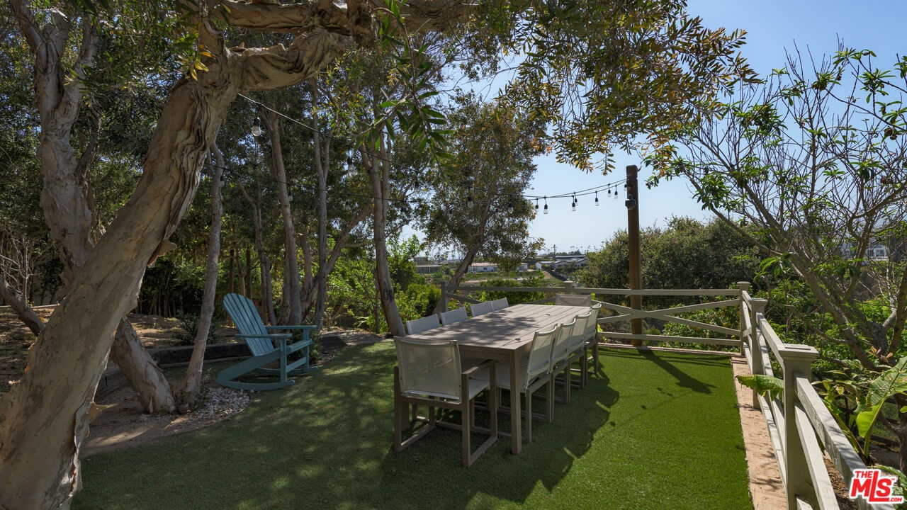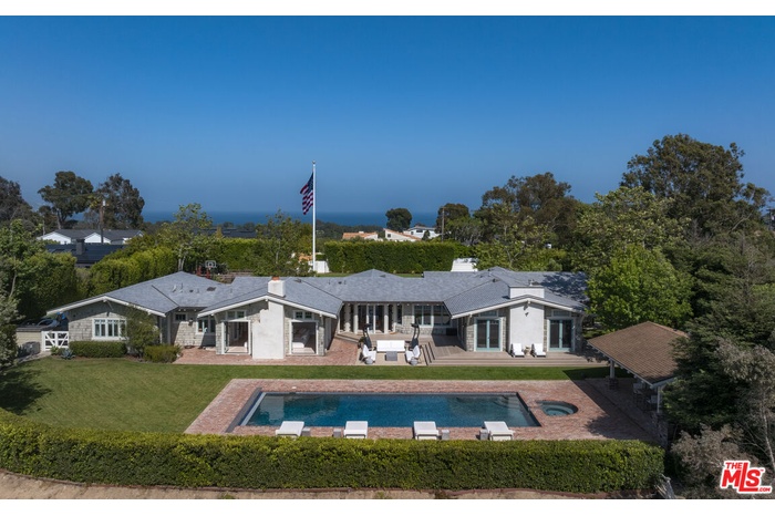 Set behind gates along coveted Dume Road, this private Point Dume estate offers sweeping ocean, mountain, and sunset views across expansive resort-like grounds. A circular driveway, manicured hedges, and broad grassy lawn create a classic arrival with exceptional privacy and parking for 10+ vehicles.A covered entry opens to a light-filled foyer with high ceilings, wood floors, and immediate ocean views. The main living areas feature vaulted wood-beamed ceilings, French doors, and seamless indoor outdoor flow to patios, lawns, and pool terraces. The family room and formal dining room with bar area both open to the backyard, while a lower living room with stone fireplace provides an additional gathering space. A dedicated office library with rolling ladder shelving offers a quiet retreat.The chef's kitchen includes a large stone island with seating, Viking 8-burner range and double ovens, Sub-Zero refrigeration, Bosch dishwasher, Wolf microwave, Miele coffee system, wine refrigeration, walk-in pantry, and a bright breakfast nook overlooking the front gardens.The primary suite features vaulted ceilings, fireplace, French doors to the grounds, and a spa-style bath with marble double vanity, soaking tub, oversized shower, bidet water closet, and expansive custom walk-in closet. Additional bedrooms include lofted sleeping spaces, walk-in closets, and en-suite or Jack-and-Jill baths. A bonus room with bath off the garage offers flexible use as gym, studio, or office.Outdoors, the property functions as a private compound. A large rectangular pool and spa are surrounded by brick terraces, lawns, firepit lounge, outdoor heaters, and entertaining patios. A separate guest house with bath and outdoor shower sits beside a barbecue pavilion with grill and refrigeration. Meandering garden paths, citrus trees, apple tree, turf seating areas, sports court, chicken coop, and mature landscaping enhance the grounds.Additional features include a 3-car garage currently outfitted as a gym, central vacuum, water filtration system, iPort smart home system, Nest climate control, exterior cameras, and gated intercom entry.Includes coveted Riviera 3 beach key access to Point Dume's private beach gate.Located moments from beaches, trails, and the Point Dume Village, this rare offering combines scale, privacy, and classic Malibu coastal living in one of the area's most sought-after neighborhoods.
