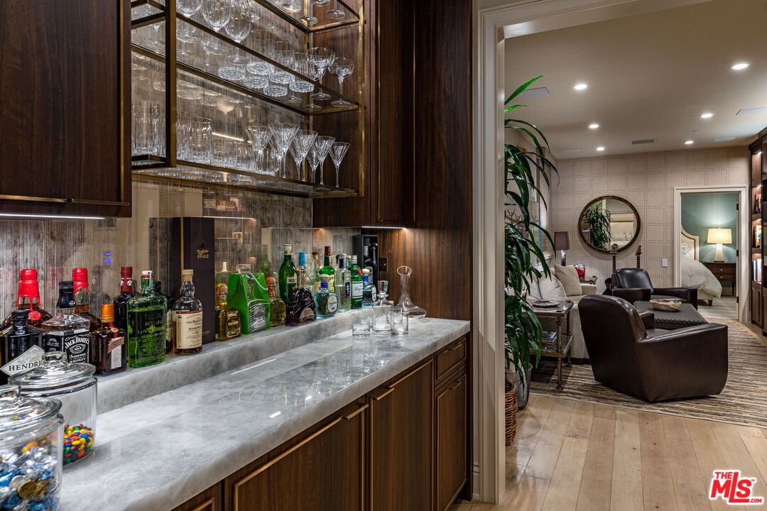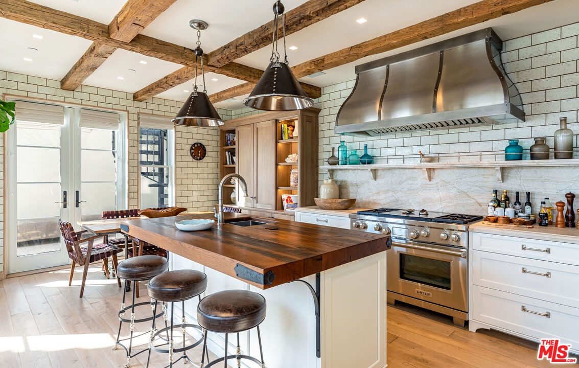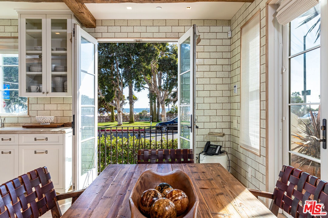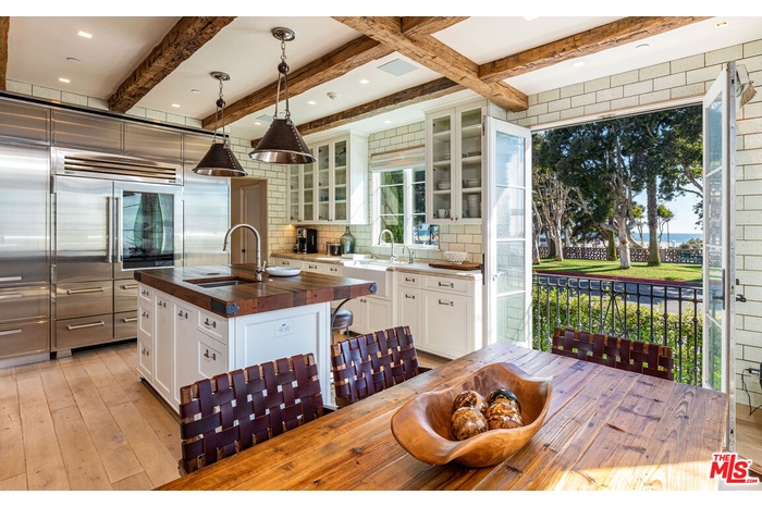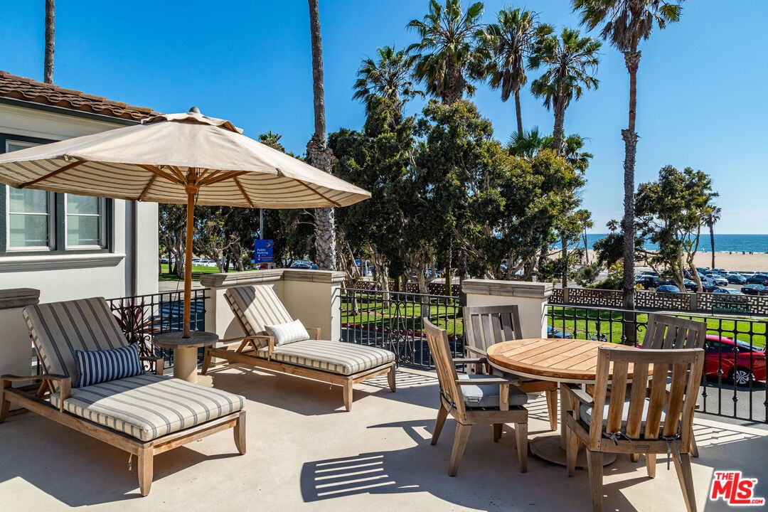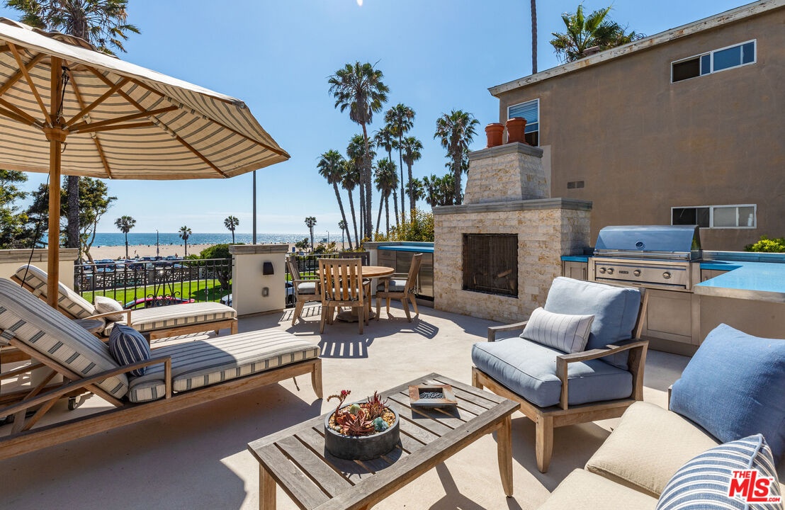 Front Row on Ocean Avenue-- Oceanfront Home for Lease in Santa Monica. One of only eight single-family homes on the front row of Ocean Avenue, this 3-bed, 3.5-bath home sits on a prime corner lot with head-on ocean and sunset views from nearly every room. Vaulted wood beams run throughout the entire main floor. A statement fireplace anchors the living room and French doors open directly onto a private terrace for seamless indoor-outdoor living. The chef's kitchen is built around a Wolf range with double oven, Sub-Zero refrigerator with matching stainless steel storage, and a large island with its own sink. Double doors open to a front balcony with stunning ocean views, while a second set opens to a patio with a spiral staircase leading up to a 400 sq ft rooftop terrace with a grill, fireplace, and space to sun or dine. The entire top floor is dedicated to the primary suite, which includes a bonus den/office, Juliet balcony, spa tub, separate shower, dual sinks, and large closet. On the lower level, two en suite bedrooms with walk-in closets and updated bathrooms bookend a central media room and dry bar, with a laundry room with ample storage and a separate entrance rounding out the floor. Minutes from shopping and dining on Main Street, Abbott Kinney, and Downtown Santa Monica. The beach, the views, the best of the Westside right outside your door.