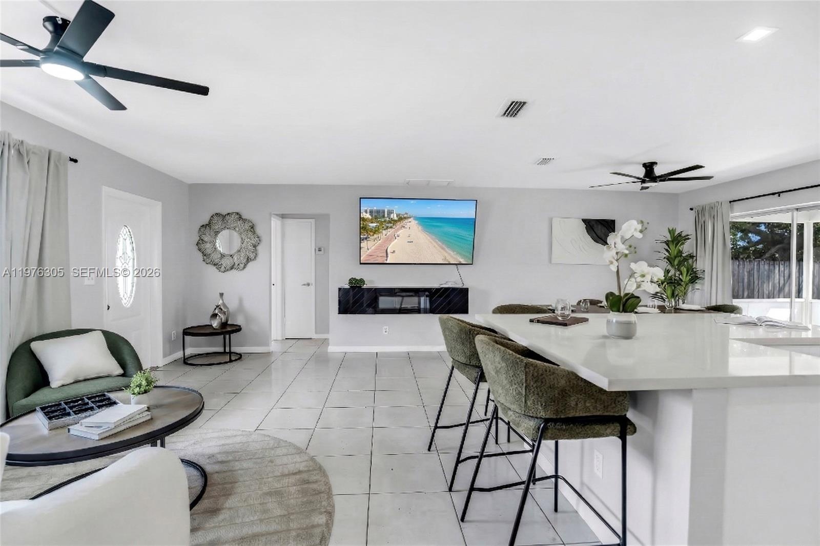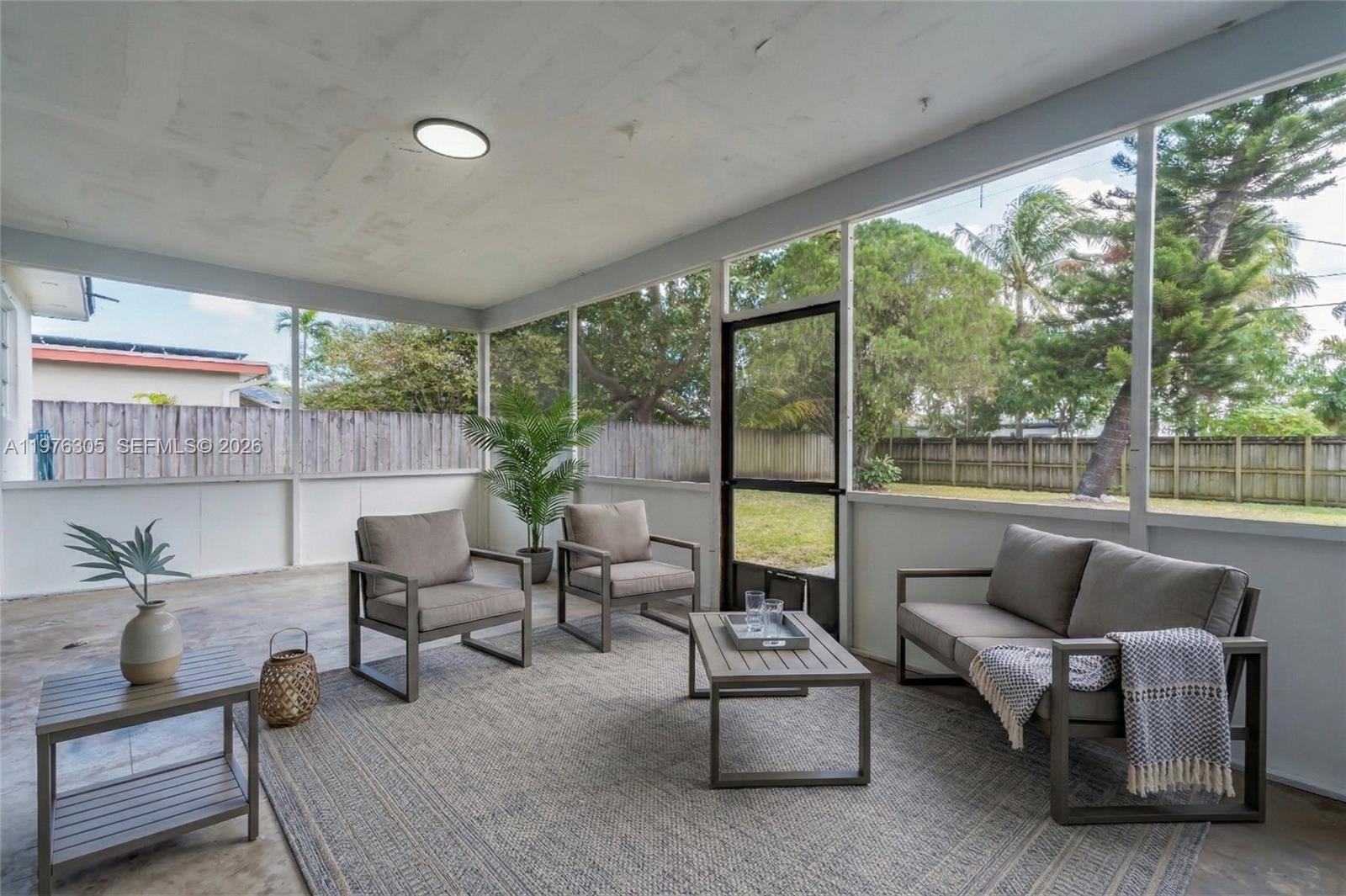 Inside, the home features a bright open concept layout ideal for entertaining. The fully renovated kitchen showcases quartz countertops, white shaker cabinets, and newer stainless steel appliances. A split floor plan provides privacy with the primary suite on one side and additional bedrooms on the other. The home offers 3 bedrooms PLUS A DEN or flex space that can easily serve as a fourth bedroom, along with two updated bathrooms. The primary suite features a walk in closet and glass shower.Enjoy the South Florida lifestyle from the fully screened patio overlooking the spacious backyard, perfect for relaxing, entertaining, or creating your dream outdoor space.