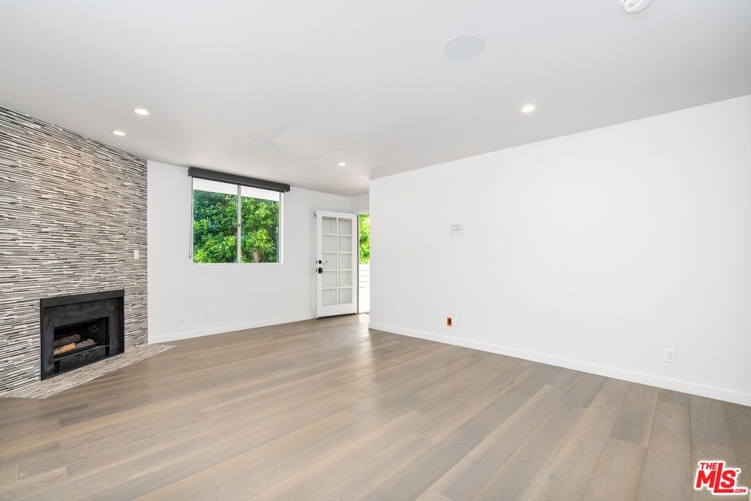 Stylish West Hollywood corner condo located just off the Sunset Strip and adjacent to Beverly Hills. This residence has high-quality finishes and a cohesive, modern color palette throughout. Light and bright living and dining areas feature a fireplace, walls of glass, and direct access to a wrap-around balcony with treetop and city views. The kitchen offers stainless steel appliances, including a wine refrigerator, center island with breakfast bar and storage, soft-close cabinetry, and an enlarged pass-through ideal for entertaining. The primary suite includes a fireplace, custom walk-in closet, and access to a private balcony. Modern bathrooms showcase contemporary finishes and thoughtful design. This home offers comfortable, turnkey living in a prime West Hollywood location.