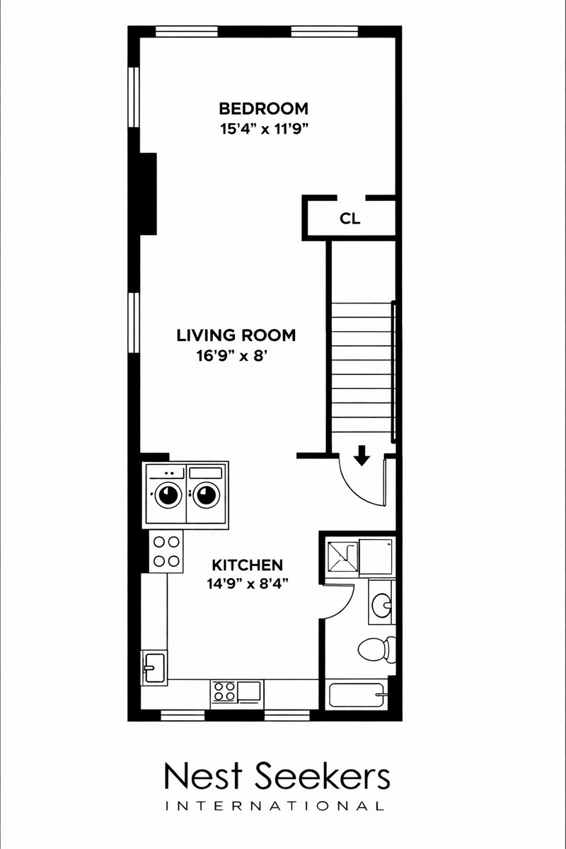 Bright and spacious railroad-style 1 bedroom / 1 bathroom apartment located in the heart of Hunters Point, Long Island City, just steps from the waterfront and the Vernon–Jackson 7 train.