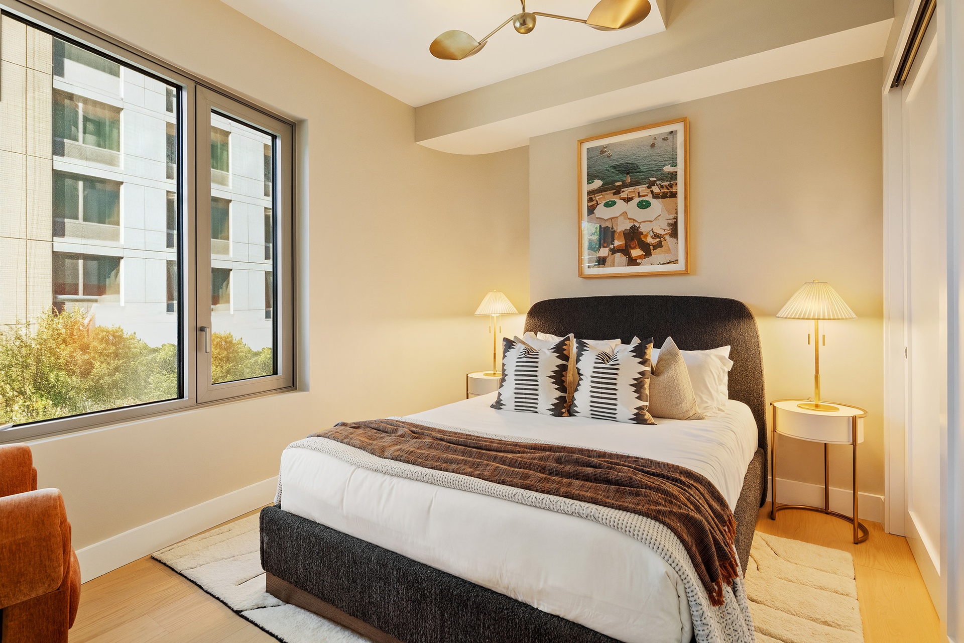 The primary suite offers excellent closet space and a serene en-suite bathroom adorned with patterned floor tiles, a custom wood-paneled double vanity, tasteful wall sconces, and a walk-in shower with both rain and handheld showerheads. The second bedroom includes a reach-in closet, while the second bathroom features a deep soaking tub. All bathrooms are outfitted with radiant heated floors. A second private terrace and a stacked washer/dryer complete this bespoke home.