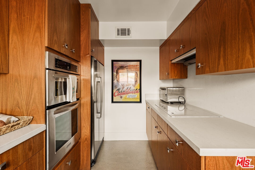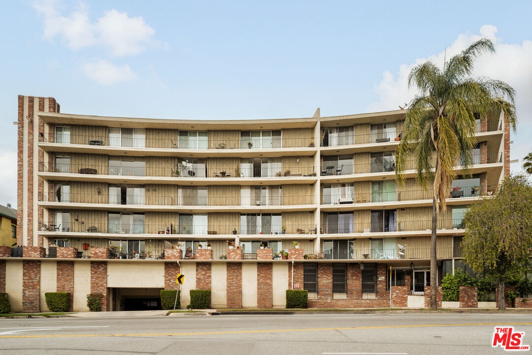 Set in the iconic Pilgrimage House, a distinctive 1965 mid-century building at the base of the Hollywood Hills, this residence reflects the architectural spirit of classic Los Angeles with its sweeping curved design and central courtyard. Inside, an open living and dining area is framed by large windows that bring in natural light and neighborhood views of the surrounding hills. The kitchen was thoughtfully remodeled in the late 1990s and features warm wood cabinetry paired with stainless steel appliances and a conduction cooktop, while the bathroom showcases floor-to-ceiling tile. Well-proportioned spaces create a comfortable and easy flow throughout the home. Pilgrimage House residents enjoy a pool, controlled access, and gated parking - hallmarks of a well-maintained mid-century community known for its quiet, peaceful setting. Located just north of Franklin Avenue at the base of the Hollywood Dell, the home places you moments from the Hollywood Bowl, the Walk of Fame, Runyon Canyon, and the vibrant dining and cultural energy of Hollywood. Nearby landmarks like Griffith Observatory and the illuminated Hollywood Cross further define this uniquely Los Angeles setting. This is more than a residence - it's a piece of Hollywood's mid-century heritage, thoughtfully preserved for modern living.