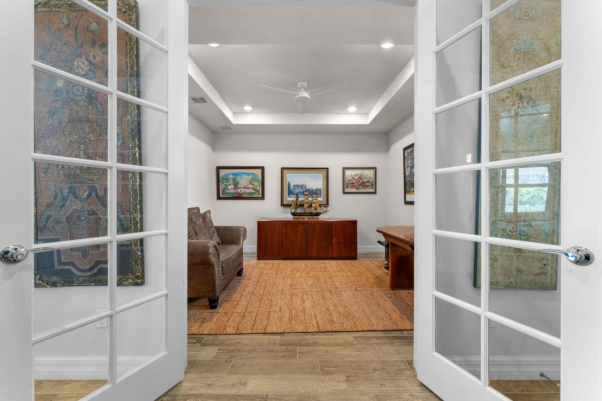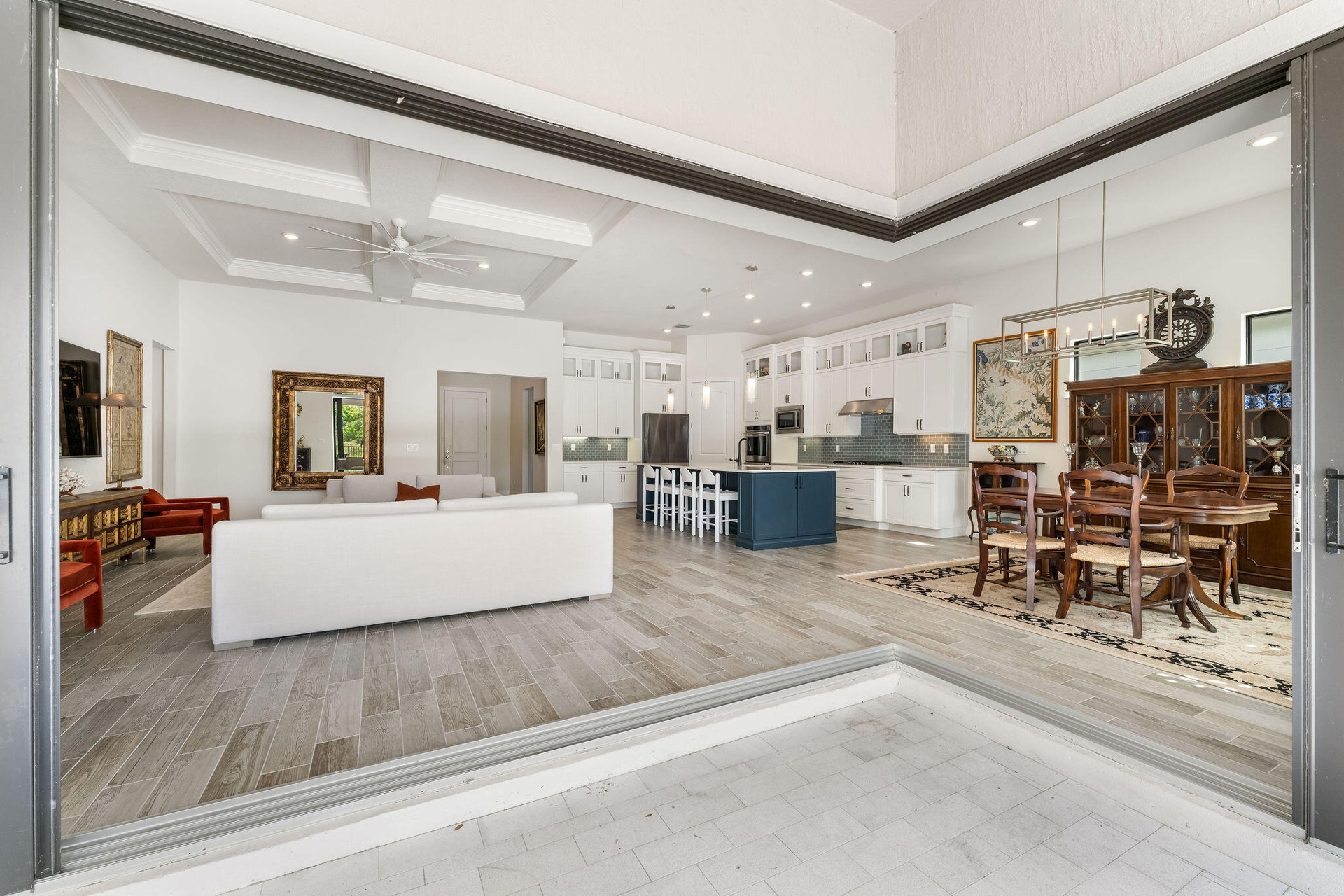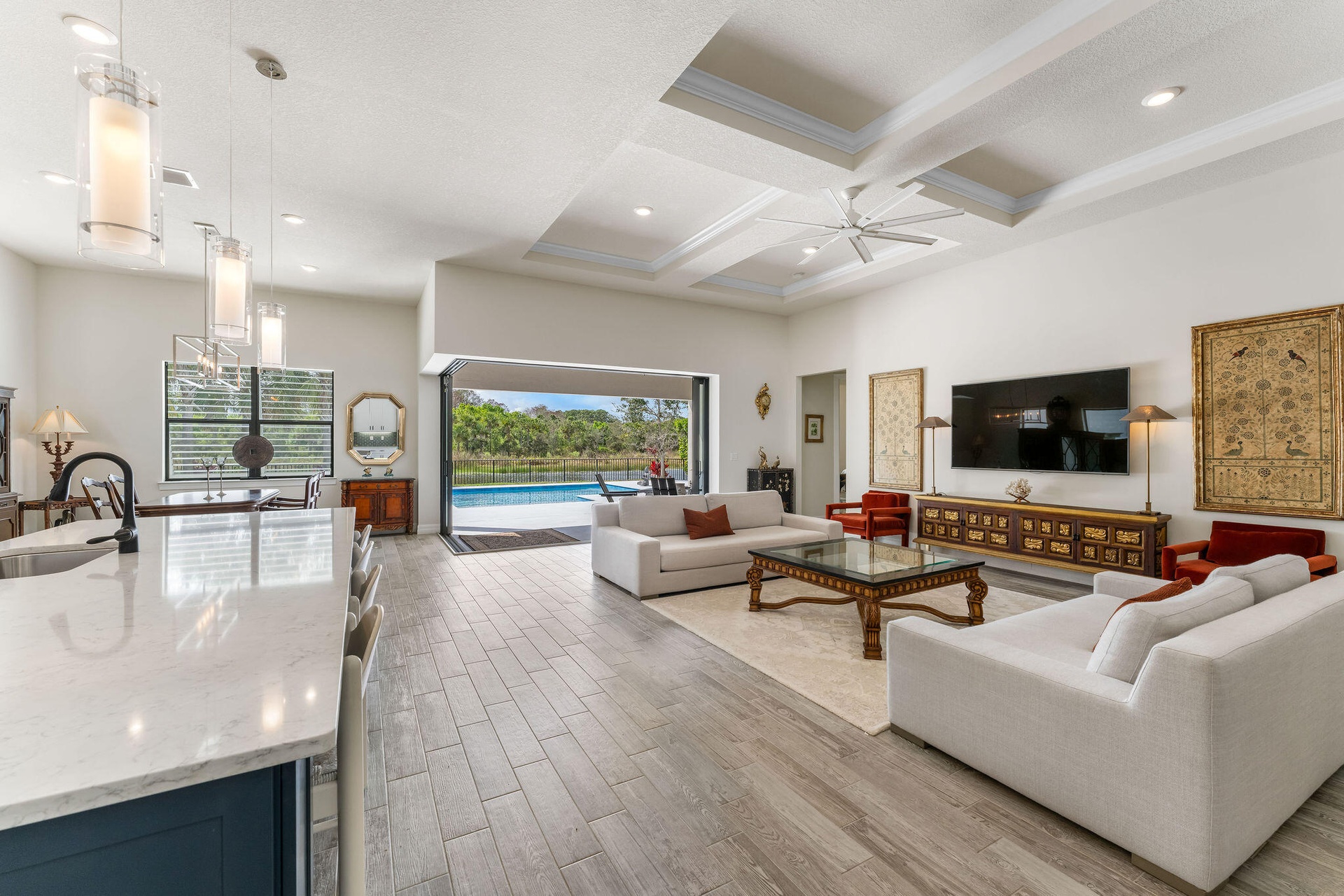 This impeccably maintained Pinnacle model offers a thoughtfully designed floor plan with a neutral color palette to fit any decor, featuring three bedrooms, three bathrooms, and a versatile flex space with glass French doors - perfect for a home office, den, or creative studio. Designed for effortless living and entertaining, the bright open-concept layout highlights a spacious gourmet kitchen with upgraded cabinetry, an expansive center island, adjacent dining area, and a large pantry. Additional features include porcelain tile flooring throughout, custom closets, hurricane-impact windows and doors, zero-corner sliding glass doors, and a climate controlled oversized garage with ample storage space.