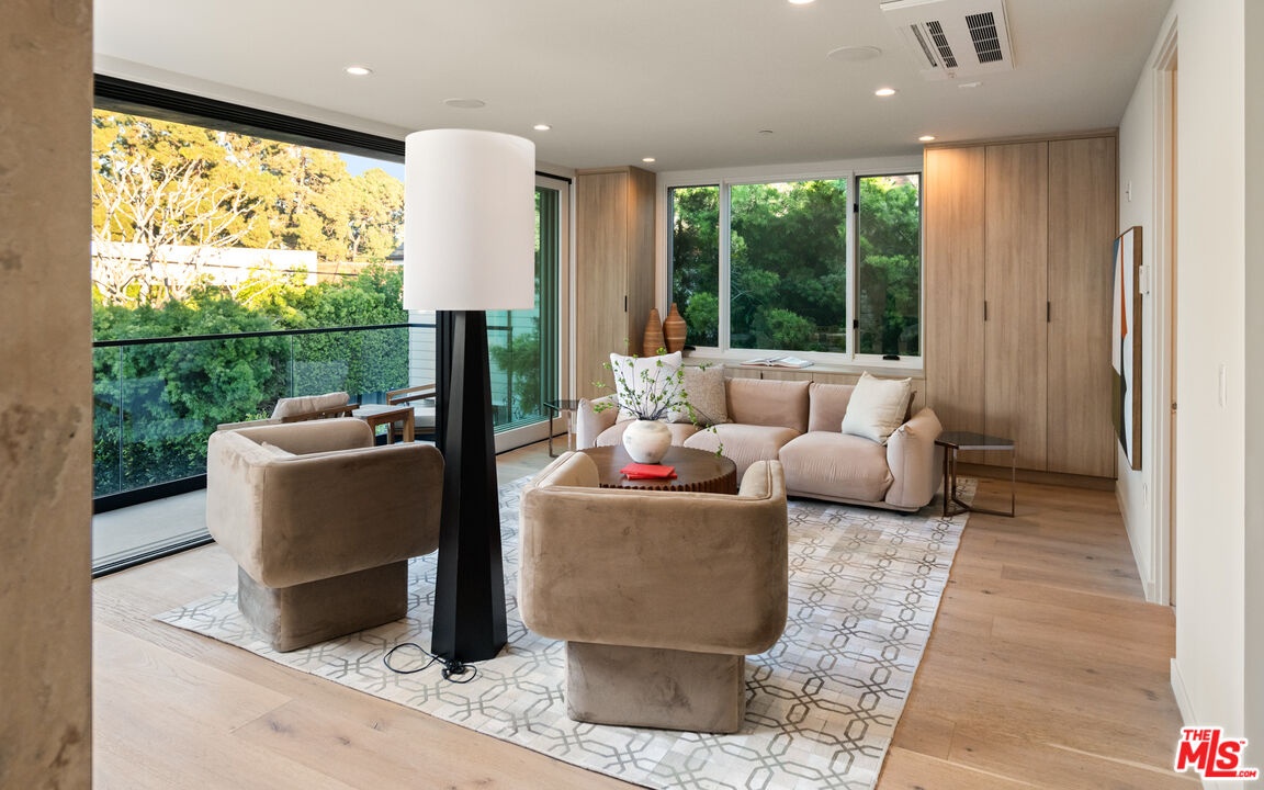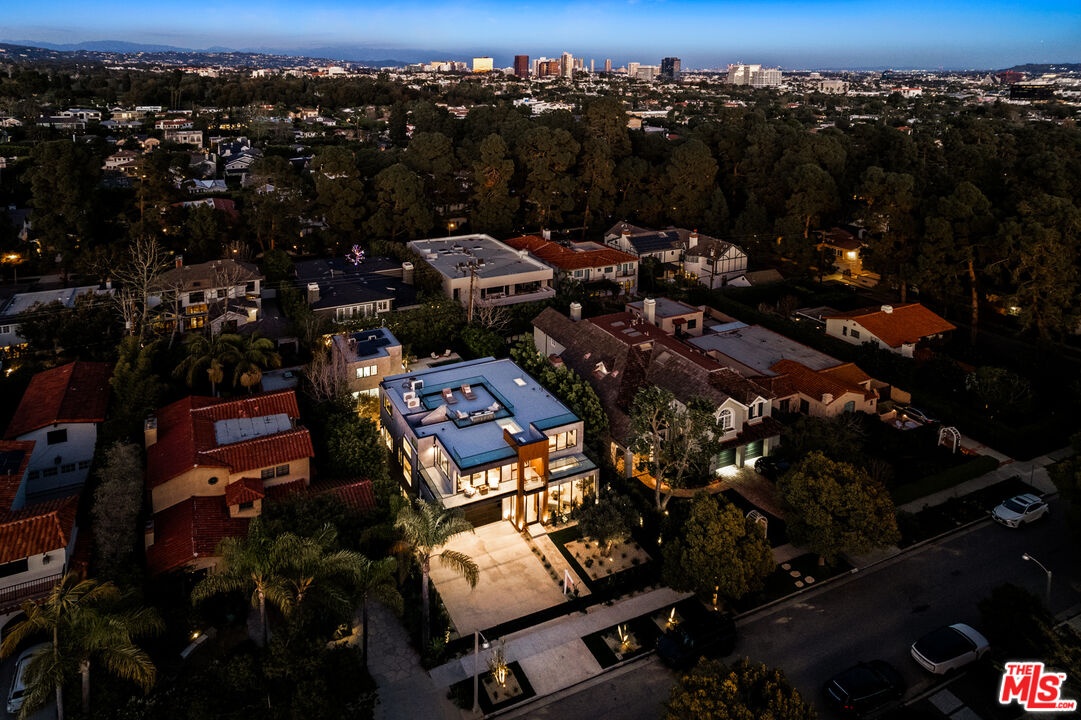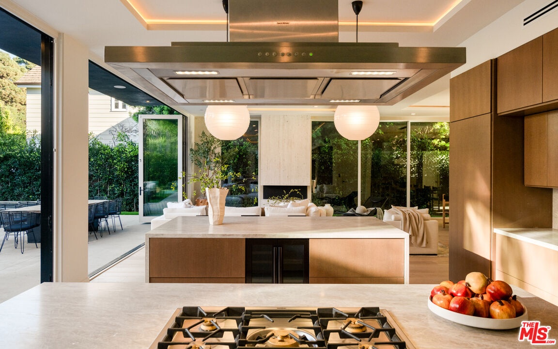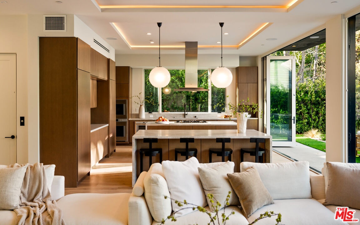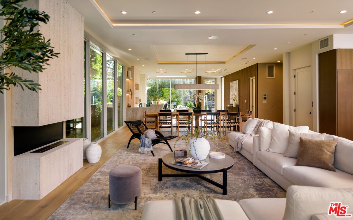 Newly completed following an extensive six-month renovation and offered for the first time, this North of Montana residence pairs disciplined modern architecture with a fully realized amenity program and exceptional indooroutdoor flow. The home spans three thoughtfully planned levels with private elevator access, delivering scale, privacy, and seamless functionality for both daily living and large-format entertaining. The main residence includes five bedrooms and seven bathrooms with expansive open-concept living and dining areas framed by oversized glazing and folding glass walls. Light moves through the home from multiple exposures, enhanced by clean ceiling lines, skylights, and wide-plank flooring that carries a consistent, warm modern palette throughout. At the center, a double-island chef's kitchen is finished in Taj Mahal quartzite with top-tier appliances and integrated storage, opening directly to the primary living spaces and exterior terraces for effortless hosting. Interiors are defined by refined material continuity and architectural restraint, including four limestone fireplaces, a newly executed primary bath, a custom-designed closet, and a redesigned powder room. Large picture windows capture garden views and mature greenery with beautiful olive trees, creating a calm, gallery-like backdrop across living areas and bedrooms. A comprehensive lower level includes a private movie theater, fully equipped gym, wine cellar and meditation room forming a true at-home retreat across multiple levels. The exterior is designed as a direct extension of the interior program: folding glass doors open to landscaped grounds with a pool and spa, an eight-jet water feature, integrated LED lighting, an outdoor fireplace, multiple lounge zones, and grassy play areas. Newly installed landscaping and mature olive trees provide structure and privacy, while the overall plan supports both relaxed daily use and entertaining at scale. Additional highlights include an expansive rooftop deck with ocean views and a 1,050-square-foot two-story ADU complete with two bedrooms, one and a half bathrooms, with living room, kitchen, and in-unit washer/dryer ideal for extended stays, guests, staff, or flexible work-from-home living. A newly completed, design-forward offering in one Santa Monica's most established and sought-after neighborhood.