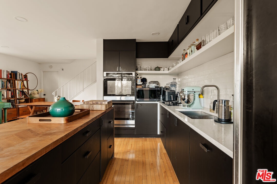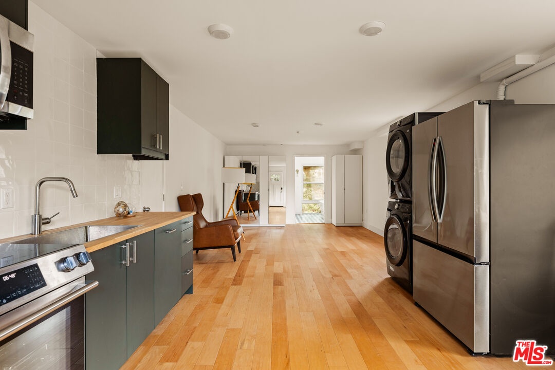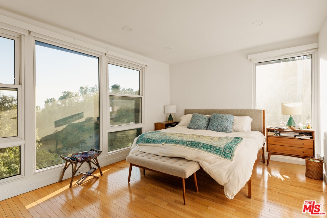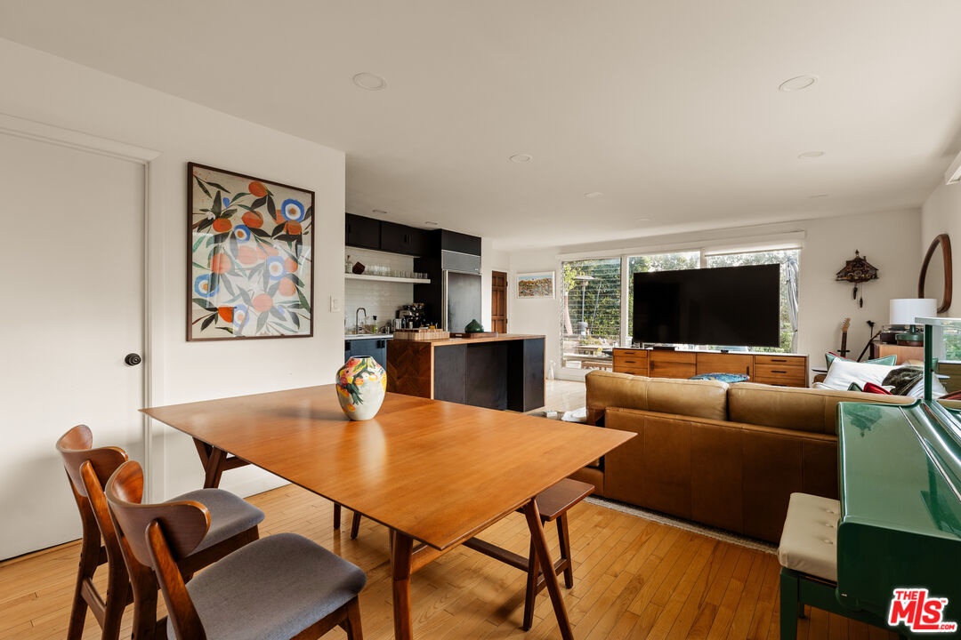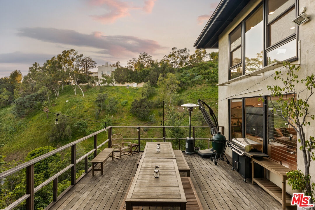 Tucked into the hills just above Beverly Hills, this private retreat is defined by its sweeping canyon views and tranquil surroundings. Set against a backdrop of rolling greenery, the home offers a rare sense of calm and privacy just minutes from the city, yet worlds away in feel. An open-concept layout welcomes you with floor-to-ceiling windows that frame lush canyon views from every room. Natural light pours in, creating an effortless connection between indoor and outdoor living. The spacious living and dining areas flow to a large deck overlooking the canyon, where wide-open views stretch across the hillside and toward downtown in the distance. A flat yard with pristine artificial turf and a mature lemon tree enhances the sense of tranquility, offering the perfect setting for morning coffee, sunset gatherings, or quiet reflection. Upstairs, the primary suite offers a serene vantage point with greenery just beyond the windows and a private en-suite bath. Two additional bedrooms and a well-appointed hall bath complete the level, each space enjoying the calming influence of the hillside landscape. The lower level features a versatile bonus space with its own kitchenette and updated bath ideal for guests, creative pursuits, or a secluded office with inspiring views. An enclosed carport adds further flexibility, easily transforming into a gym, home office, or additional lifestyle space to suit your needs. A dedicated laundry room enhances everyday convenience. Moments from the dining and shopping of Beverly Hills, this canyon-view home offers an exceptional blend of peaceful seclusion and convenient access. It's an inviting hillside sanctuary in one of Southern California's most desirable settings.