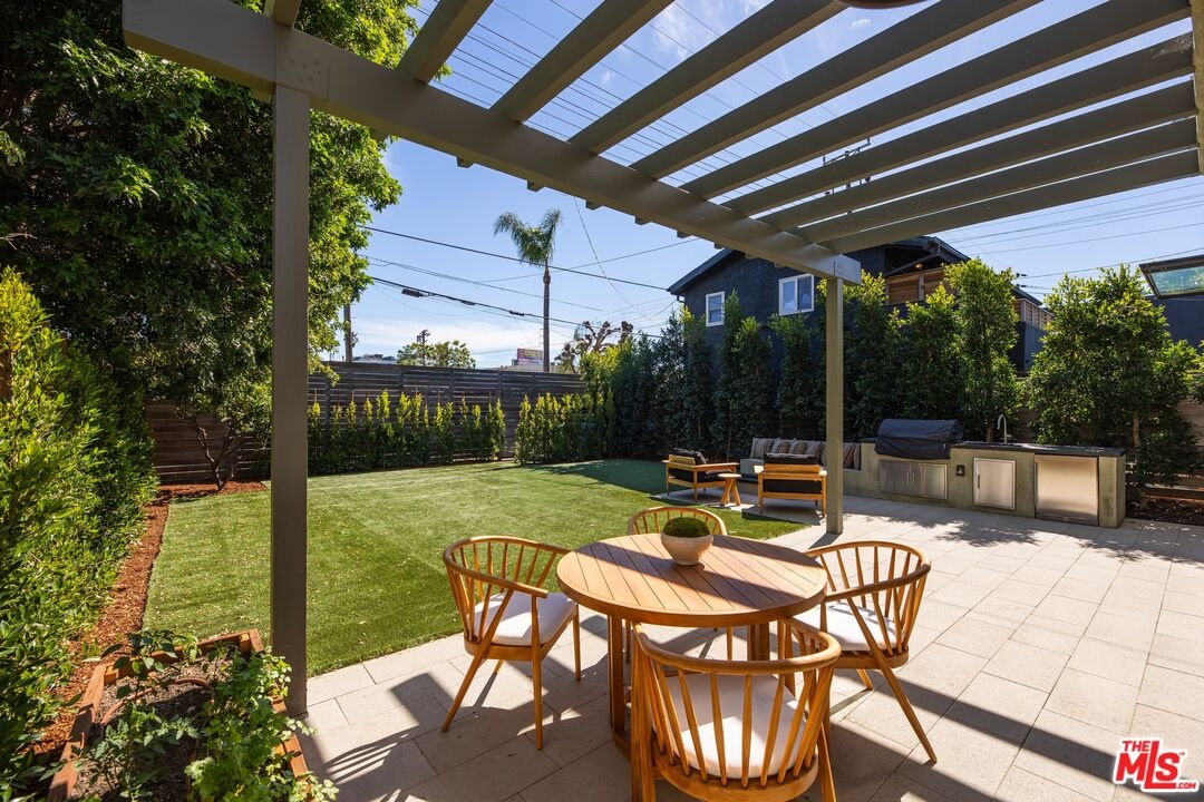 This newly completed, designer-done Venice retreat is private, secure, and centrally located with a substantial yard for entertaining. The home is set back from the street on a generous 6,061 SF lot, spanning 3,315 SF with 4 bedrooms and 4.5 bathrooms. Custom-built by Bespoke Homes, it boasts an organic, transitional interior finish style that encompasses Venice-inspired living. A private gated courtyard with blooming citrus trees and a custom water feature welcomes you inside. The light-filled interior is finished with medium oak wood floors and storage throughout. The main level is anchored by a well-scaled great room with a limestone-surround fireplace, designer-done chef's kitchen, and large sliding glass doors opening to the private backyard. The kitchen features a generous island, custom cabinetry, dual dishwashers and sinks, Taj Mahal stone countertops, Thermador appliances, hidden walk-in pantry, and a large pass-through awning window opening directly to the outdoor bar. A dedicated dining area sits just off the kitchen and living space, alongside a powder room, mudroom-style drop zone, and a main-level en-suite bedroom providing flexibility for guests or a home office. Upstairs, natural light pours in through skylights leading to three bedrooms, all en-suite with vaulted ceilings and walk-in closets. The primary suite features its own custom fireplace, two massive walk-in closets, and a spa-inspired bath with dual vanities, Taj Mahal countertops, soaking tub, and oversized shower. A separate laundry room completes the upper level. Outside, enjoy a full outdoor kitchen, large trellis-covered patio, fire-pit, and expansive yard space with curated landscaping. Secluded from the street with ample parking and a secure setback presence, this exquisite new construction offers a rare sense of privacy just moments from Abbot Kinney, the beach, and the best of Venice living.