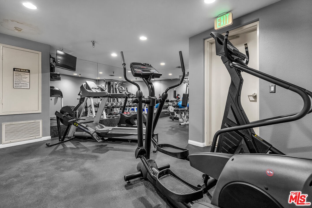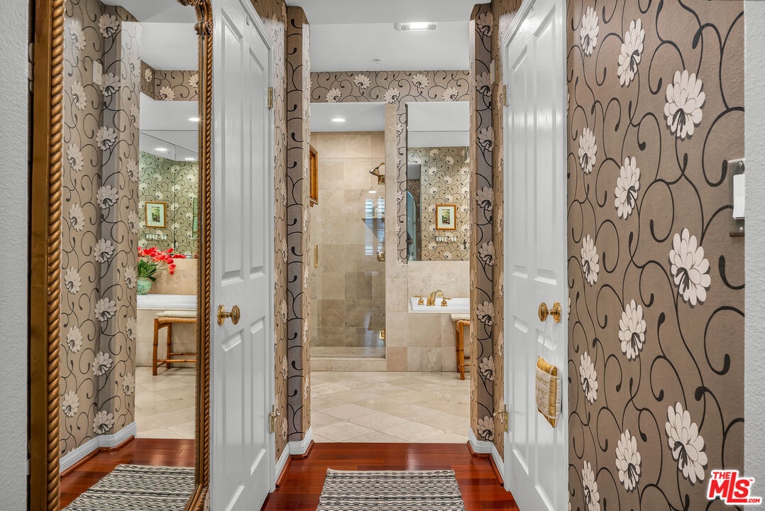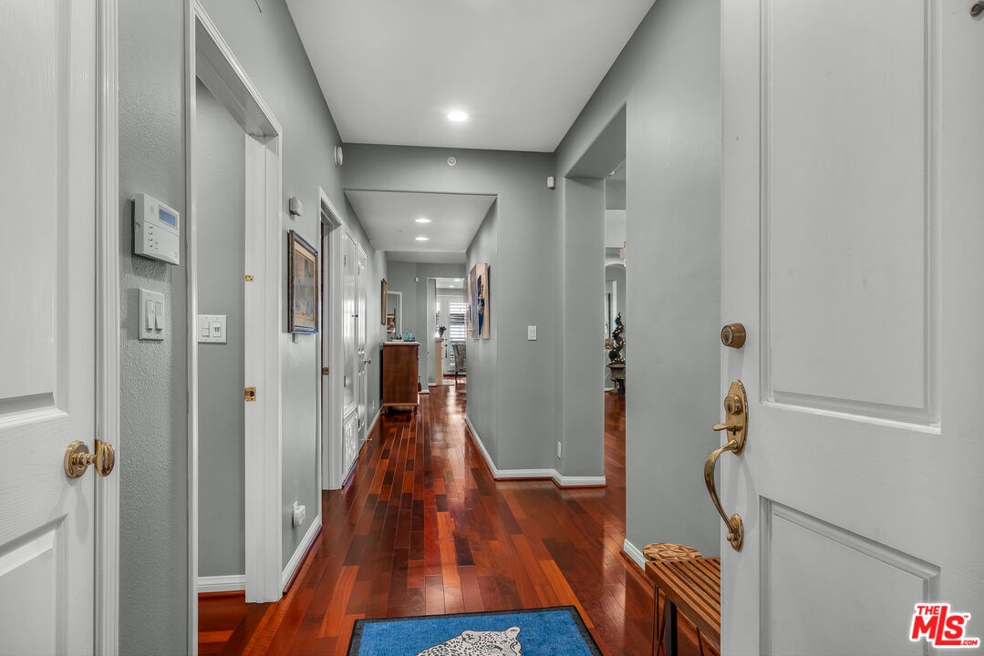 Spacious Brentwood condo that truly feels like home. This beautifully updated residence offers 2 bedrooms 2.5 baths, plus a versatile bonus room ideal for den, office or possible third bedroom. Brazilian cherry hardwood floors, recessed lighting, and plantation shutters run throughout, creating a warm and refined living environment. The redesigned kitchen features a new layout with updated appliances and opens to a formal dining area. The inviting living room includes a newly redesigned fireplace and flows to a private balcony. The oversized primary suite offers dual walk-in closets, a spa-like bath with travertine floors, separate tub and shower, and a custom barn door separating the bedroom and bath. Shade Store motorized shades and remote-controlled ceiling fans add comfort and convenience. Additional upgrades include a top-of-the-line high-power AC and heating system with Nest controls, freshly painted interiors, resurfaced floors, brand new washer and dryer, and updated half bath. All renovations were permitted with the city, including the HVAC system which was inspected and approved. An automatic gas shut-off valve has also been installed for earthquake safety. The second bedroom is generously sized with its own en-suite bath. Additional features include in-unit laundry, two tandem parking spaces with extra storage, and a well-maintained building offering a rooftop pool, fitness room, and ample guest parking. HOA dues also include earthquake insurance for the building and uncommon benefit in many Brentwood properties. Ideally located just moments from Brentwood Village shops, restaurants, and markets.
