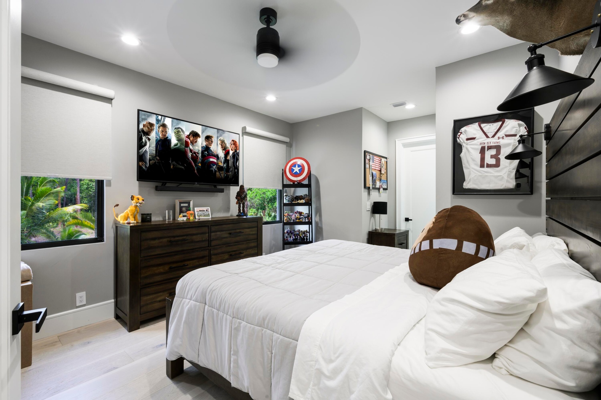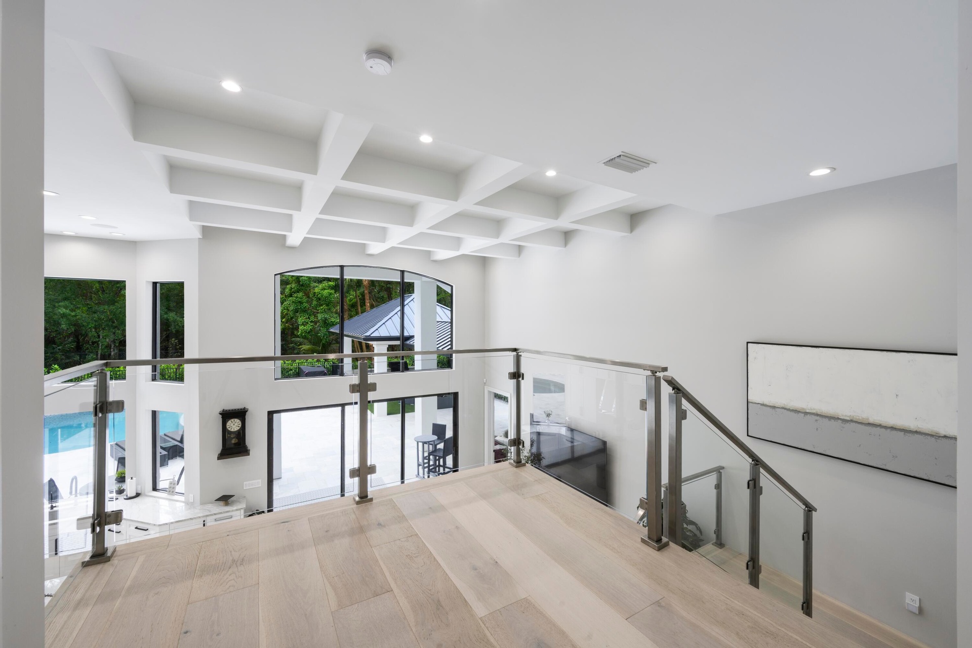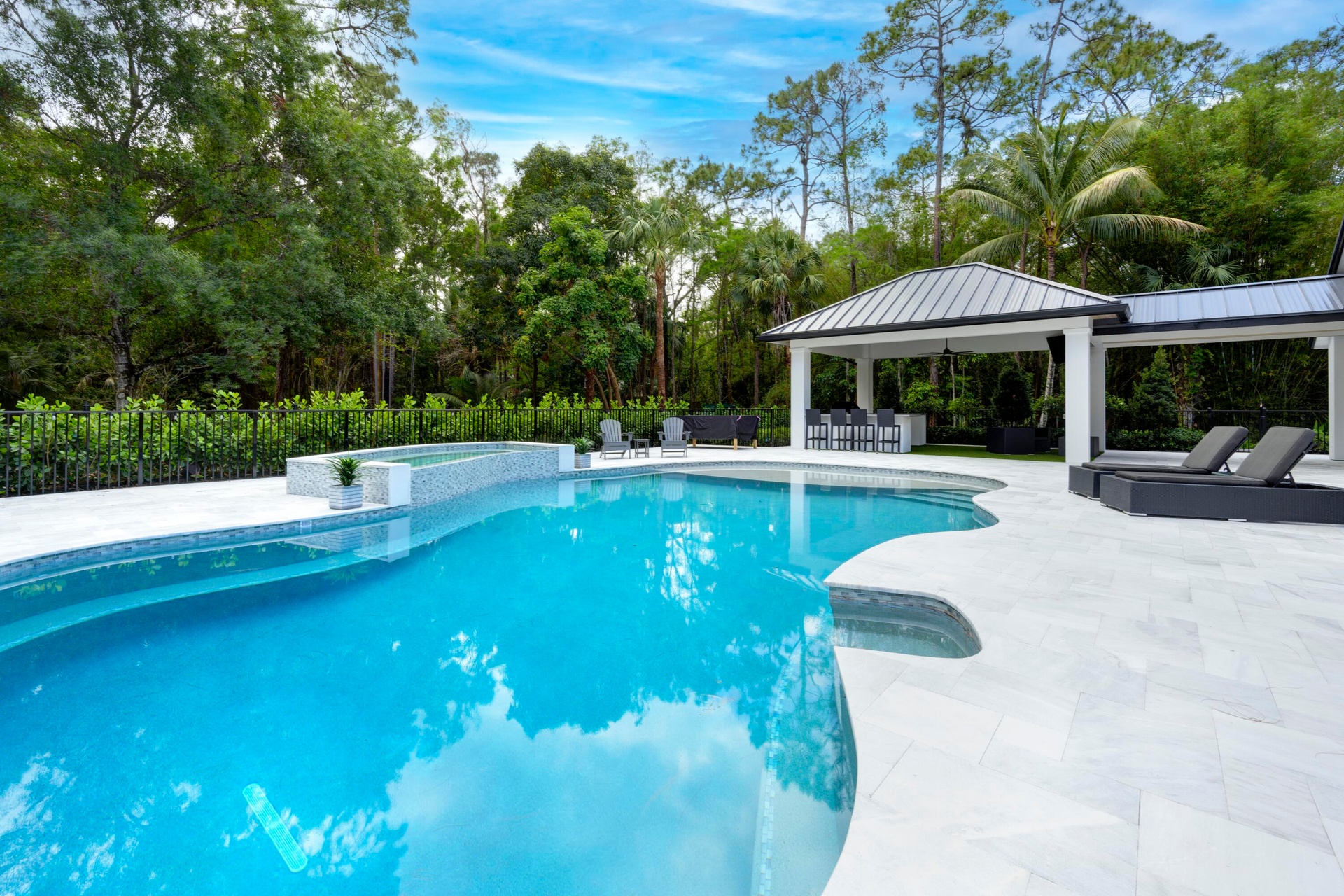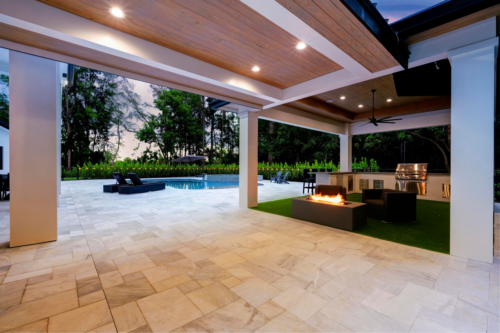 The outdoor living spaces are equally impressive. The outdoor kitchen is built around a 32 inch Alfresco grill with a searing section and rotisserie, a Perlick beverage refrigerator, and a Perlick ice maker. A gas fire pit and mounted outdoor TV make the space ideal for entertaining year round, while a separate cabana with a full bathroom adds convenience right at the pool. The pool area itself is wired with a full audio system featuring two subwoofers and eight speakers, setting the stage for everything from casual afternoons to large gatherings.