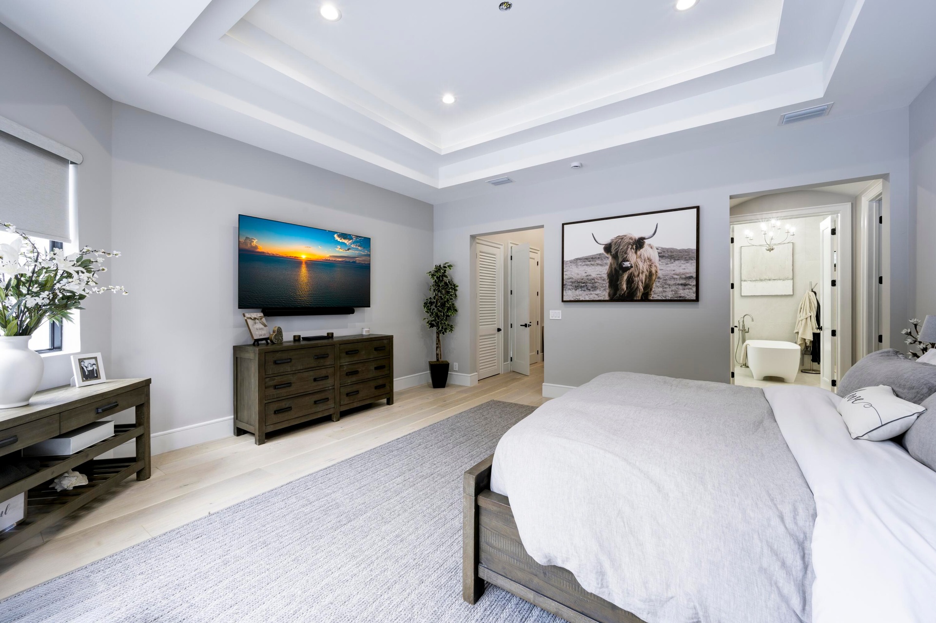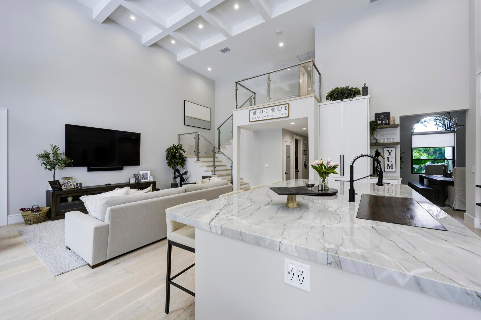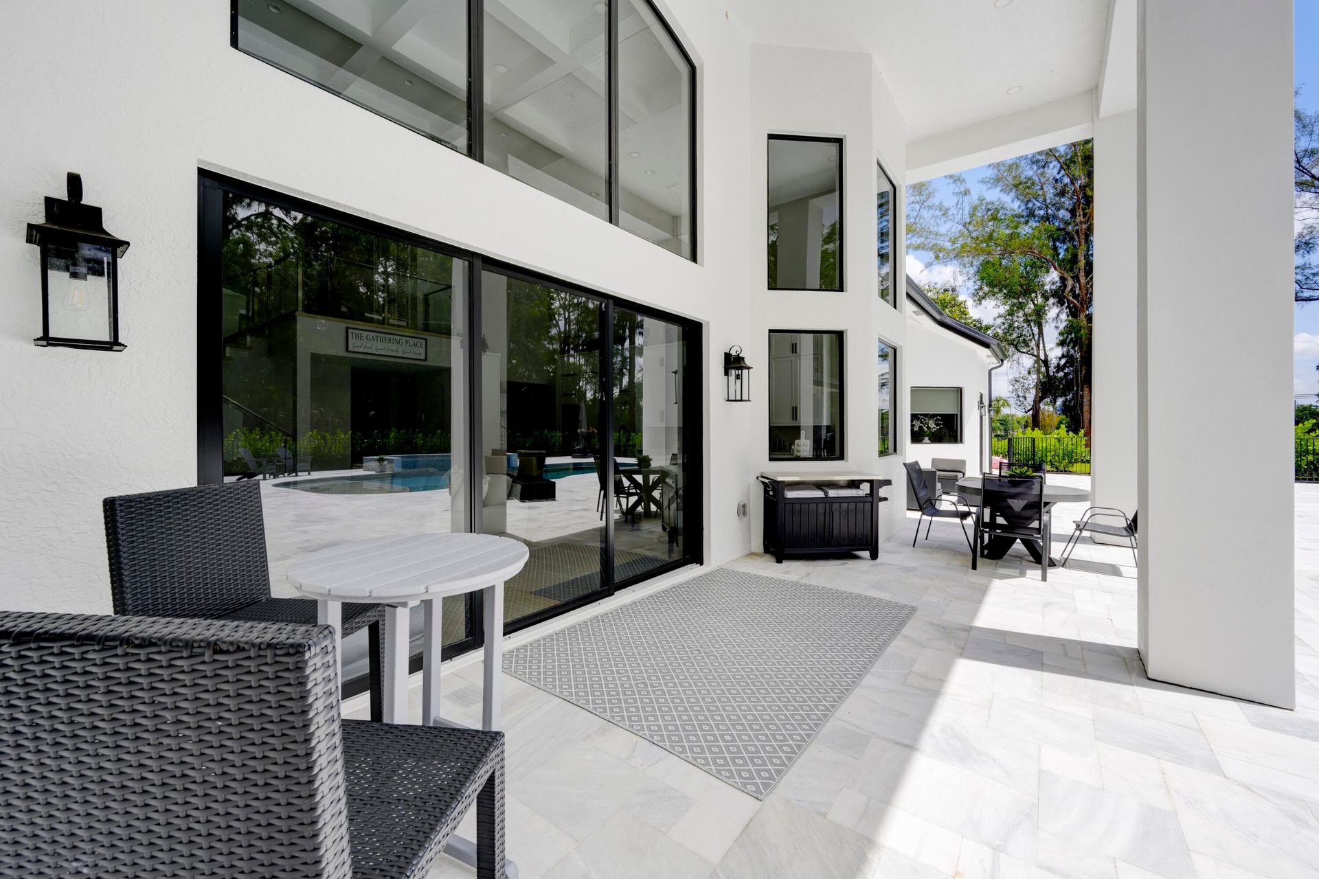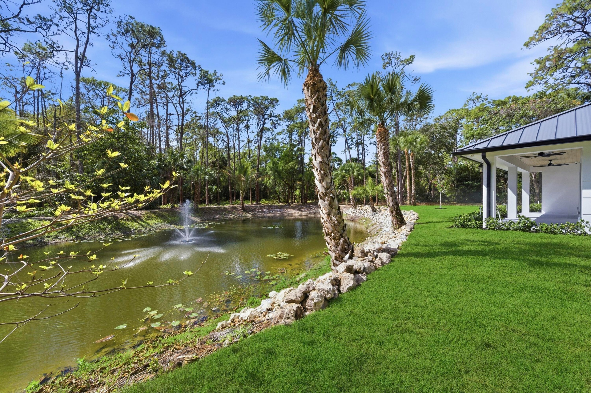 Tucked privately at the rear of the property, the brand new guest house offers a generous living room, a king bedroom with a full bath and washer and dryer, and a kitchenette. Step outside through the slider doors to a covered patio overlooking your own private pond with fountain, a peaceful retreat within the estate.