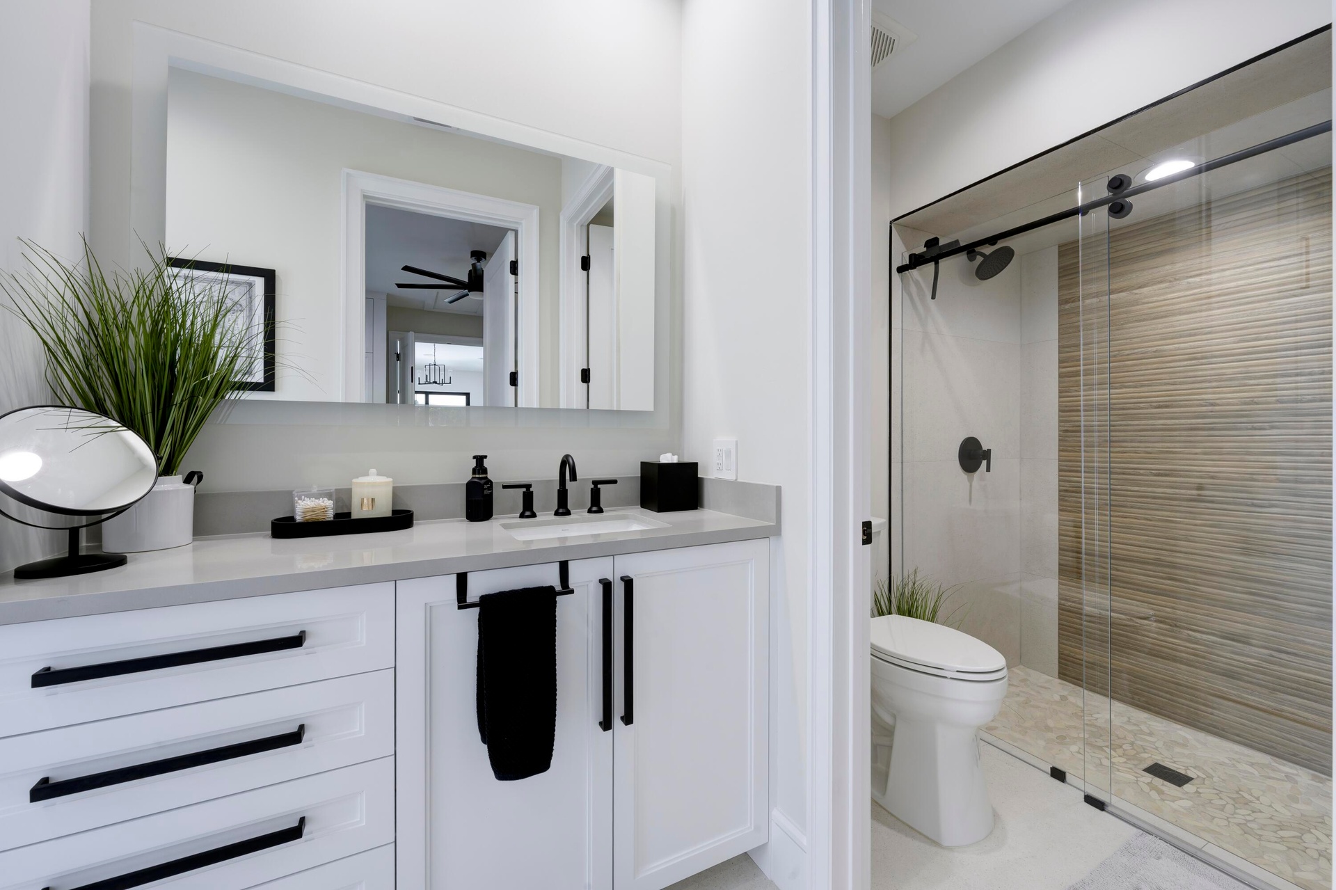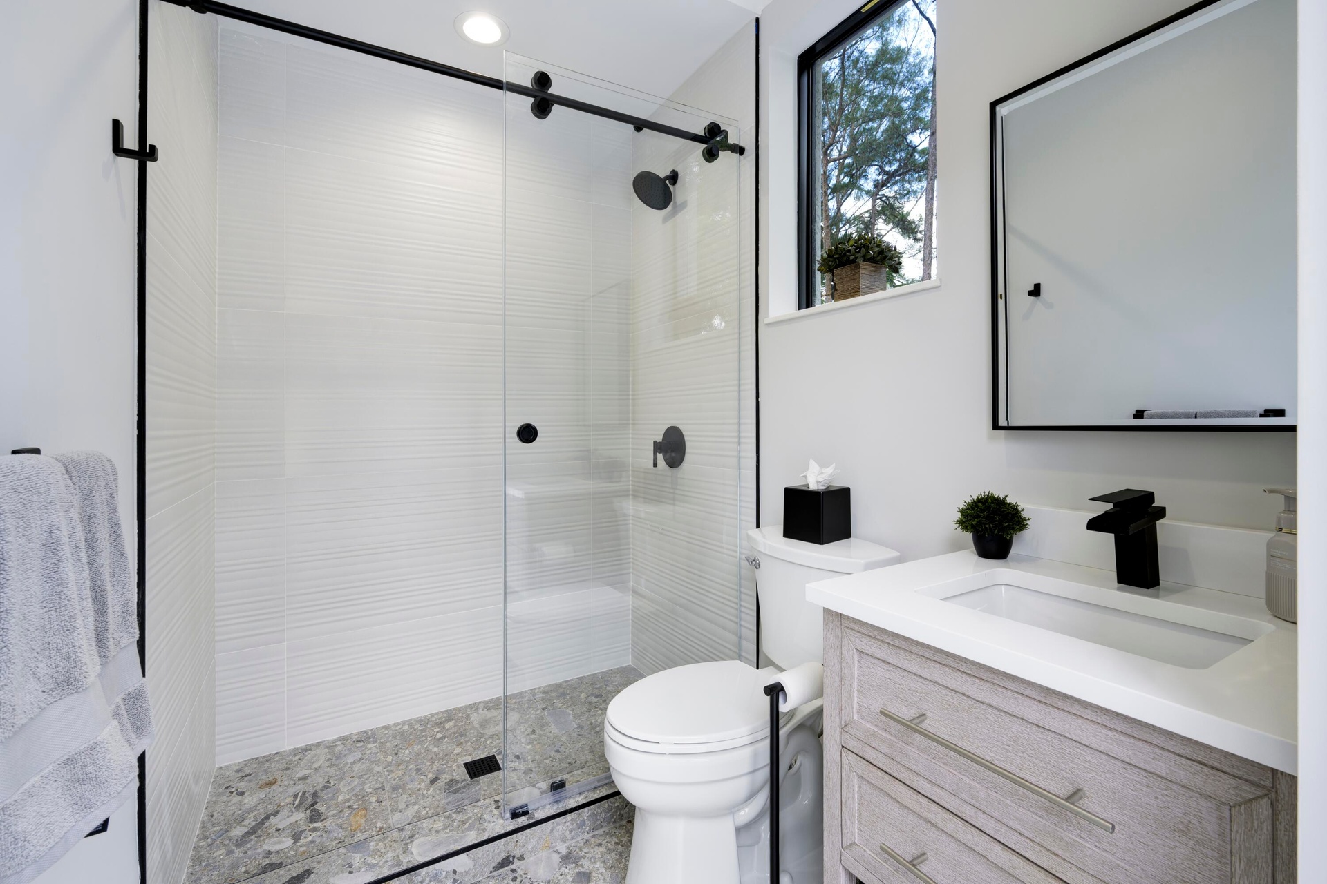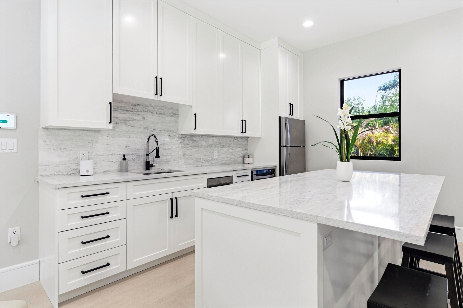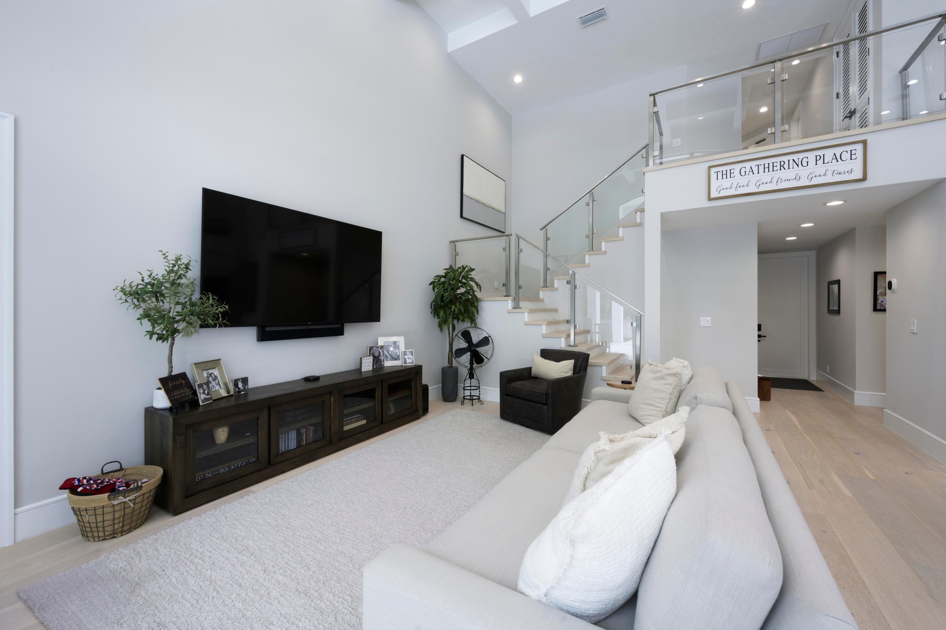 Tucked privately at the rear of the property, the brand new guest house offers a generous living room, a king bedroom with a full bath and washer and dryer, and a kitchenette. Step outside through the slider doors to a covered patio overlooking your own private pond with fountain, a peaceful retreat within the estate.