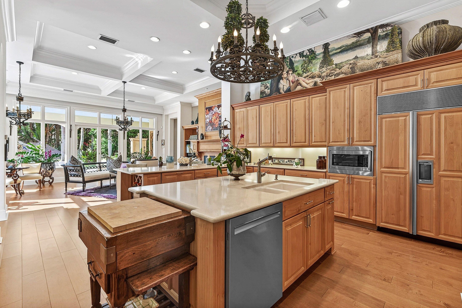 Outdoor living is equally impressive. The expansive backyard retreat showcases an oversized heated pool and spa, surrounded by marble stone pool decking, lush tropical landscaping, and a fully equipped summer kitchen, ideal for year-round entertaining. The home is further enhanced with hurricane impact windows throughout, a recently replaced tile roof, and new exterior paint, ensuring both beauty and peace of mind.
