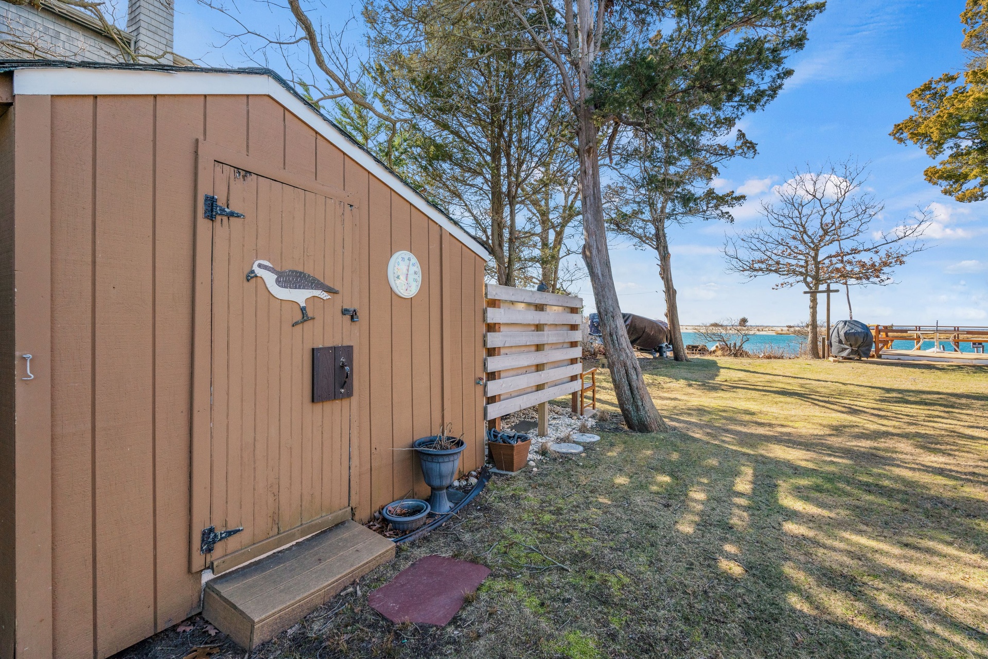 The home features a sunny living room with fireplace that overlooks the water, a large kitchen and a bedroom and full bath on the ground floor. Upstairs are two bedrooms that share a bath, one of which has a private deck for magnificent sunsets and water views. Outside you will find a private dock and a dining deck that allows you to eat right on the cove while taking in the natural beauty that surrounds you. Launch your boat, take a swim or grab a chair and stroll down to Circle Beach for the day.