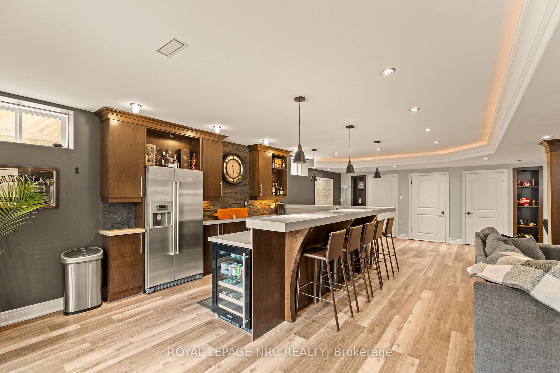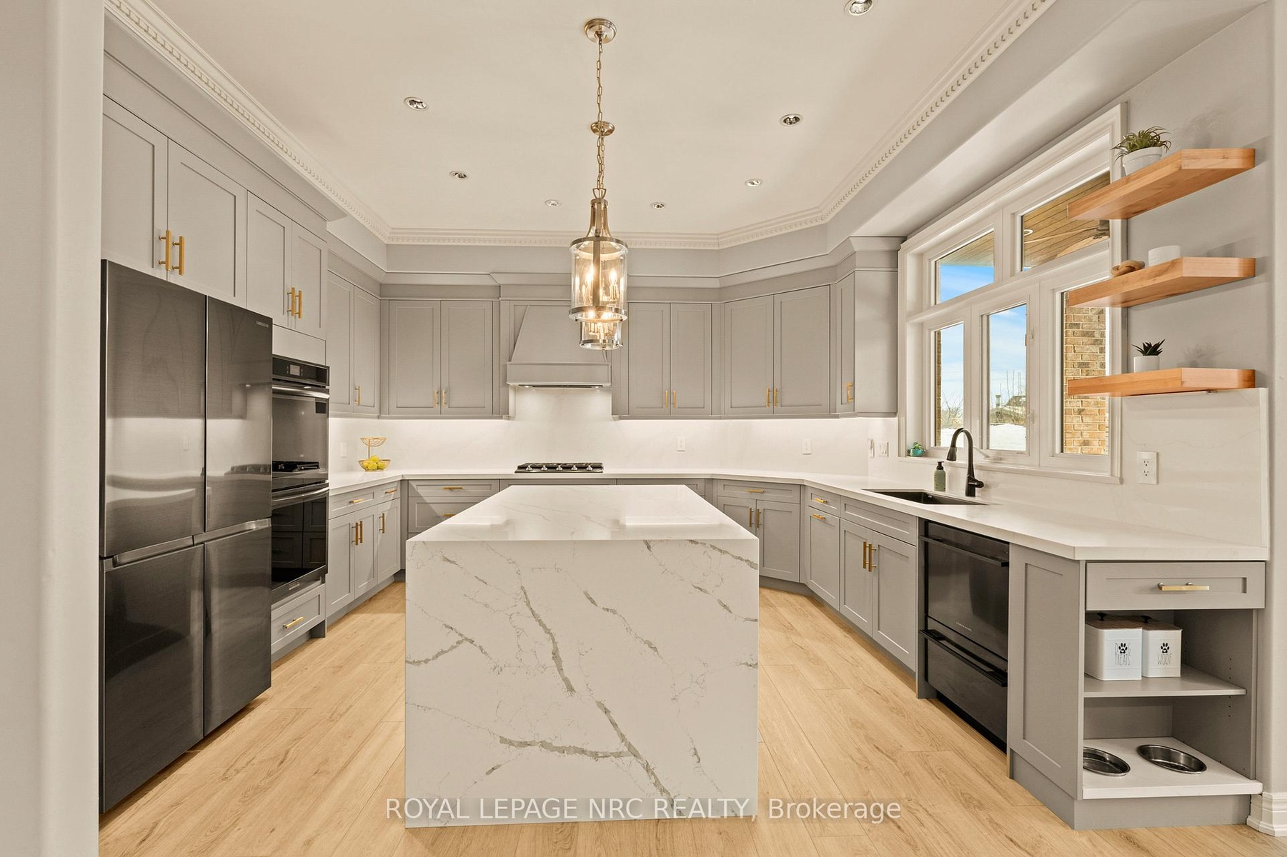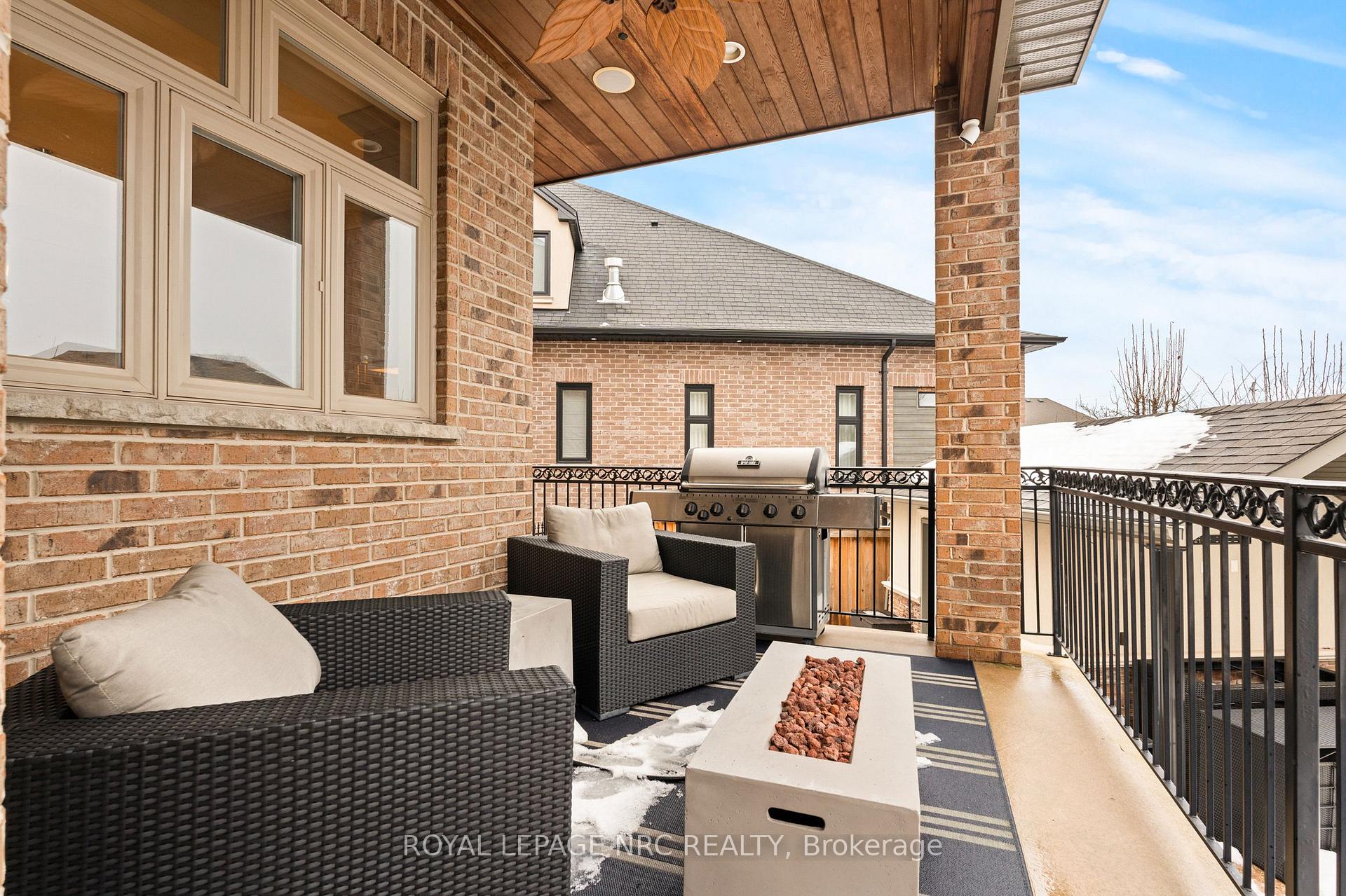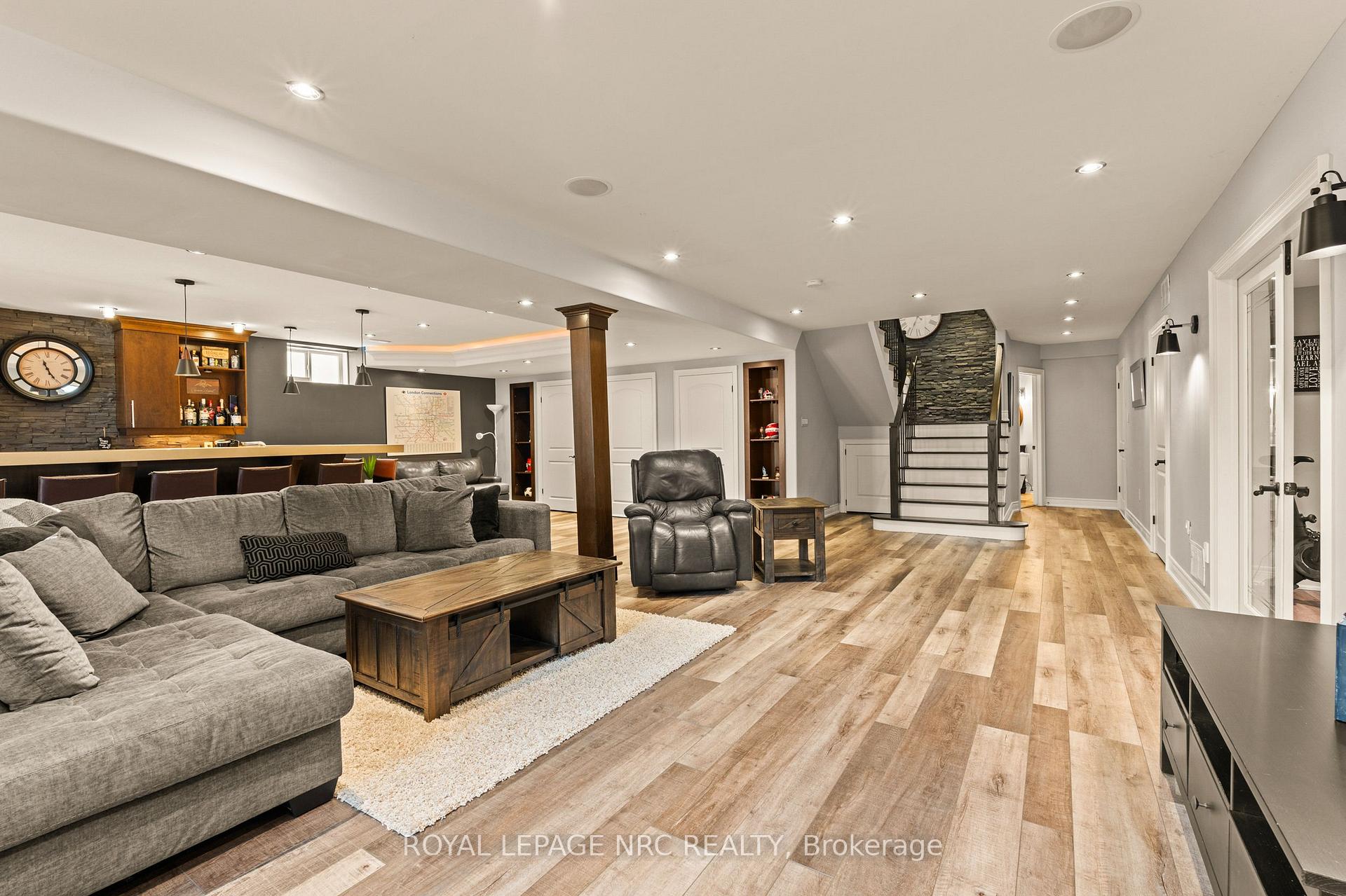 Welcome to a truly exceptional home in one of the most sought after neighborhoods in Grimsby, showcasing a generous open-concept main floor, thoughtful design, high-end upgrades, and impressive outdoor entertaining space. Close to all conveniences and great schools! From the moment you arrive, the exposed aggregate driveway and striking brick-and-stucco exterior set the tone. Step inside to a breathtaking two-storey front entrance with a floor-to-ceiling accent wall. At the heart of the home is a show-stopping chef's kitchen featuring quartz countertops, premium Kitchencraft cabinetry, built-in appliances, a double oven, and custom built-ins - perfectly designed for both entertaining and everyday living. The open-concept layout flows into spacious living areas, 10 foot high ceilings, highlighted by three gas fireplaces (one on the lower level). Upstairs offers four generously sized bedrooms, including a luxurious primary retreat with walk-out balcony and spa-inspired ensuite. Convenient upper-level laundry adds everyday practicality, while a second laundry area is located in the finished basement. The fully finished lower level (with spray foam insulation) expands your living space with a large family room, wet bar, additional bedroom, and a 3-piece bath, separate entrance - ideal for guests, teens, or multigenerational living. Step outside to your private backyard oasis: a saltwater pool with waterfall feature, new pool pump and motor ,fresh liner, and a brand-new Cal Spa hot tub. Entertain all summer long with dual gas BBQ hookups, ceiling speakers outdoors, and a rare outdoor bathroom complete with shower and vanity. With 3,885 sq ft above grade (with additional finished lower level), a double car garage plus parking for four, this is a rare opportunity to own a move-in-ready home that truly delivers on comfort and everyday luxury