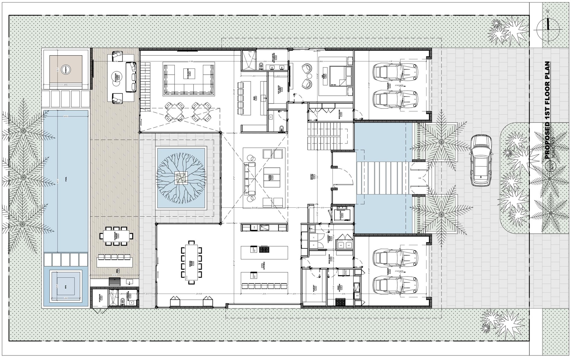 The open-concept design emphasizes effortless flow and a connection with nature. The layout wraps around the central courtyard, flooding the interior with natural light through floor-to-ceiling windows. The formal living room, with soaring ceilings, opens seamlessly to expansive entertaining spaces, including a two-story club room with a bar and wine room.