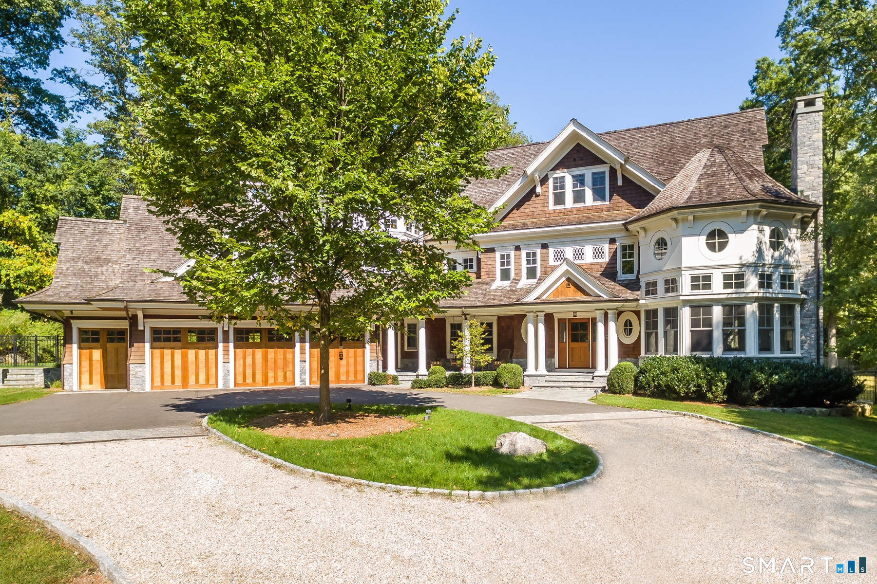 Handsomely set on two private, resort like acres, this timeless Nantucket style residence offers the feel of a secluded family compound.