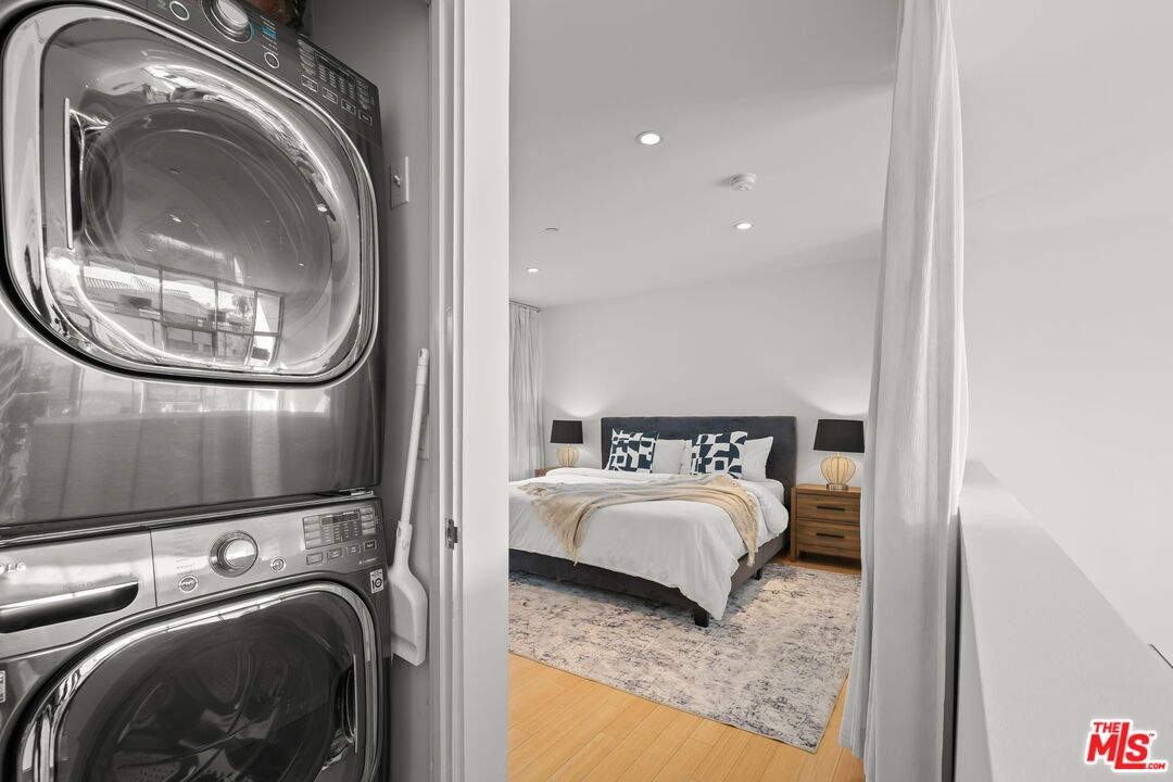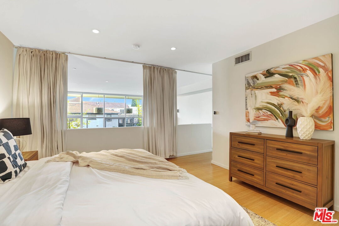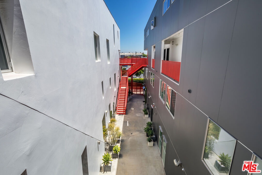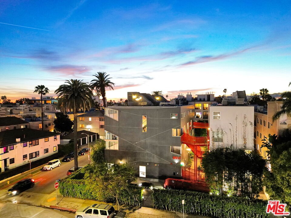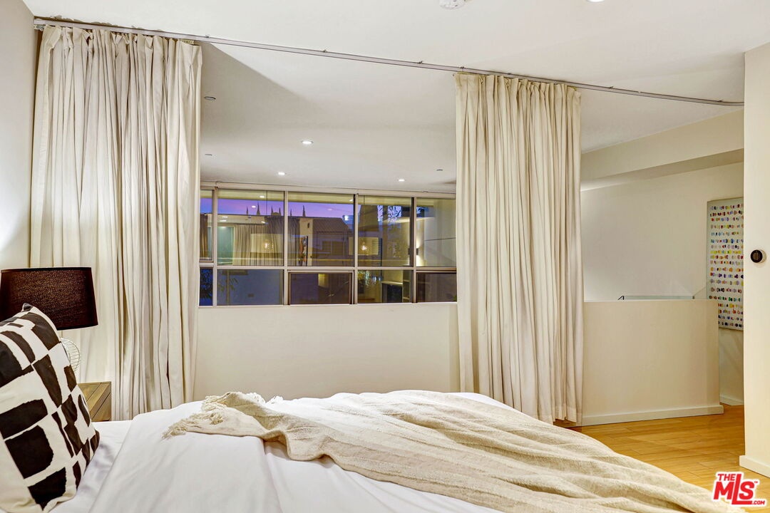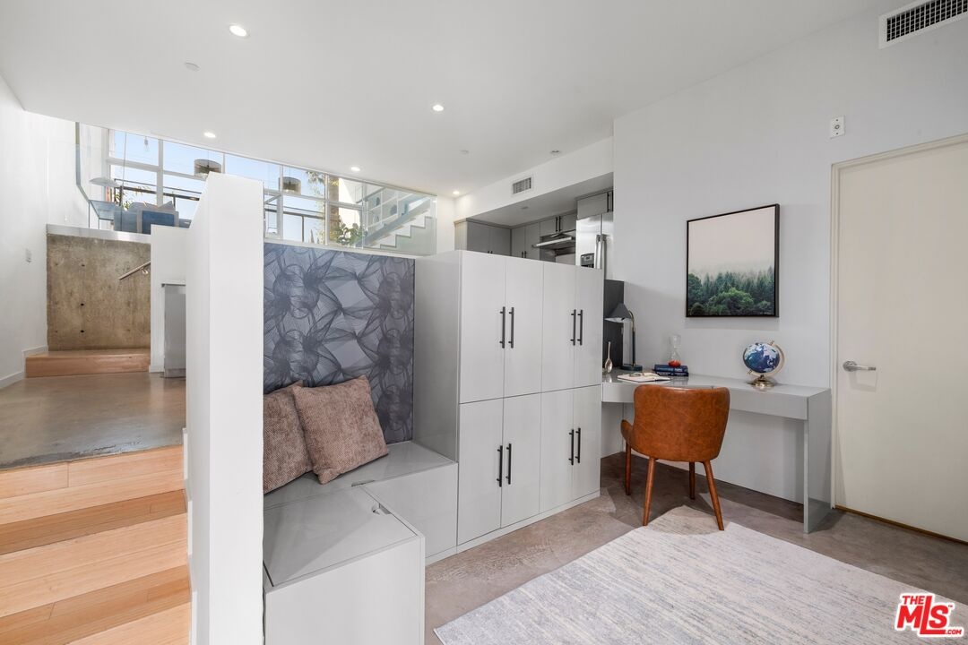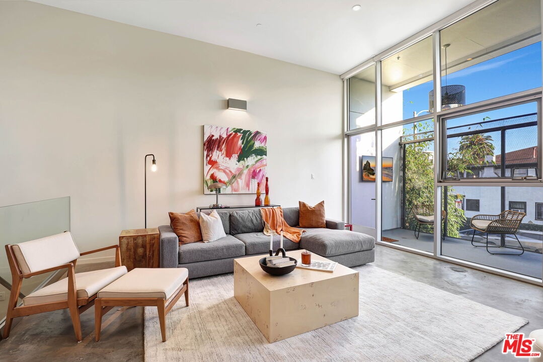 Sited in Hollywood's creative corridor, Loft #4 is a striking architectural residence within the design-forward Wilcox Avenue Lofts by Lorcan O'Herlihy. Defined by vertical scale and seamless indoor-outdoor flow, this multi-level loft delivers volume, intention, and flexibility. The loft's main level is anchored by dramatic two-story ceilings in the living area, where expansive industrial windows flood the space with natural light and emphasize the residence's architectural lines. The living room opens to a substantial private balcony ideal for outdoor dining, lounging, and entertaining, creating a true extension of the interior living space. An eat-in kitchen offers generous counter space and storage, designed for both everyday functionality and gathering. A dedicated downstairs office with built-ins provides a refined and highly functional work-from-home environment while maintaining the openness of the overall design. A full bathroom with a tub/shower combo completes the lower levels. Upstairs, loft #4's primary suite is generously scaled and privately positioned, featuring ample closet space and a well-appointed bathroom with a step-in shower. The upper level captures the drama of the unit's architecture while offering a comfortable retreat above its main living areas. In-unit laundry is also here. Additional features include automatic blinds, custom-built wall unit, and built-in storage. Secure access and 2 assigned parking spaces (tandem) enhance convenience. Underground guest parking is also available on a first-come first-serve basis. Moments from major studios, Netflix, Paramount, and the dining, retail, and nightlife that define central Hollywood, Loft #4 offers architect-driven design and elevated urban living in one of Los Angeles' most desirable locations. HOA dues are $785/mo. and include earthquake insurance.