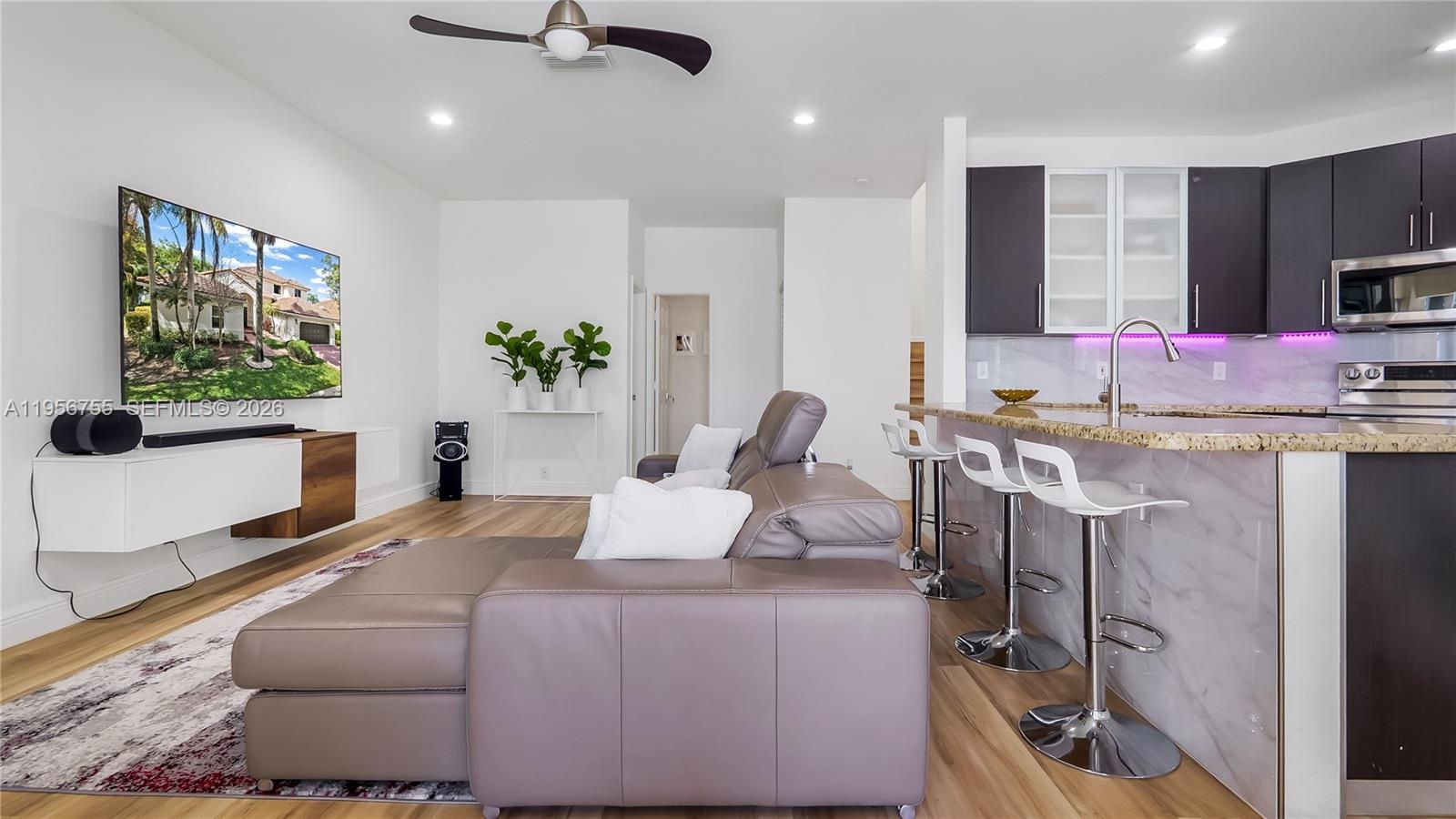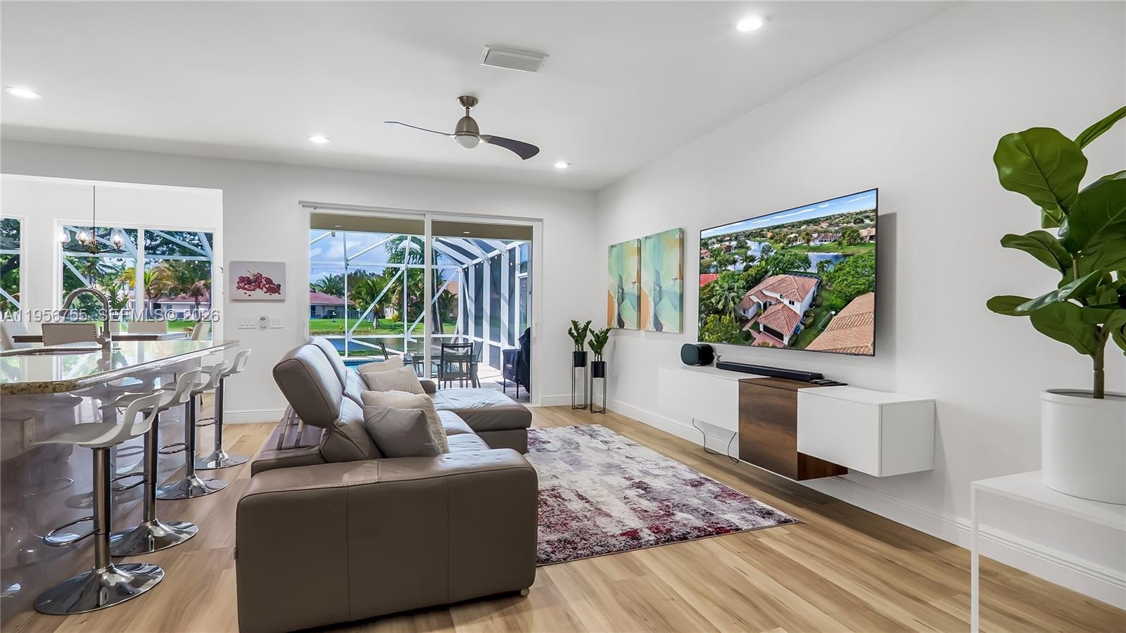 This beautifully updated 5-bedroom, 3-bath residence offers an ideal layout with the highly sought-after primary suite conveniently located on the first floor. Designed for both comfort and functionality, the home provides generous living spaces, perfect for everyday living and entertaining alike. Step inside and immediately notice the new flooring throughout and the bright, open feel enhanced by natural light. The modern kitchen integrates seamlessly with the main living areas, while the renovated bathrooms feature clean, contemporary finishes and thoughtful upgrades. Enjoy true South Florida living in your private backyard oasis. The sparkling pool overlooks a serene lake view, creating the perfect backdrop for relaxing evenings and weekend gatherings. Major improvements include a newer roof (Dec 2016), newer A/C system (2021), full impact windows throughout (2026) for security and efficiency, and a freshly painted exterior (2026) that enhances curb appeal and gives the home a crisp, move-in-ready feel. Located in a desirable gated community with access to top-rated schools, parks, shopping, and dining, this property offers the complete package of style, location, and peace of mind.
