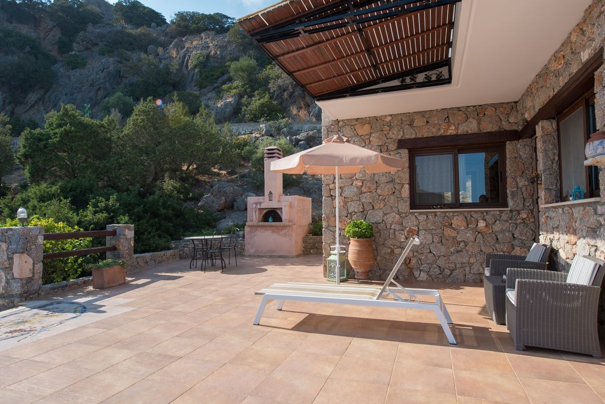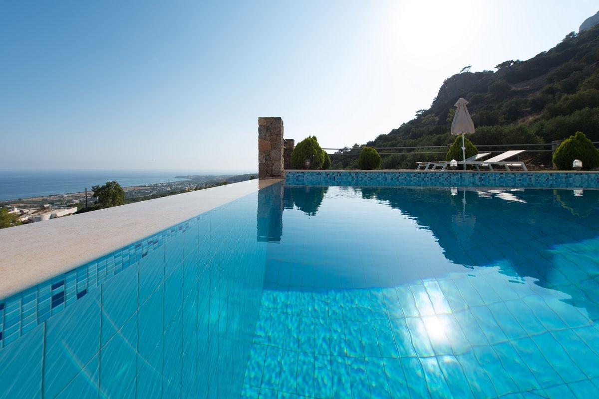 Guests can relax under the Mediterranean sun and enjoy the peaceful surroundings after a refreshing swim in the swimming pool while admiring the panoramic sea view.