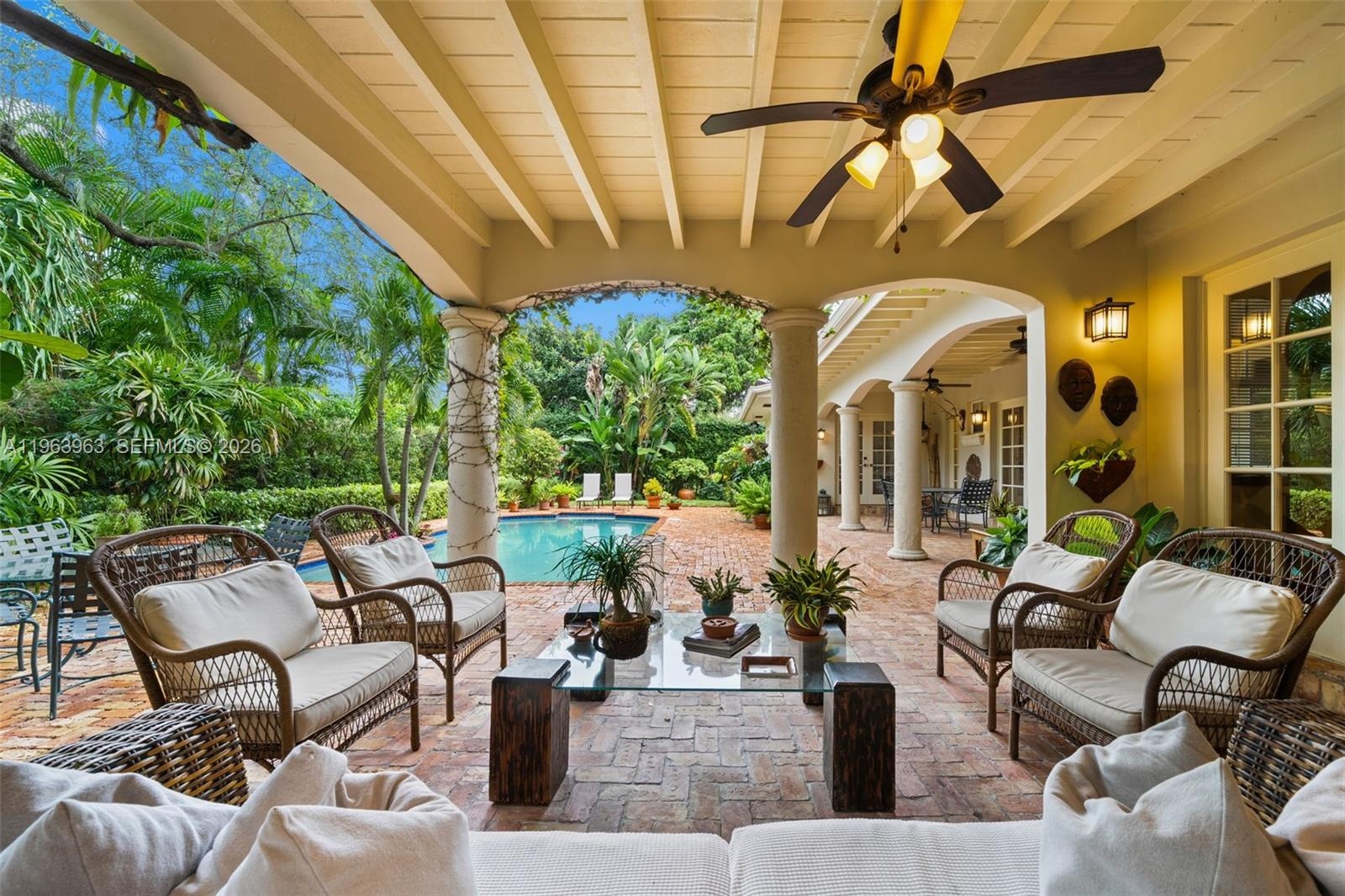Beautifully maintained and thoughtfully designed, this inviting residence offers soaring double-height ceilings in the family room, creating a bright and open ambiance, while a fireplace anchors the living room with warmth and charm. Rich wood and marble floors run throughout, blending timeless elegance with everyday comfort. The home has 4 bedrooms, The first floor has 3 spacious bedrooms and 3 full bathrooms, while the private upstairs primary suite serves as a serene retreat complete with a sitting area, spa-inspired bath, and generous walk-in closets. Designed for effortless indoor-outdoor living, the brick patio and covered terrace overlook the pool, creating an ideal setting for entertaining. Speakers in the main living areas and outdoors enhance the experience. Additional highlights include double-pane windows, a generator, built-in garage workstation, exterior storage closet, and sprinkler system. A refined and functional home ready for its next chapter.