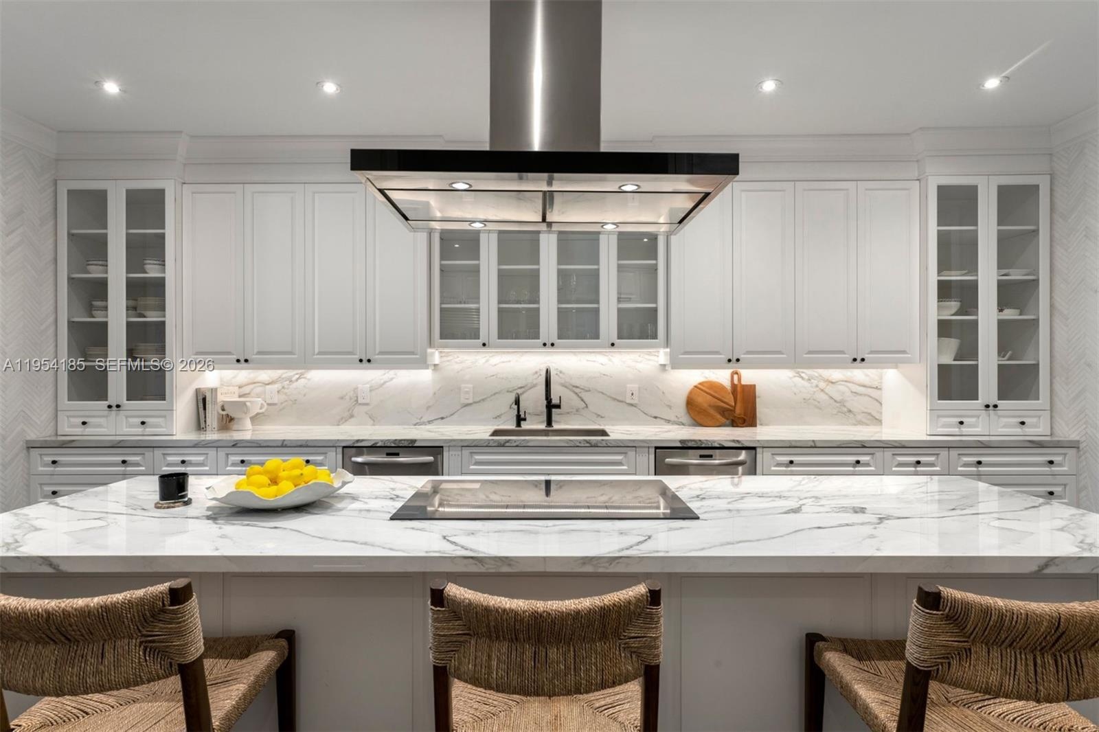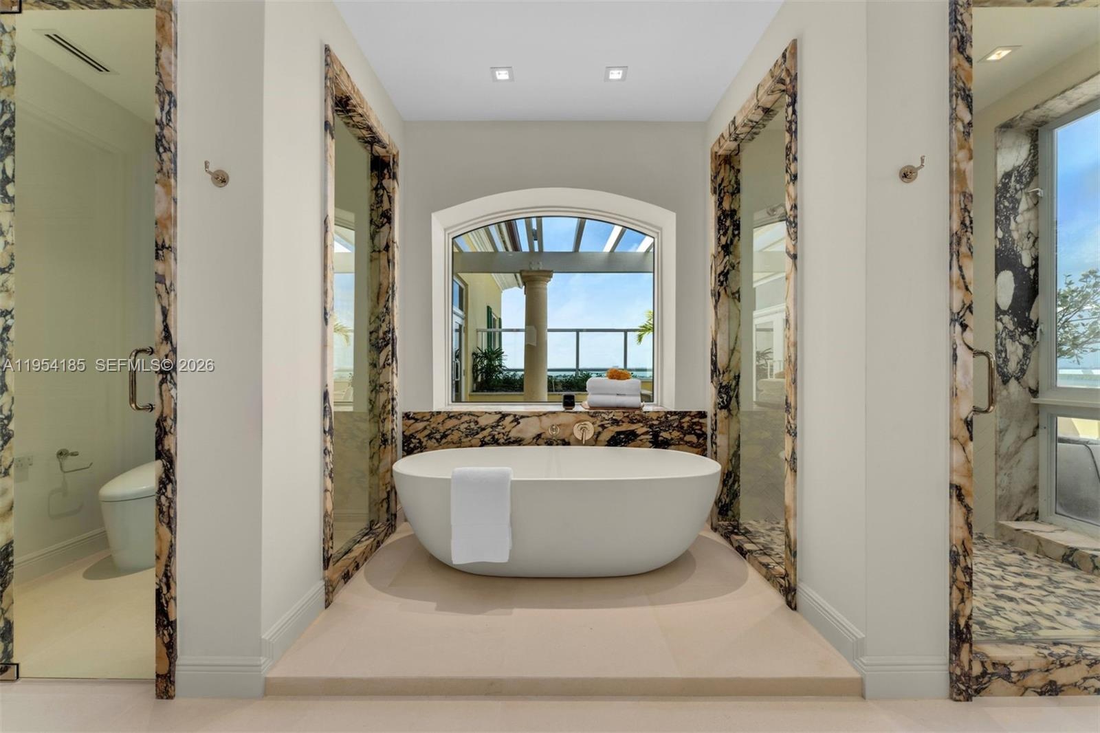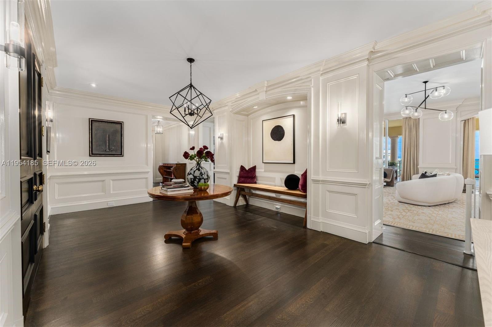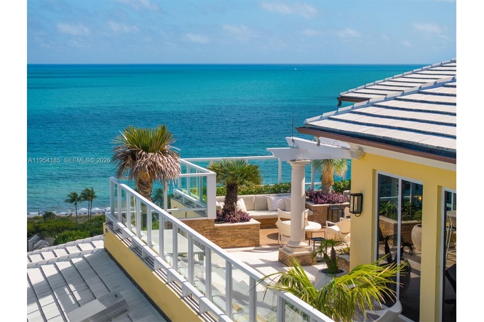 High above the turquoise waters of Key Biscayne rises a penthouse that simply cannot be replicated. Once featured in Architectural Digest, this legendary corner residence at Grand Bay is a statement of scale, design, and presence. From sunrise over the Atlantic to glittering sunsets across Biscayne Bay and the Miami skyline, the views are cinematic in every direction, offering endless blue water, golden light, and exceptional privacy. Spanning an extraordinary 8,435 square feet under air and 2,825 square feet of terraces, totaling 11,260 square feet as per the developer’s floor plan, the residence is defined by soaring 12-foot ceilings and grand proportions throughout. A dramatic foyer leads to a spectacular Grand Room designed for both intimate living and large-scale entertaining. The formal dining room is separate and elegant, while the completely remodeled kitchen and family room provide comfort and functionality. The fully renovated private library and custom bar enhance the home’s entertaining appeal. The primary suite is serene and expansive. All the bathrooms have just been completely remodeled, offering a fresh spa-inspired experience finished to today’s highest standards. Four (4) additional en-suite bedrooms ensure comfort and privacy. The terraces offer expansive outdoor living in the sky, perfect for sunrise mornings and sunset evenings overlooking the water and skyline. This is not simply a penthouse. It is a landmark residence, rare and impossible to duplicate.