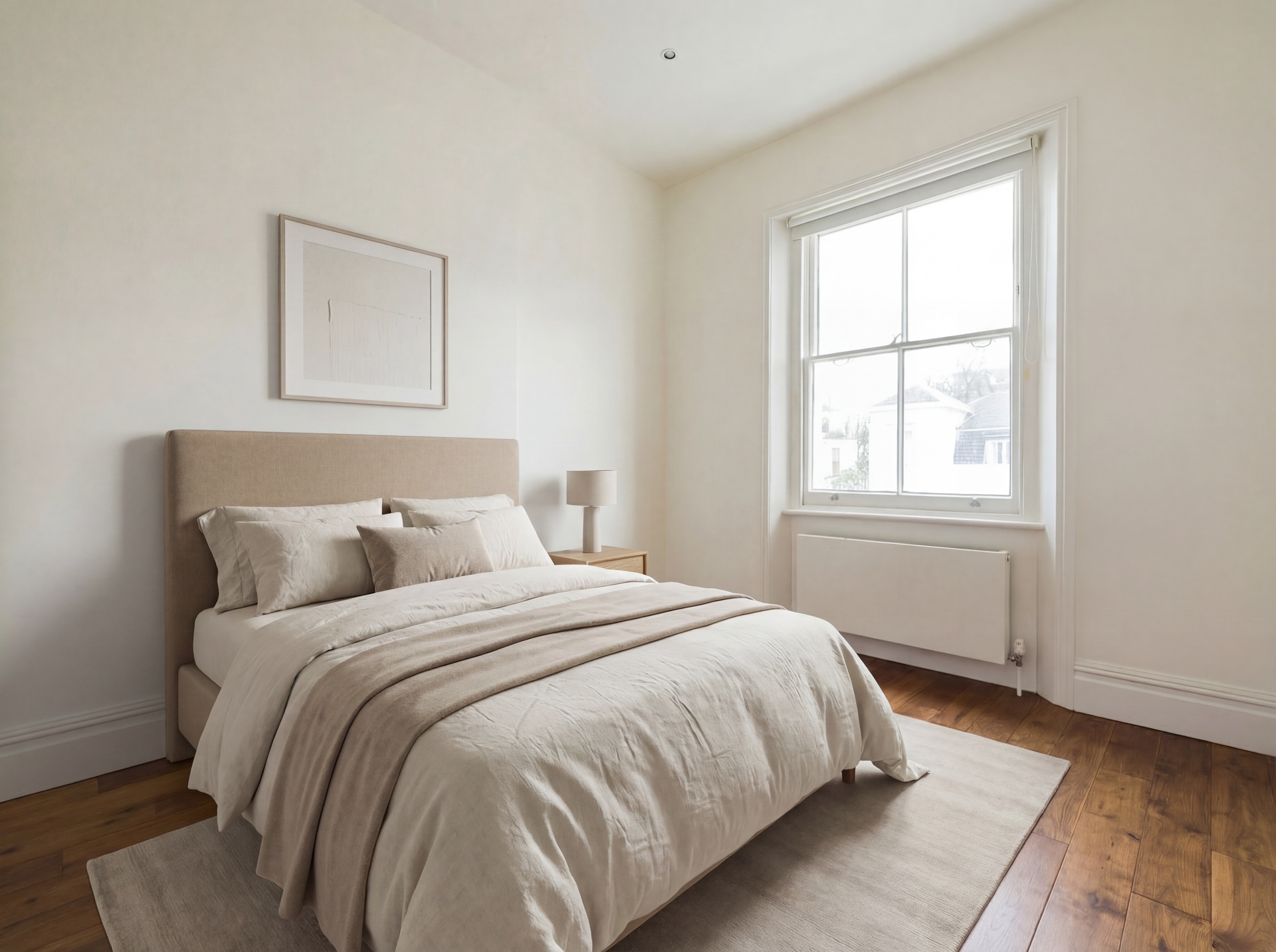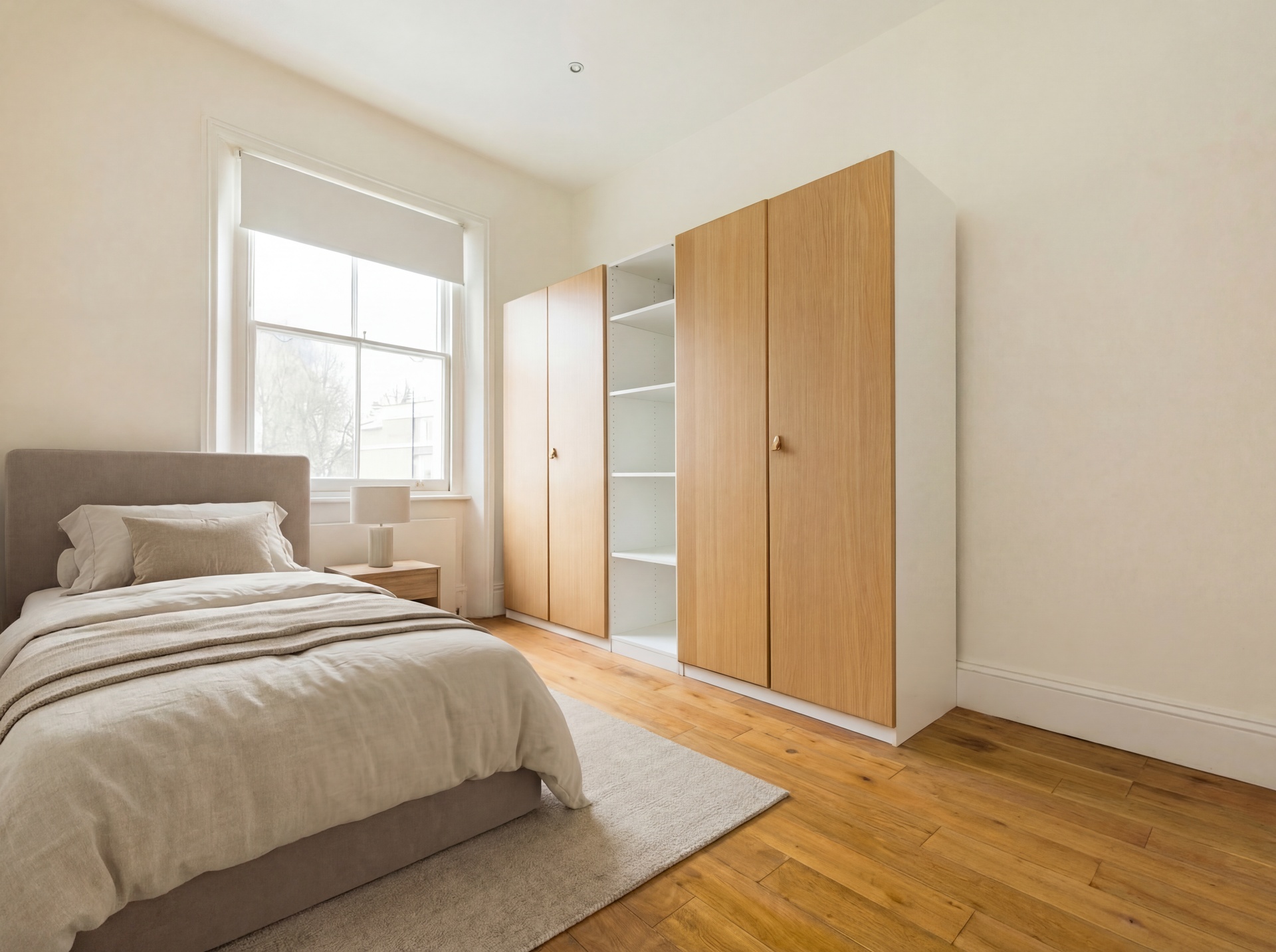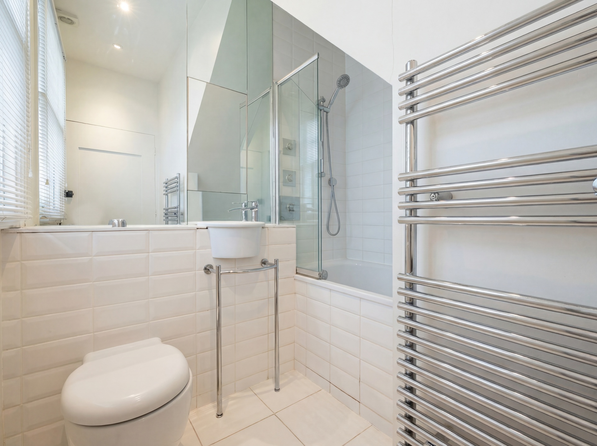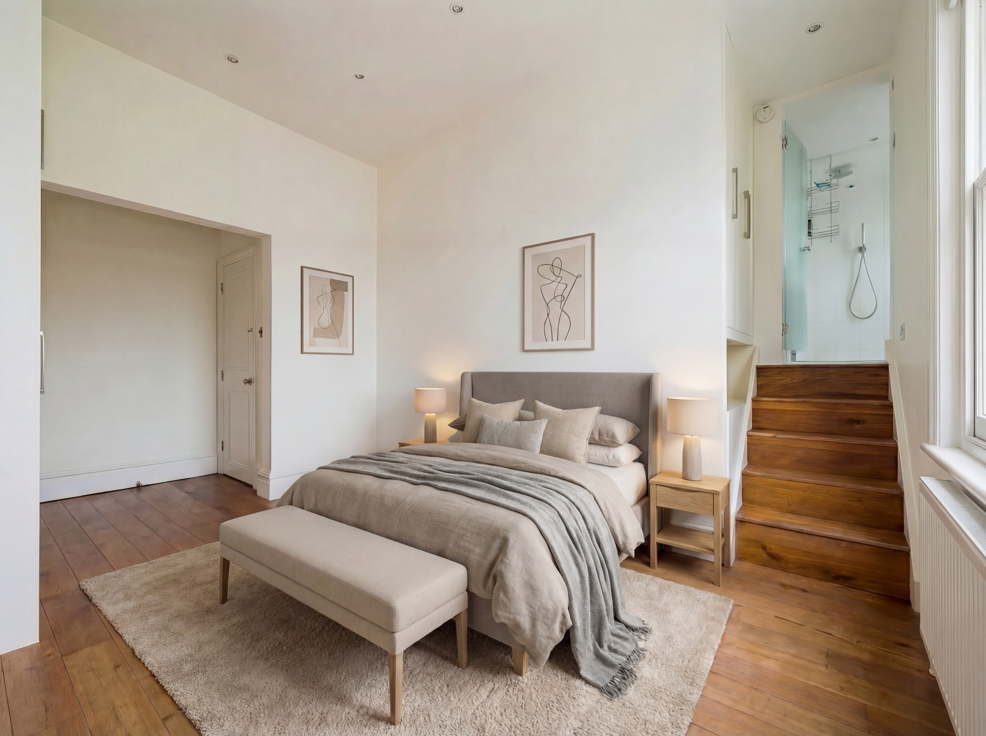 From this level there is access to a private balcony, providing a charming outdoor setting overlooking the surrounding period buildings and tree-lined street.