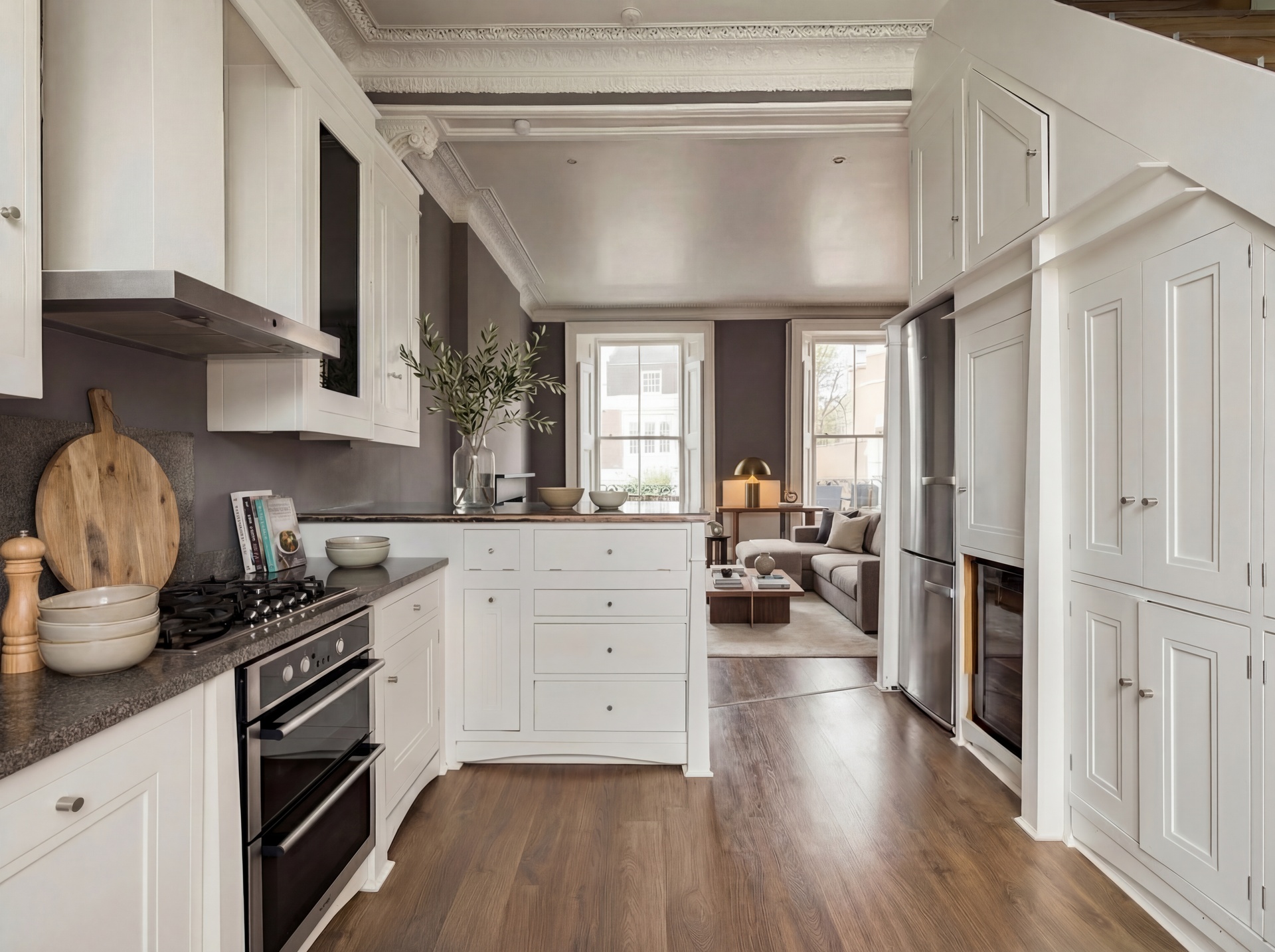 The first floor is centred around a substantial open-plan kitchen and reception room measuring over 30 ft in length, creating a bright and highly versatile living and entertaining space. Large sash windows allow excellent natural light throughout the room, while high ceilings, decorative cornicing and a feature fireplace enhance the elegant period character of the property.