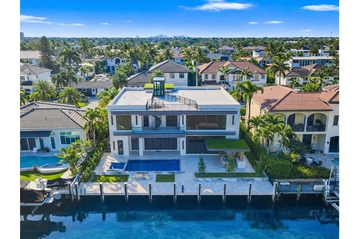 This newly constructed waterfront modern home by Soverns Developers offers luxury living in a prime location with a newly constructed 80' seawall. Designed by award-winning Barretta and Associates, residence showcases architectural excellence with 5 bedrooms, 5 bathrooms & 2 half bathrooms. The primary suite features a private balcony, while a VIP suite provides accommodations. Interior highlights include home office and chef’s kitchen equipped with Wolf & Sub-Zero appliances. A custom 3-stop glass elevator services floors and leads to rooftop terrace with breathtaking views. Outdoor amenities include a custom pool & spa, along with a covered terrace featuring a built-in summer kitchen, ideal for entertaining. The home includes a 3-car garage. Offered as an annual rental at $45,000/month