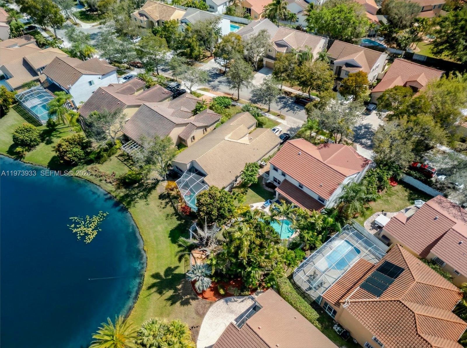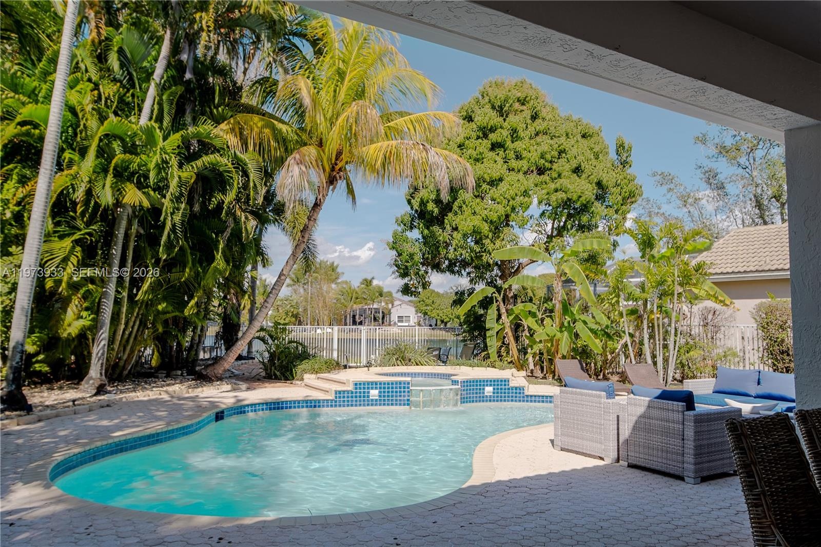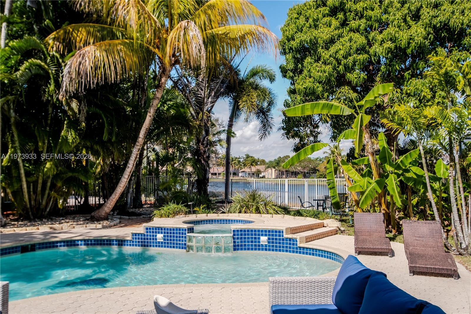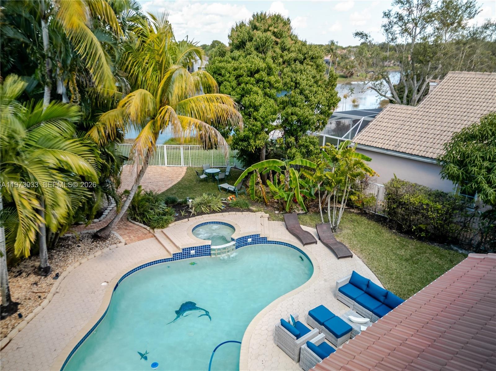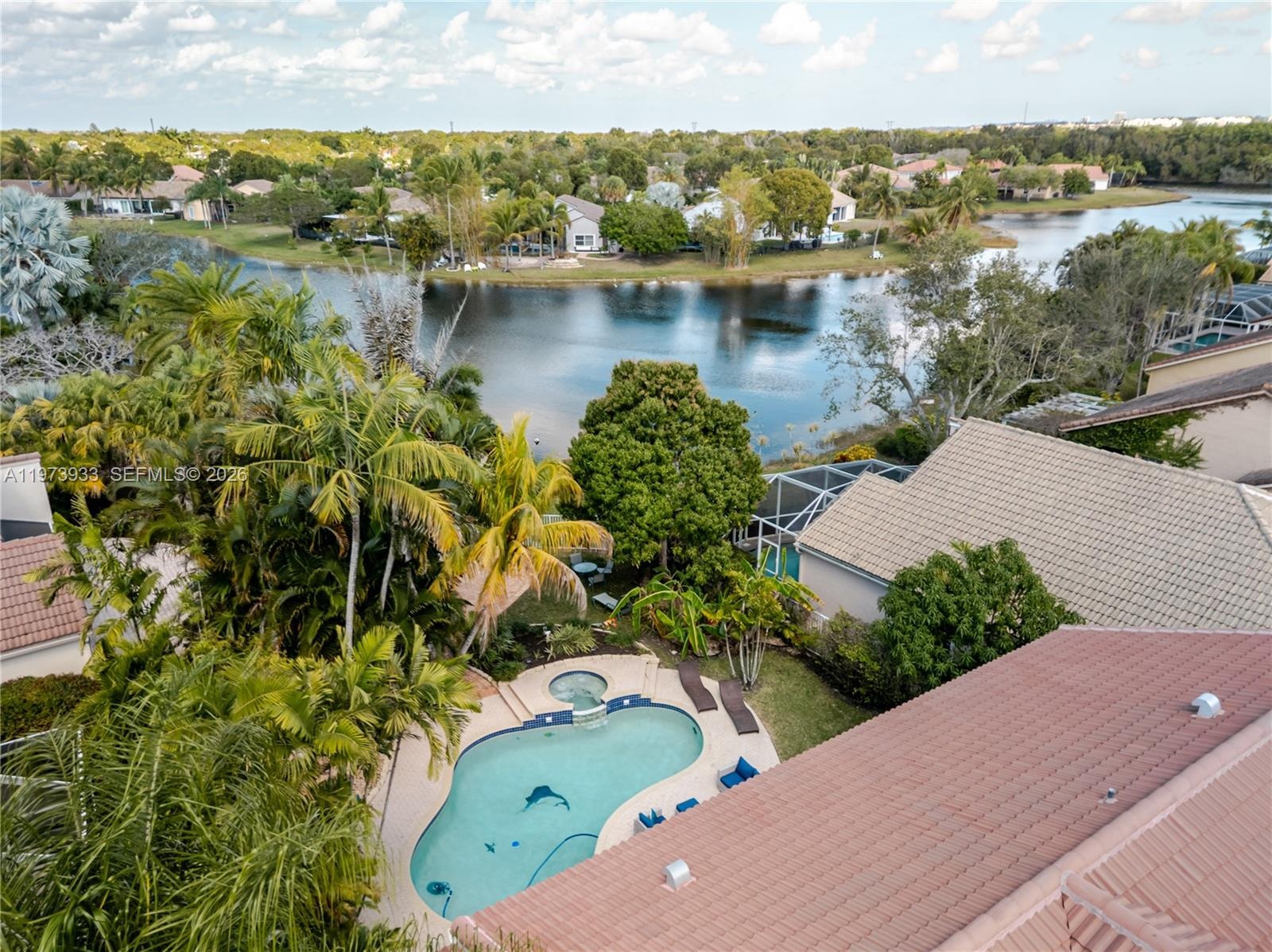 Step outside to a serene backyard retreat featuring a pool, jacuzzi, covered patio, and spectacular lake views with a tranquil walking path perfect for relaxing or hosting gatherings.