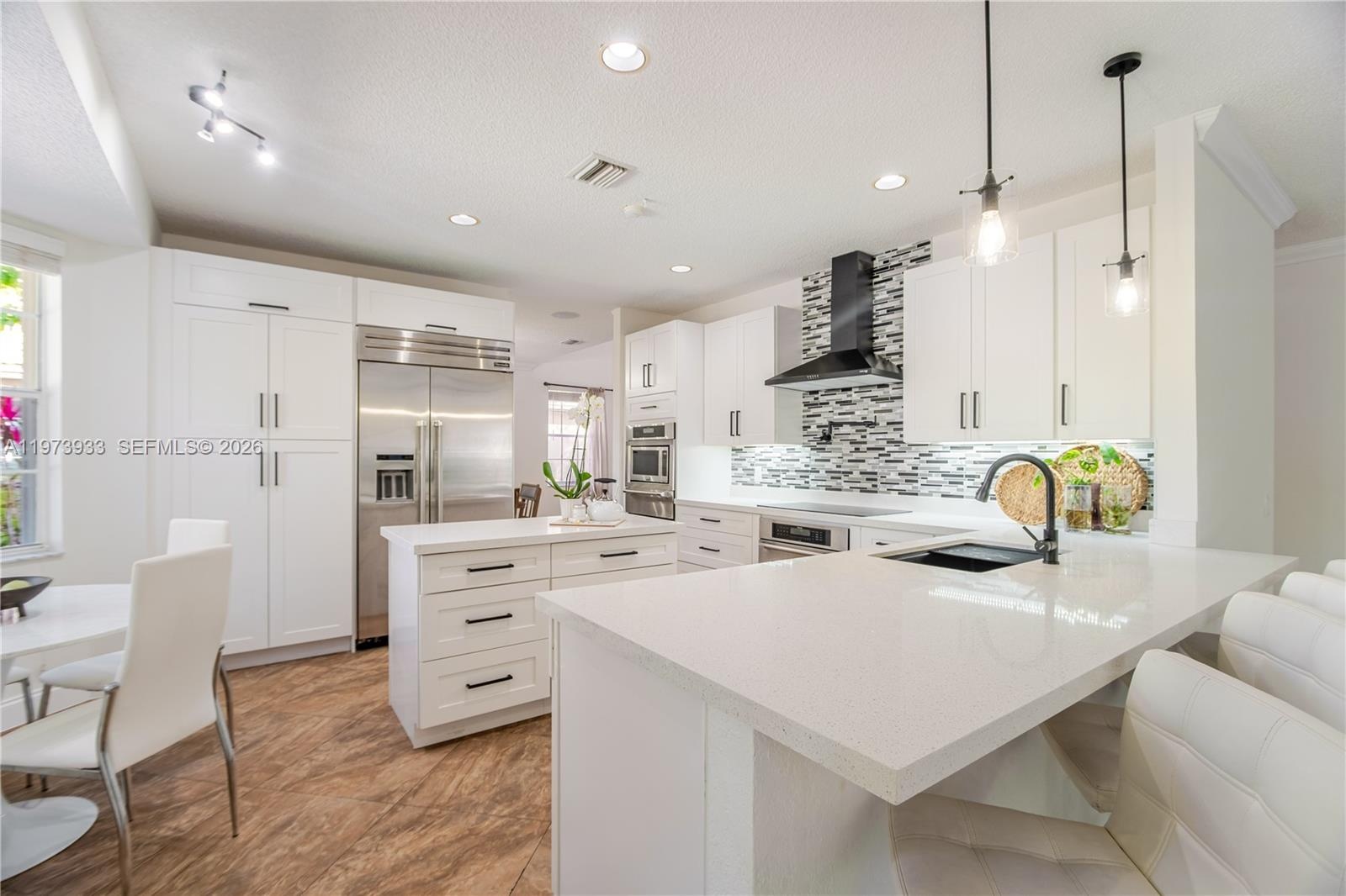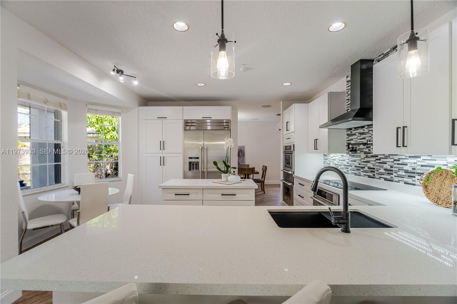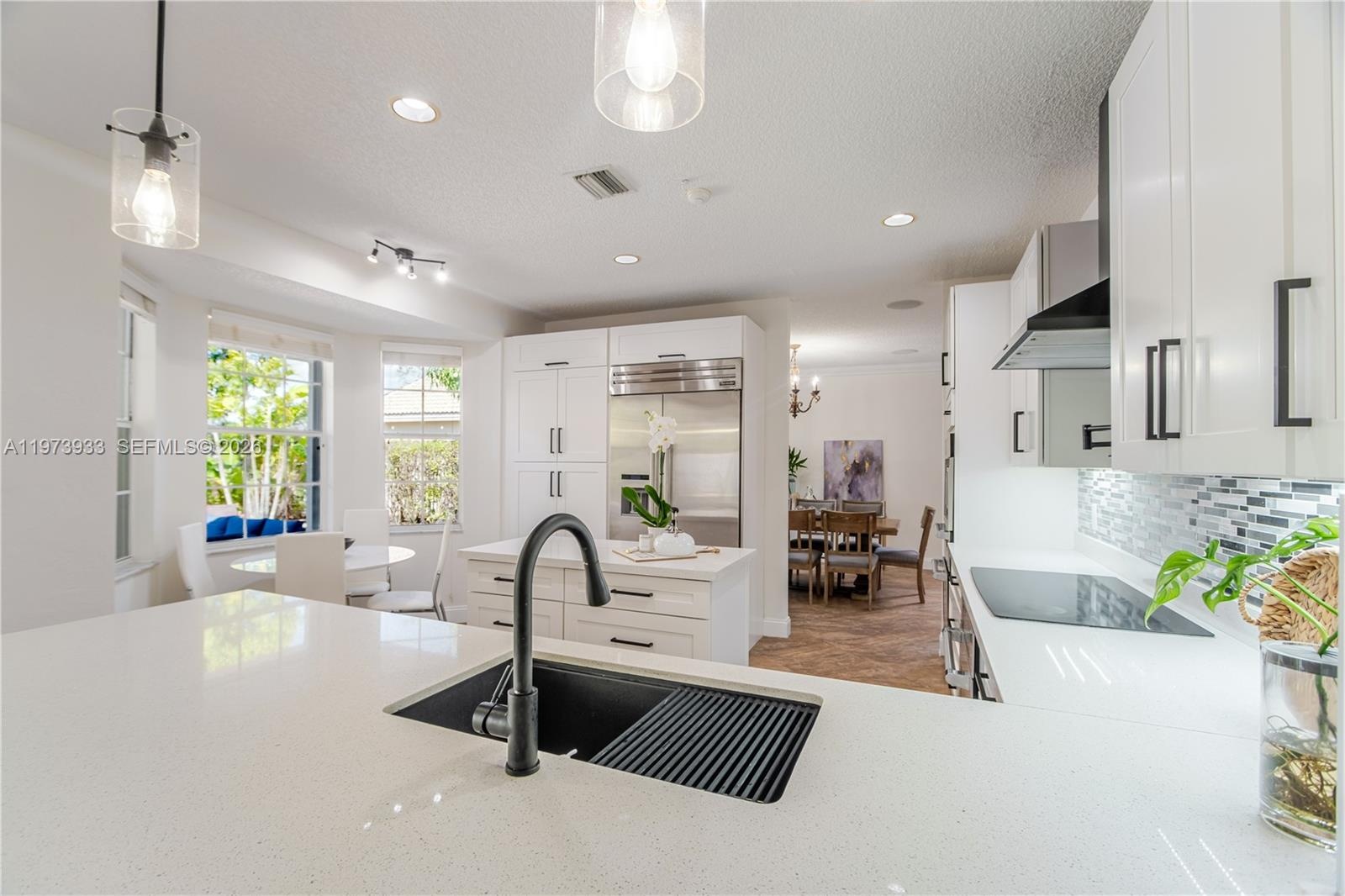 From the moment you enter, you’re greeted by bright, open living areas filled with natural light and refined modern finishes. The redesigned kitchen showcases contemporary cabinetry, quality countertops, updated appliances, a double oven, a warmer, and an upgraded Thermador refrigerator flowing seamlessly into the main living spaces, perfect for both everyday living and elegant entertaining.