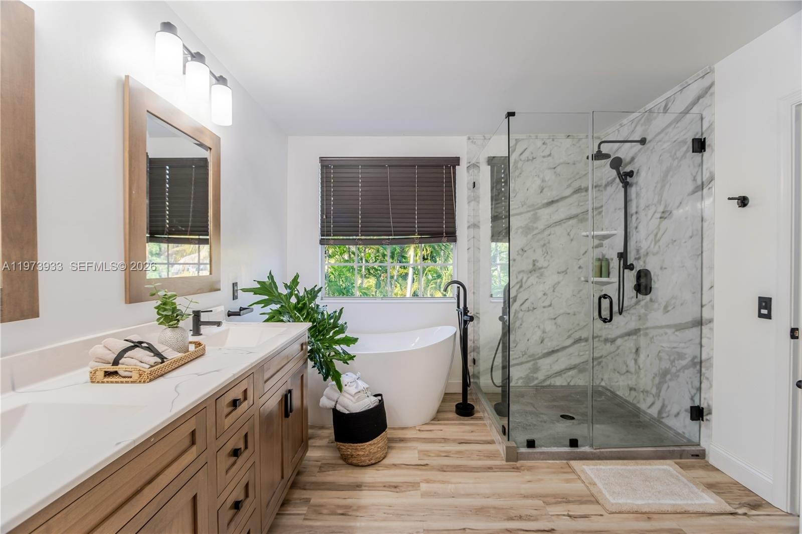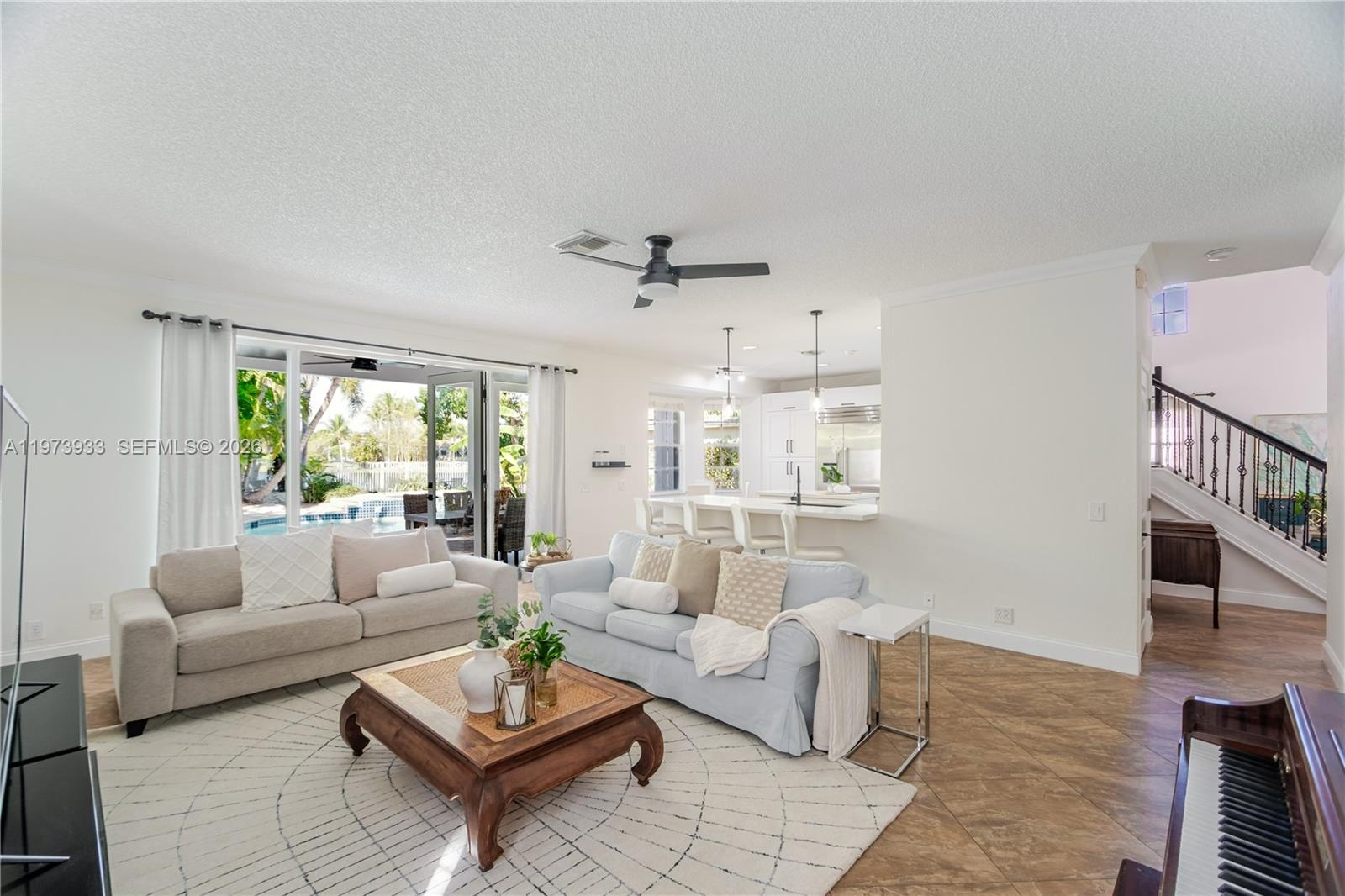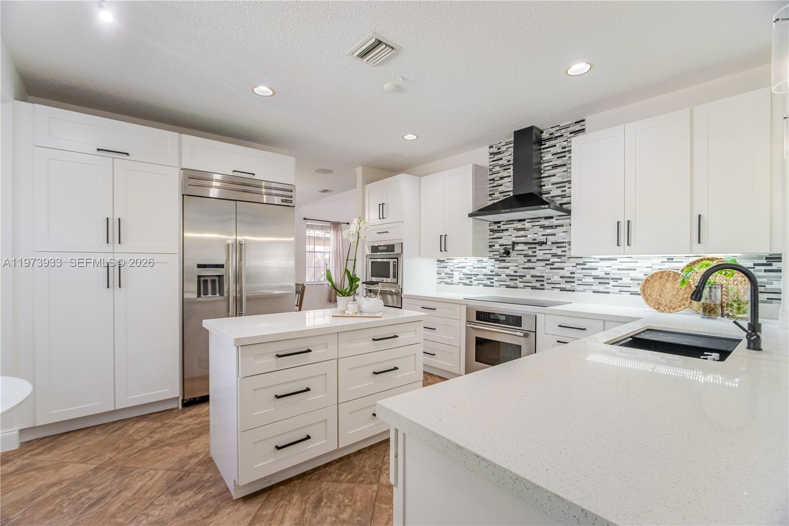 From the moment you enter, you’re greeted by bright, open living areas filled with natural light and refined modern finishes. The redesigned kitchen showcases contemporary cabinetry, quality countertops, updated appliances, a double oven, a warmer, and an upgraded Thermador refrigerator flowing seamlessly into the main living spaces, perfect for both everyday living and elegant entertaining.