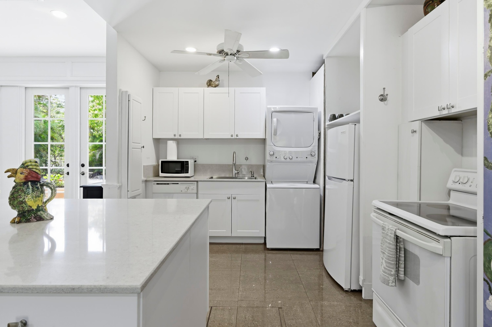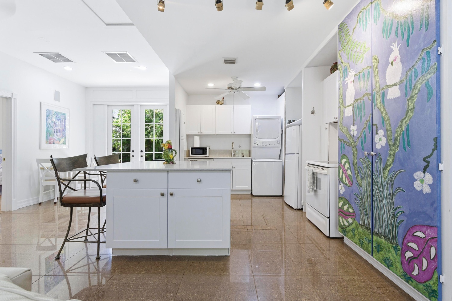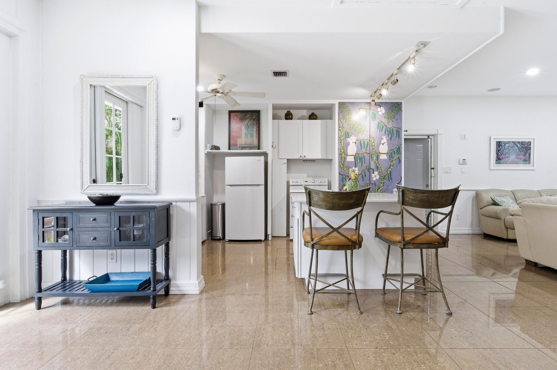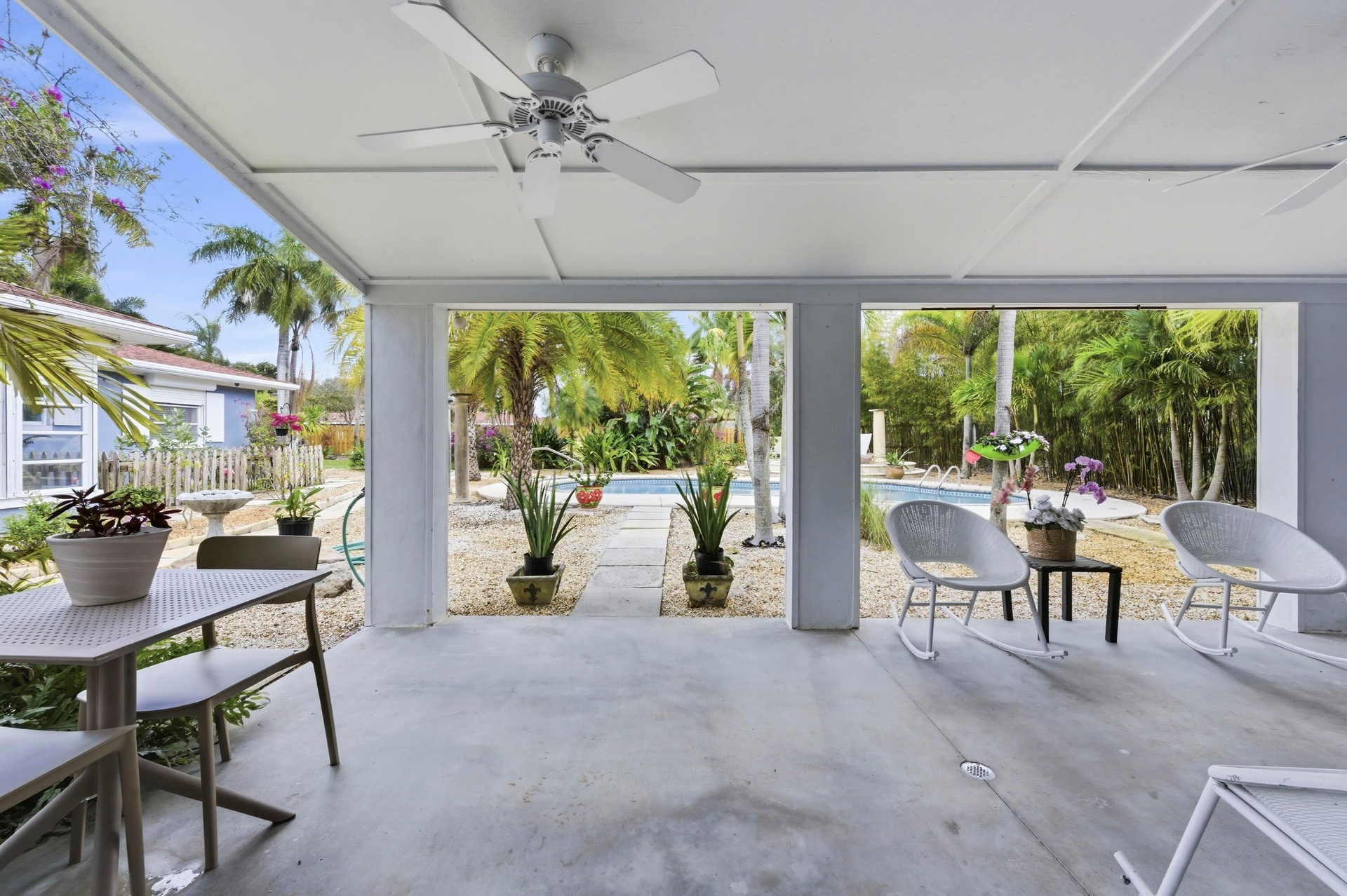 Welcome to ''Poolside Paradise'' Look no further! This exceptional 2 BR/1BA Guest House is a true urban retreat with pool in a tranquil, lush tropical setting. Covered cabana and charming courtyard. New kitchen, new cabinetry, marble countertops with generous island, and new appliances including washer and dryer. Open floor plan, high celings. electric fireplace. Charming courtyard with blooming plants, covered dining and sitting area on patio, private drive with ample parking; fenced yard. Pets negotiable. $175 per month covers, FPL, Water and Internet! It's like an island getaway and only 7 minutes to Downtown Delray! Short term rental available April thru December 2026. Choice location near trendy downtown Delray, the beach, shops and restaurants. The perfect Florida-style getaway.
