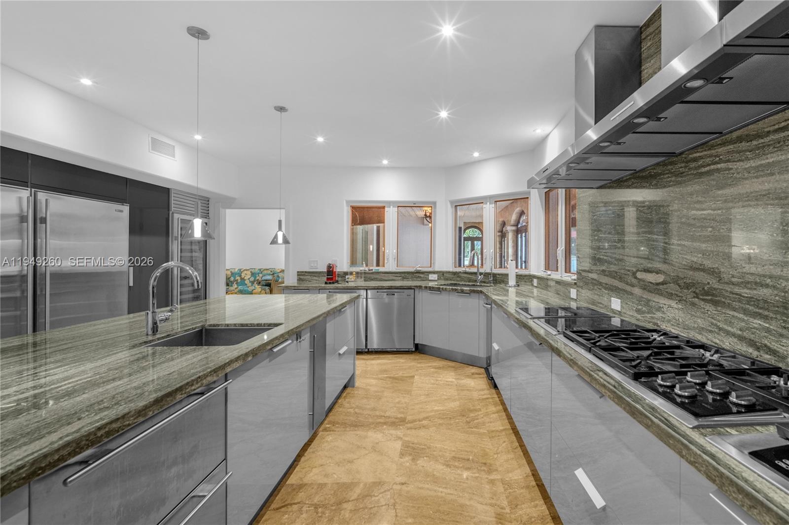 The home offers seven bedrooms, seven walk-in closets, seven full bathrooms, and one half bath, enhanced by premium finishes including Schuco impact windows and doors, natural stone flooring, and a solid concrete roof. The primary suite features boutique-style custom closets and built-ins.