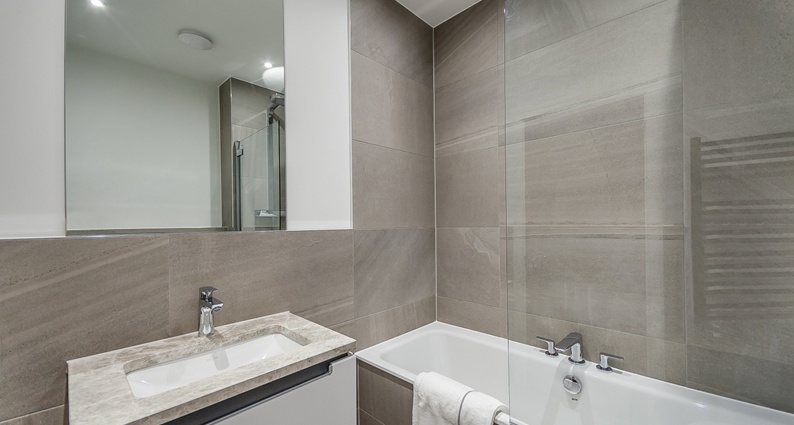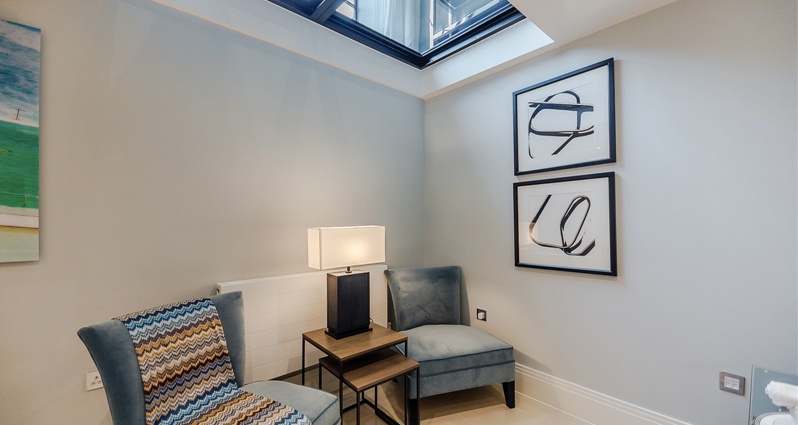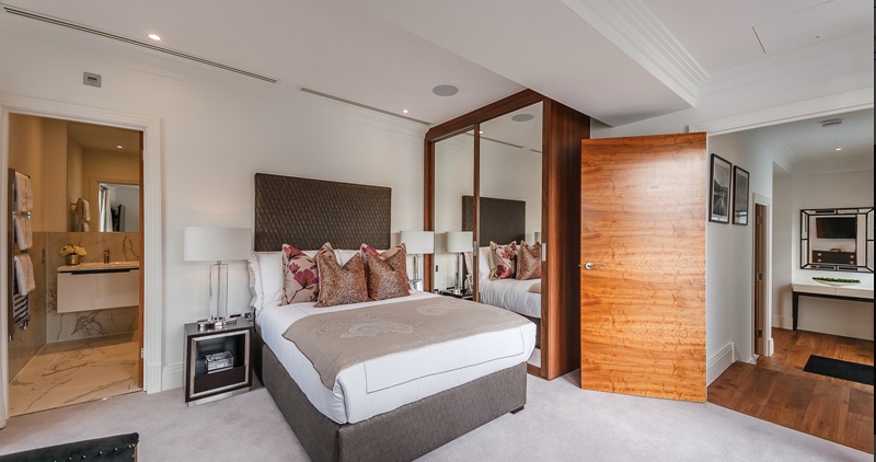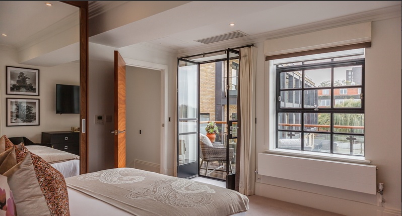 The apartment boasts a bright open kitchen and living area, two bedrooms with en-suites bathrooms and separate WC. The fully fitted Metric Kitchen is complete with Miele appliances including an integrated dishwasher, washer/dryer, full height fridge freezer, oven, hob, and integrated extractor fan as well as a wine cooler. The bathrooms comprise of full bathroom suites with underfloor heating whilst the bedrooms boast bespoke mirrored wardrobes and automatic lighting. Further benefits of the apartment include a creation audio-visual system, a digital video door entry system, and pre-wiring for SKY + TV.