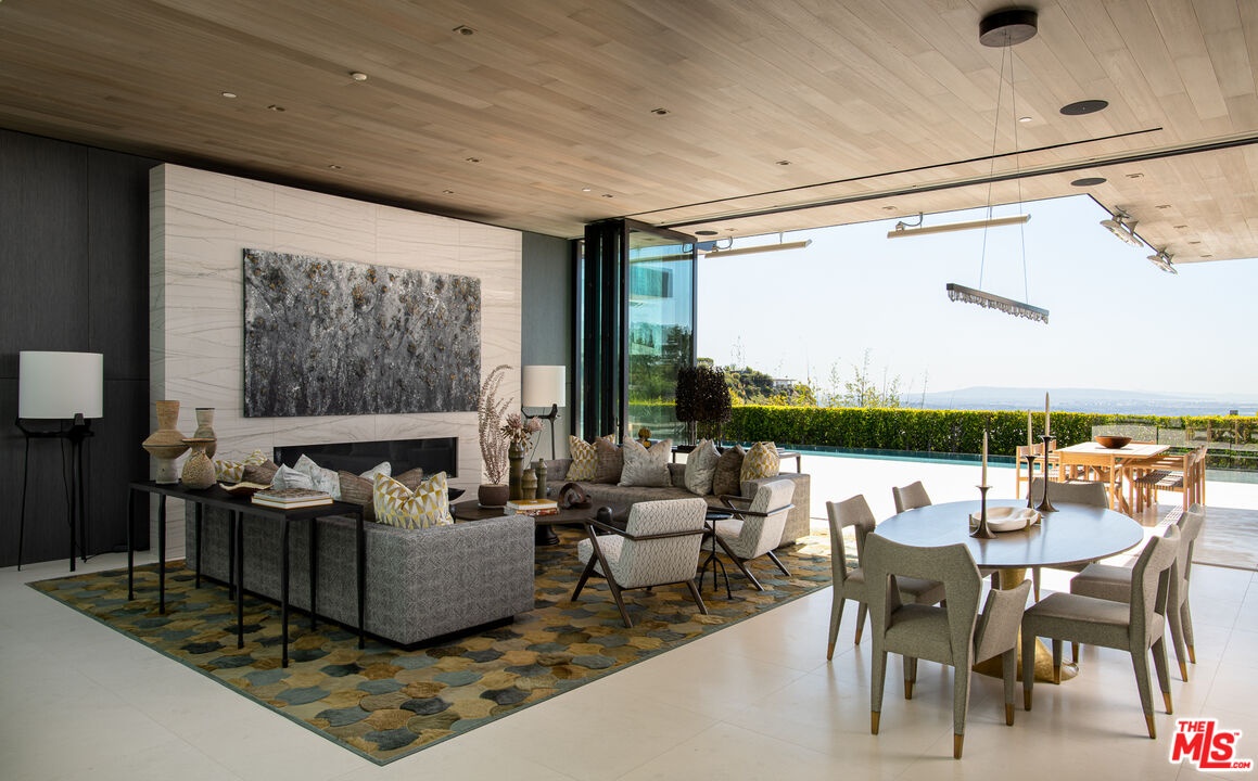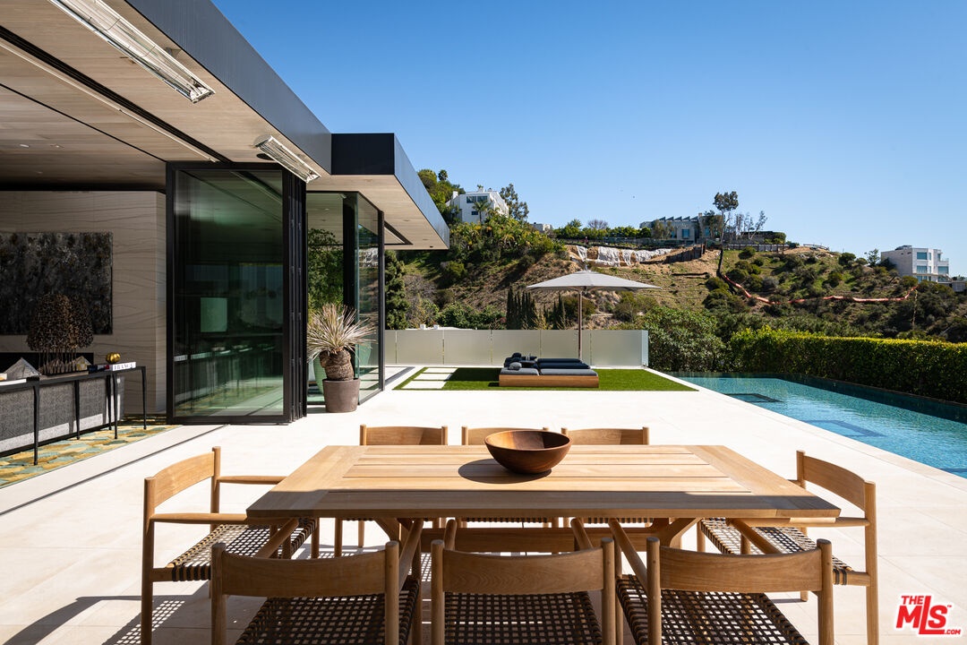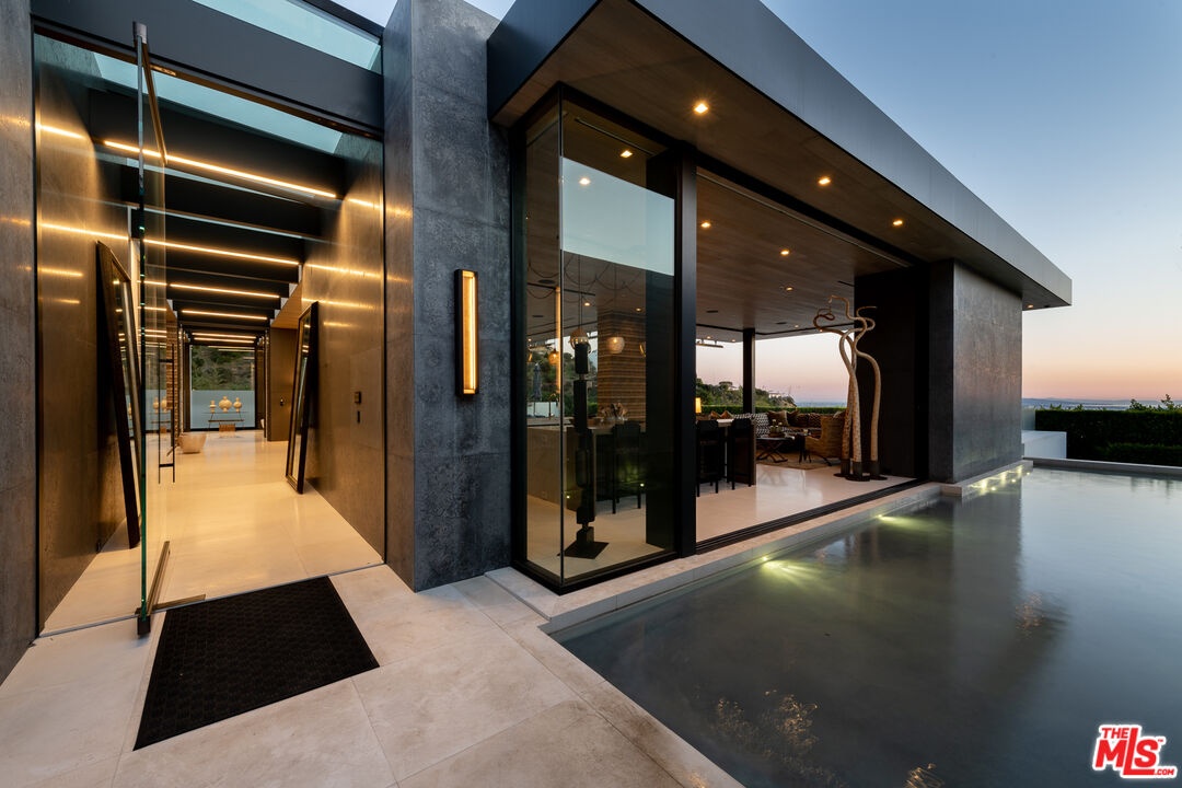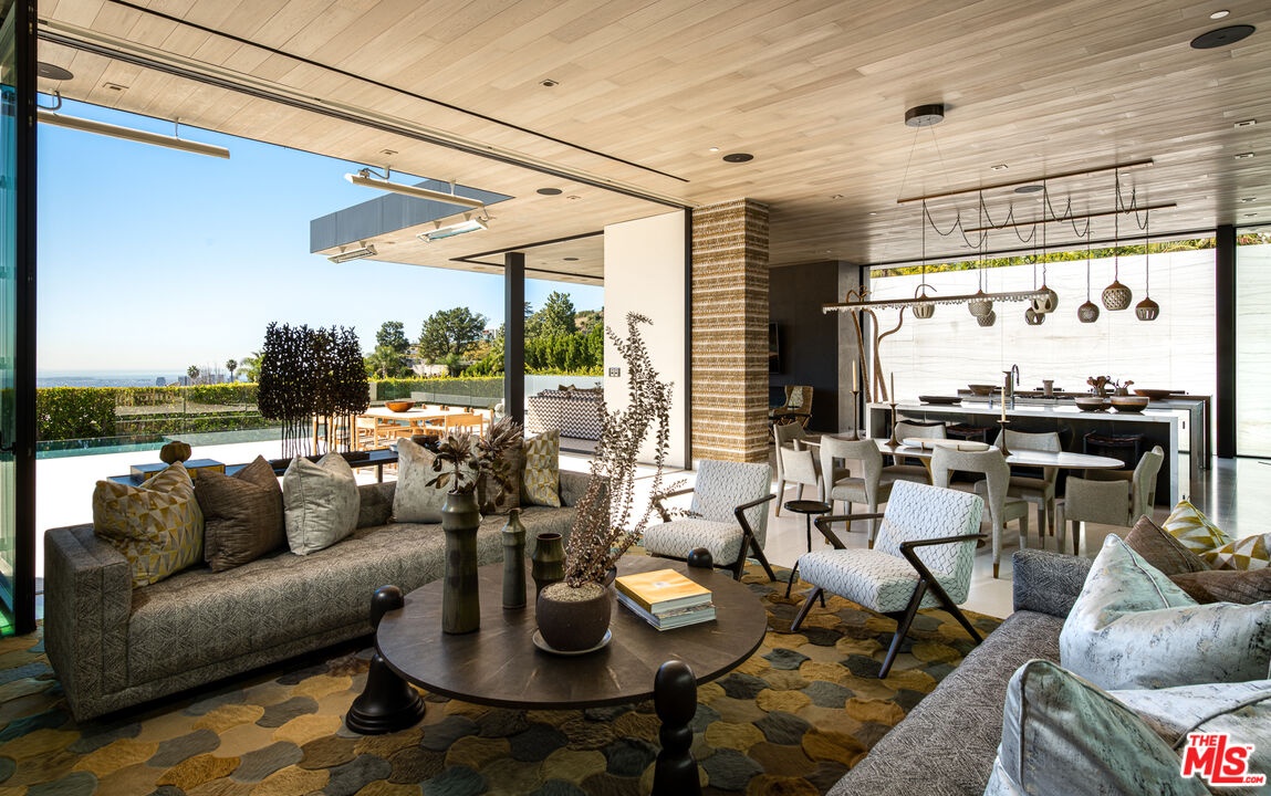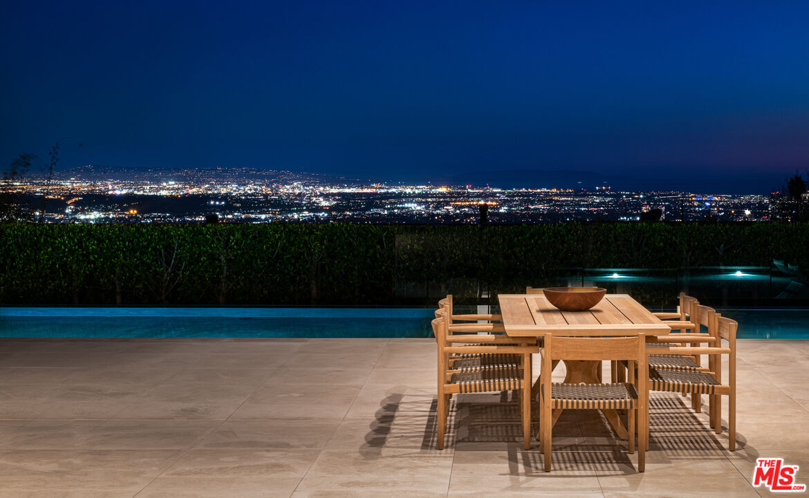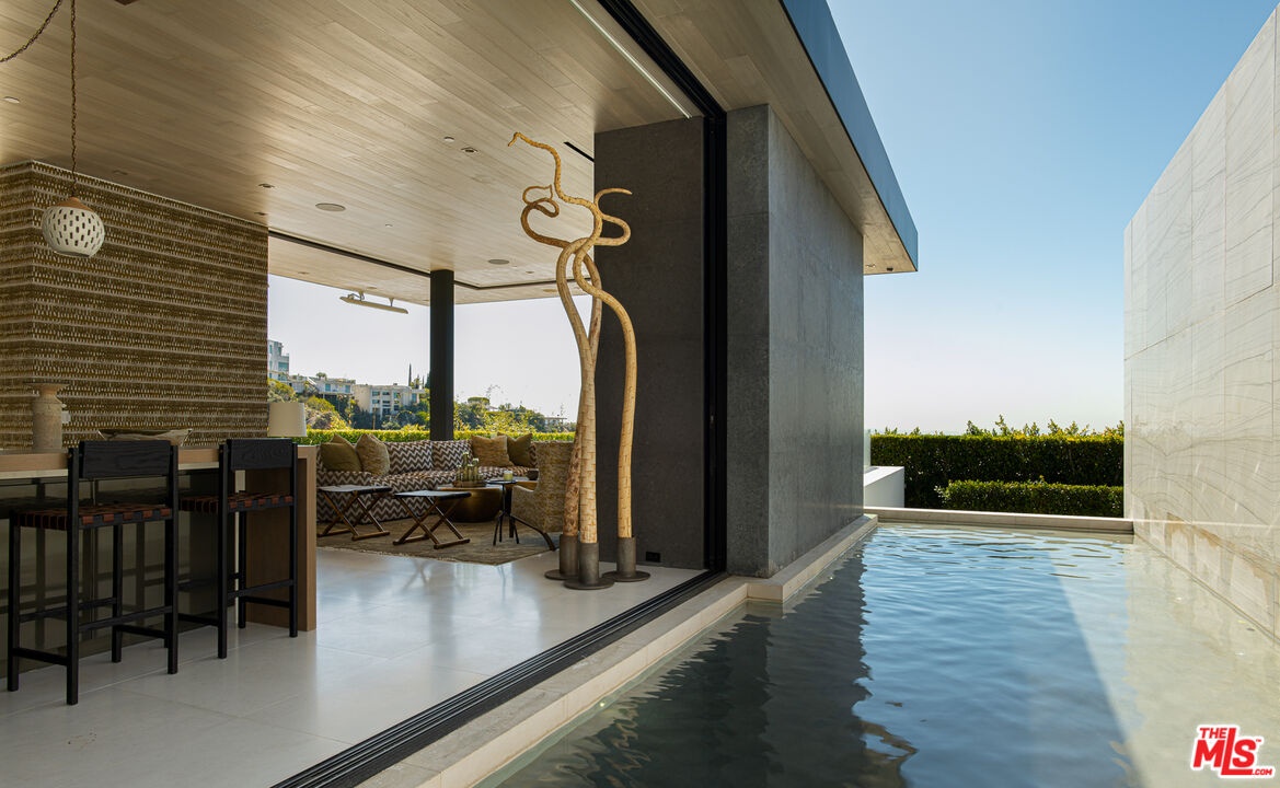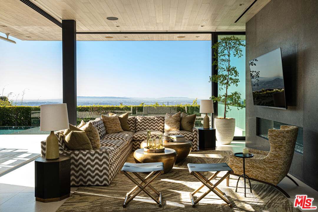Perched high above Sunset Boulevard with jetliner views stretching from Century City to the Pacific Ocean, this fully furnished modern residence offers truly breathtaking, unobstructed panoramas of Los Angeles. The home features soaring 12-foot ceilings, dramatic floor-to-ceiling windows, tranquil water features, a car museum, and a striking 70-foot book-matched marble exterior wall designed for ultimate privacy. The open-concept living spaces flow seamlessly through expansive Fleetwood doors onto a sun-drenched deck with an infinity pool overlooking the city. The chef's kitchen and luxurious primary suite, complete with a spacious walk-in closet and spa-style bath, are located on the main level, along with a second suite that offers an optional private entrance. The light-filled entertainment level includes two additional en-suite bedrooms, a grand great room with a custom bar, an 18-seat screening room, a fitness center with a steam room, and a stylish lounge area. Equipped with full Crestron smart-home automation, this exceptional property delivers a premier living experience just minutes from the Beverly Hills Hotel and Rodeo Drive. Please inquire with the listing agent regarding optional concierge services available for an additional fee.
