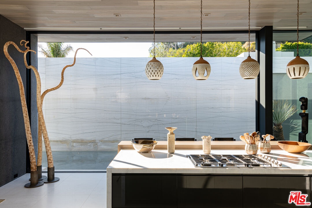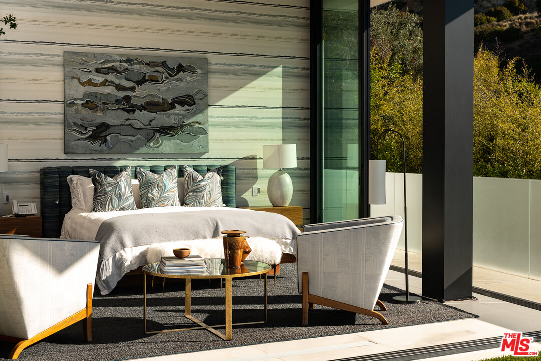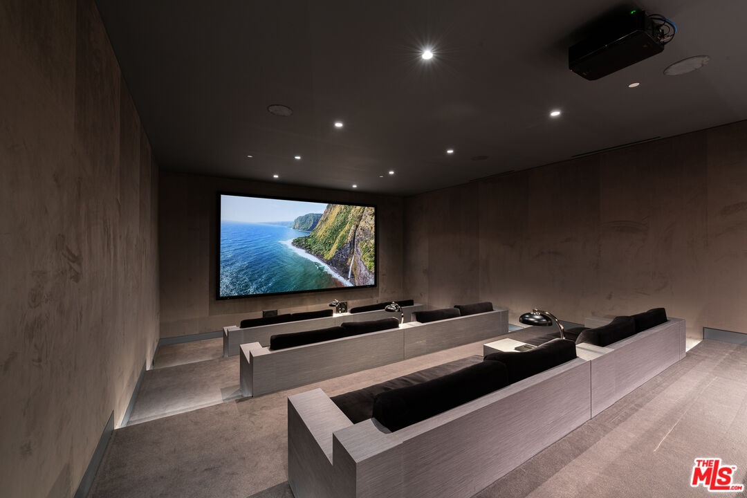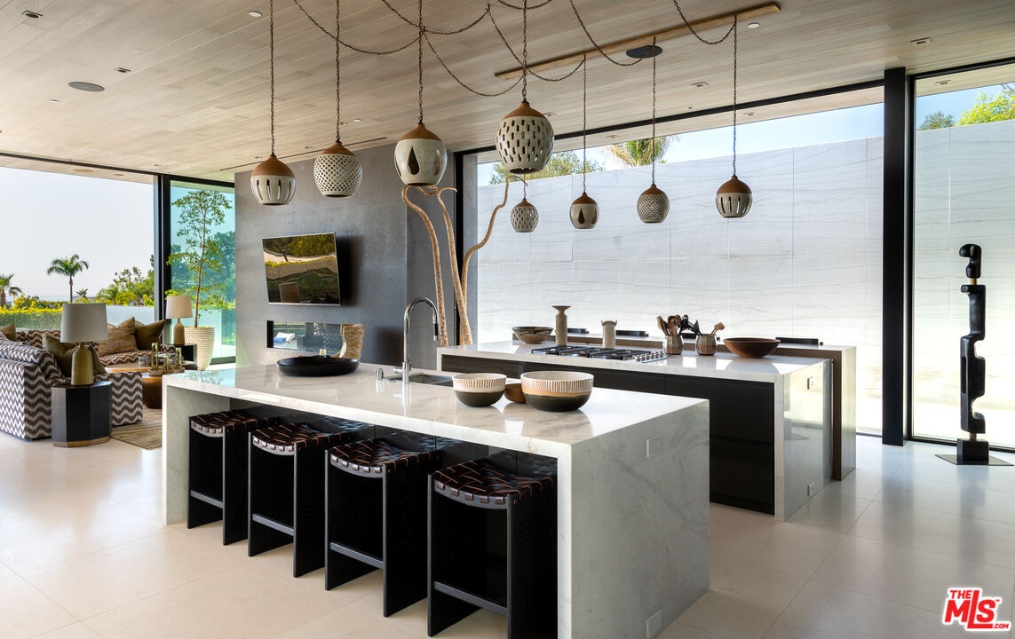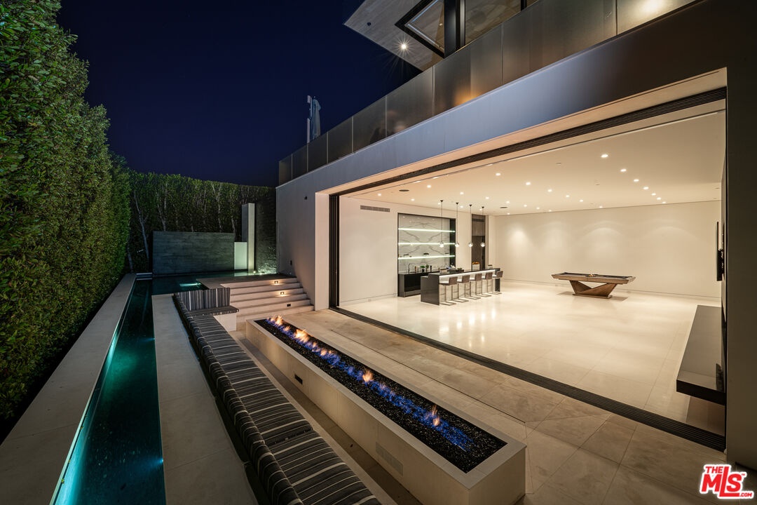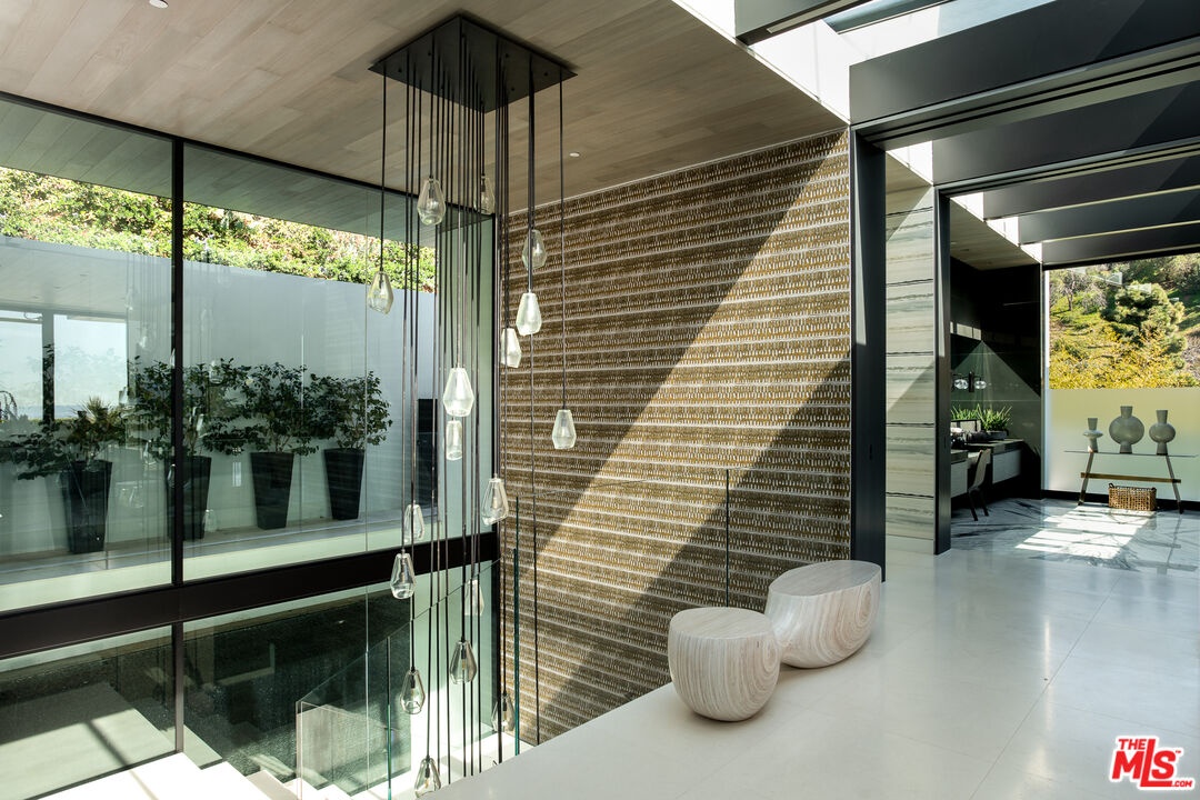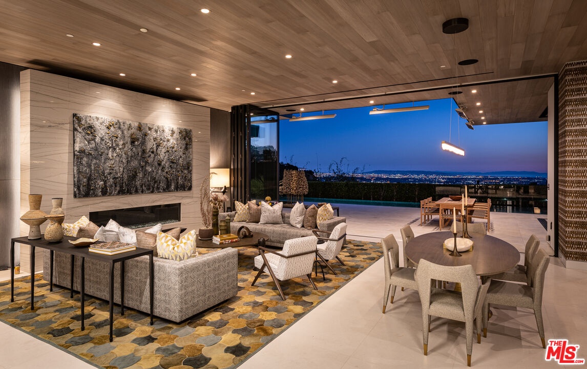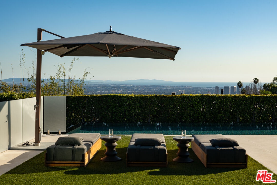 Perched high above Sunset Boulevard with jetliner views stretching from Century City to the Pacific Ocean, this fully furnished modern residence offers truly breathtaking, unobstructed panoramas of Los Angeles. The home features soaring 12-foot ceilings, dramatic floor-to-ceiling windows, tranquil water features, a car museum, and a striking 70-foot book-matched marble exterior wall designed for ultimate privacy. The open-concept living spaces flow seamlessly through expansive Fleetwood doors onto a sun-drenched deck with an infinity pool overlooking the city. The chef's kitchen and luxurious primary suite, complete with a spacious walk-in closet and spa-style bath, are located on the main level, along with a second suite that offers an optional private entrance. The light-filled entertainment level includes two additional en-suite bedrooms, a grand great room with a custom bar, an 18-seat screening room, a fitness center with a steam room, and a stylish lounge area. Equipped with full Crestron smart-home automation, this exceptional property delivers a premier living experience just minutes from the Beverly Hills Hotel and Rodeo Drive. Please inquire with the listing agent regarding optional concierge services available for an additional fee.