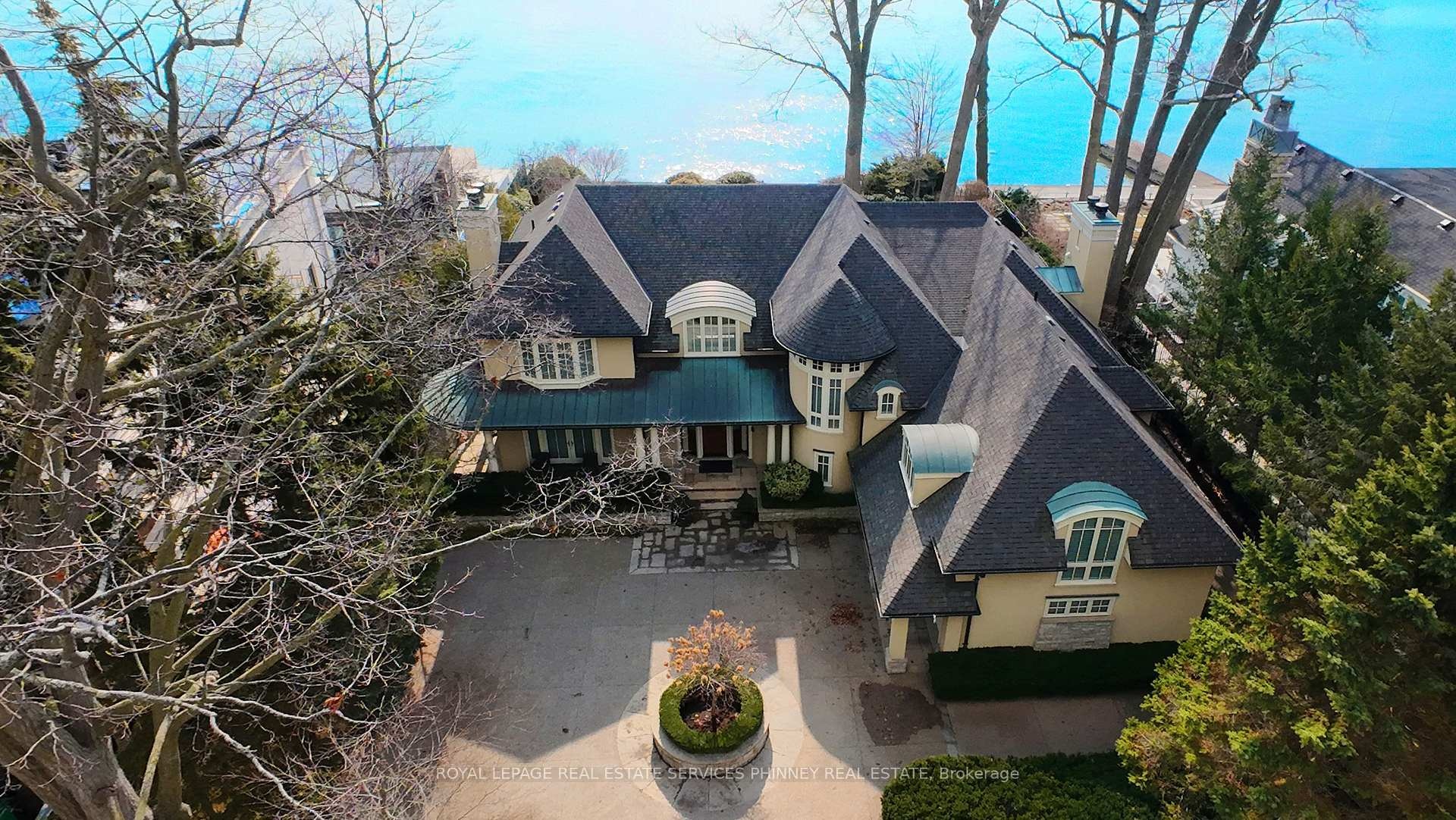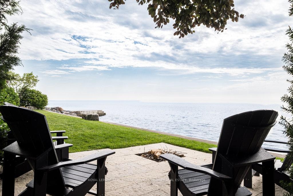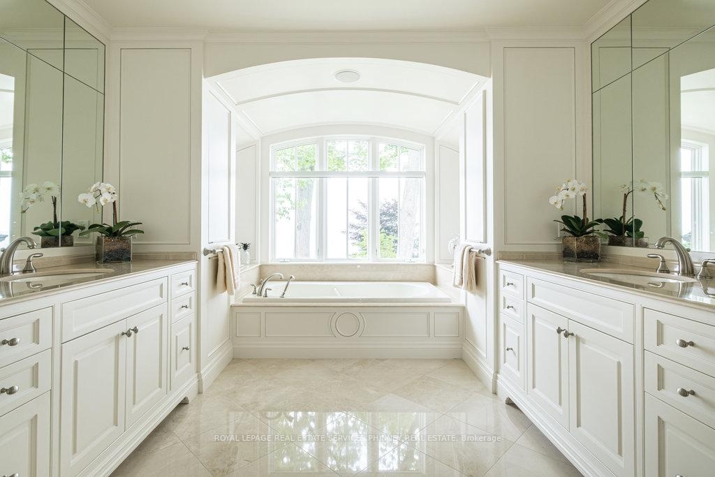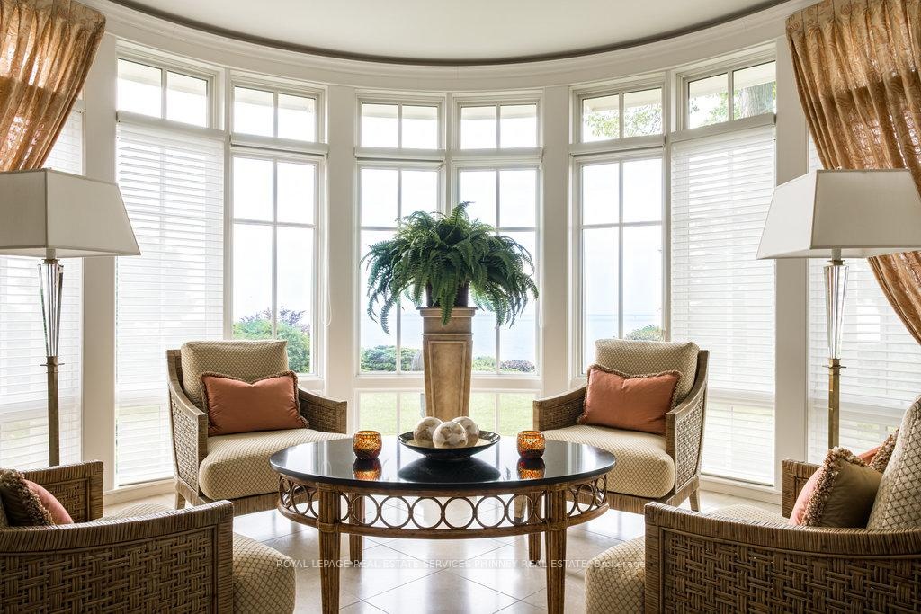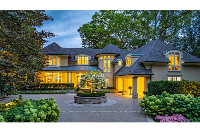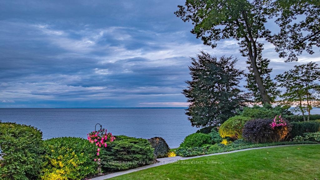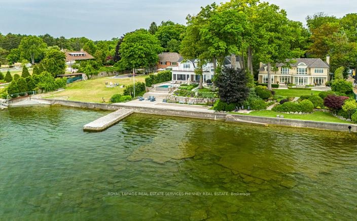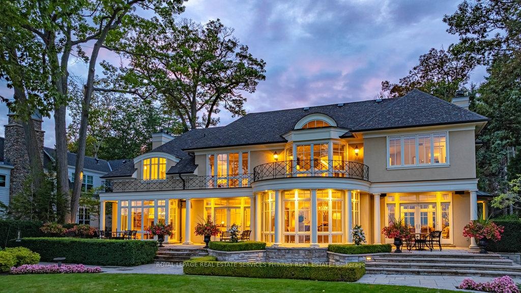 Gracefully set along the shores of Lake Ontario, this exceptional custom estate-designed by Gren Weis-occupies a prestigious waterfront property with coveted riparian rights in one of South-East Oakville's most exclusive enclaves. Framed by breathtaking lake views and a rare sense of privacy, the residence offers an extraordinary lifestyle where timeless architecture meets modern luxury. Classical proportions, refined interiors, and impeccable craftsmanship define every space-from intricate millwork and detailed ceilings to radiant heated floors and upgraded lighting. Expansive principal rooms are thoughtfully oriented to capture sweeping water vistas, creating a spectacular setting for elegant entertaining and relaxed family living. At the heart of the main level, a magnificent living room with double French doors welcomes the fresh lake breeze, while a luminous solarium overlooks the gardens. The level is completed by a formal dining room, a gourmet kitchen with professional-grade appliances and dedicated prep kitchen, and a sun-filled family room distinguished by striking waffle ceilings. The upper level reveals a tranquil primary suite with spa-inspired ensuite and dressing room, accompanied by three additional bedrooms, two beautifully appointed bathrooms, and an elegant library with sweeping views across the water. The lower level continues the home's exceptional scale with full-size windows, radiant heated floors, a spacious recreation room with wet bar, fitness studio with full bath, private guest suite with ensuite, and abundant storage. Outdoors, manicured gardens blend seamlessly with the natural beauty of the lakefront. Multiple walkouts connect the home to the grounds and shoreline-making morning paddleboarding or an evening canoe launch part of everyday life. Steps from Gairloch Gardens & minutes to DT Oakville's boutiques, dining, culture, and top schools, this remarkable property offers a rare opportunity to experience waterfront living at its finest