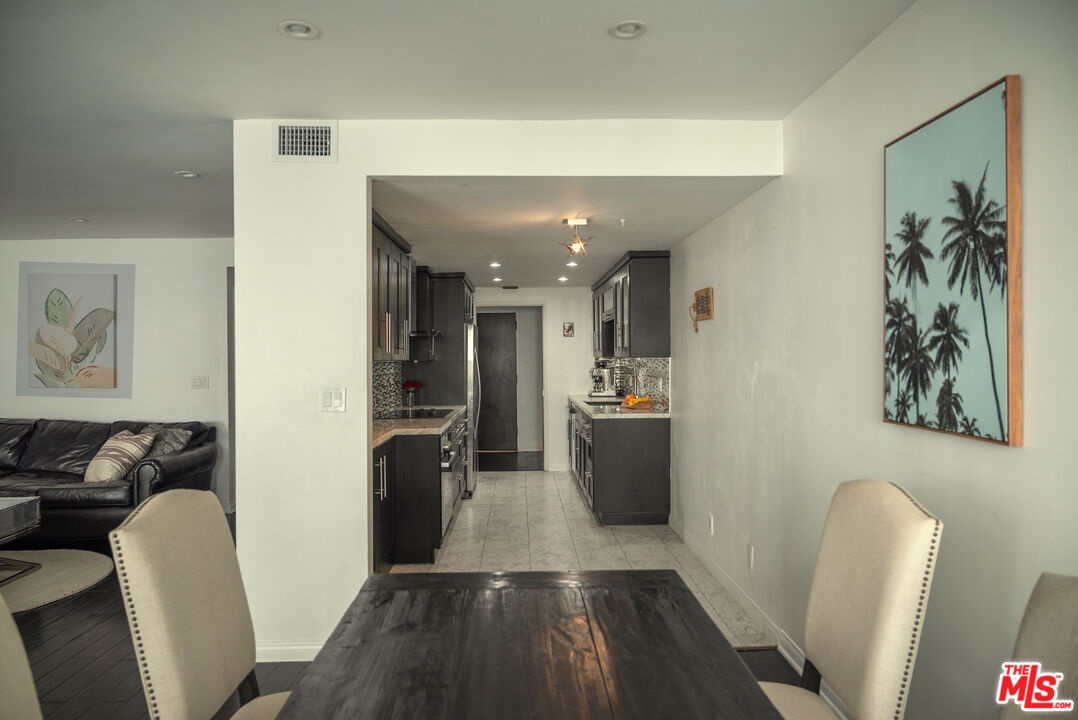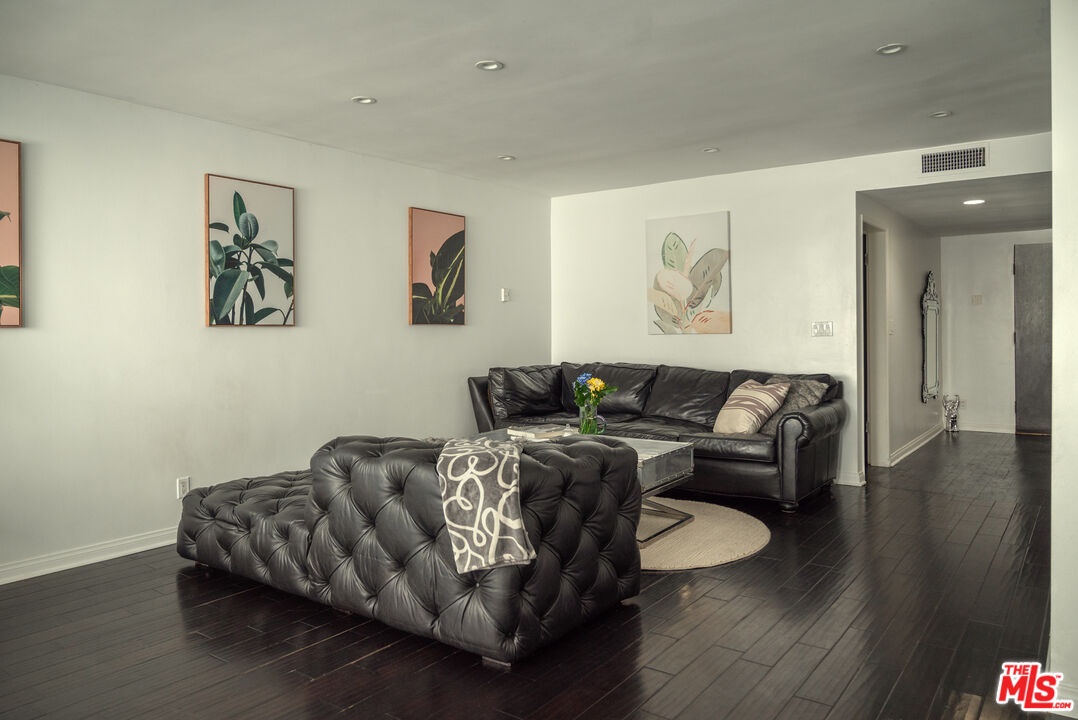 Oversized flat nestled in the Hollywood foothills walking distance to Runyon Canyon and Sunset Blvd. Hidden on a shady street amongst the trees in a mid century building by the Outpost Estates and Nichols Canyon, the home features a classic double door entrance into a large living space with balconies off the living room and both bedrooms. Adjacent to the formal dining area is a spacious kitchen with quartz countertops and stainless steel appliances. The primary bedroom suite has en suite bathroom with double vanity and built out walk-in closet. Second guest bedroom features its own sliding glass door and balcony, with a second full bathroom and hallway storage completing the home. The flat comes with two side-by-side parking spaces, ample storage, and community laundry (in-unit laundry can be added with HOA approval). The boutique building features a pool and spa surrounded by mature trees and foliage for privacy. Incredible location just steps to the entrance of Runyon Canyon and just a short walk to Wattles Park, shops and restaurants on Sunset Boulevard, the Hollywood Bowl, Magic Castle, and Roosevelt Hotel. Great space and value in the tree-lined Hollywood Hills.