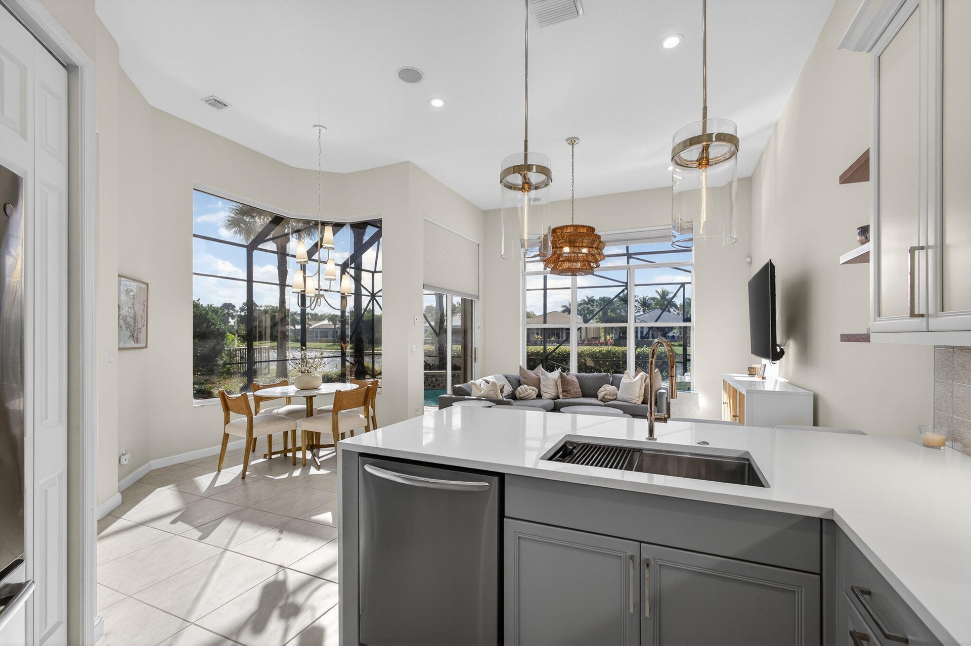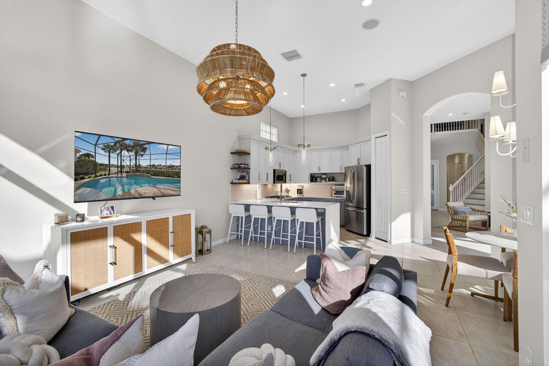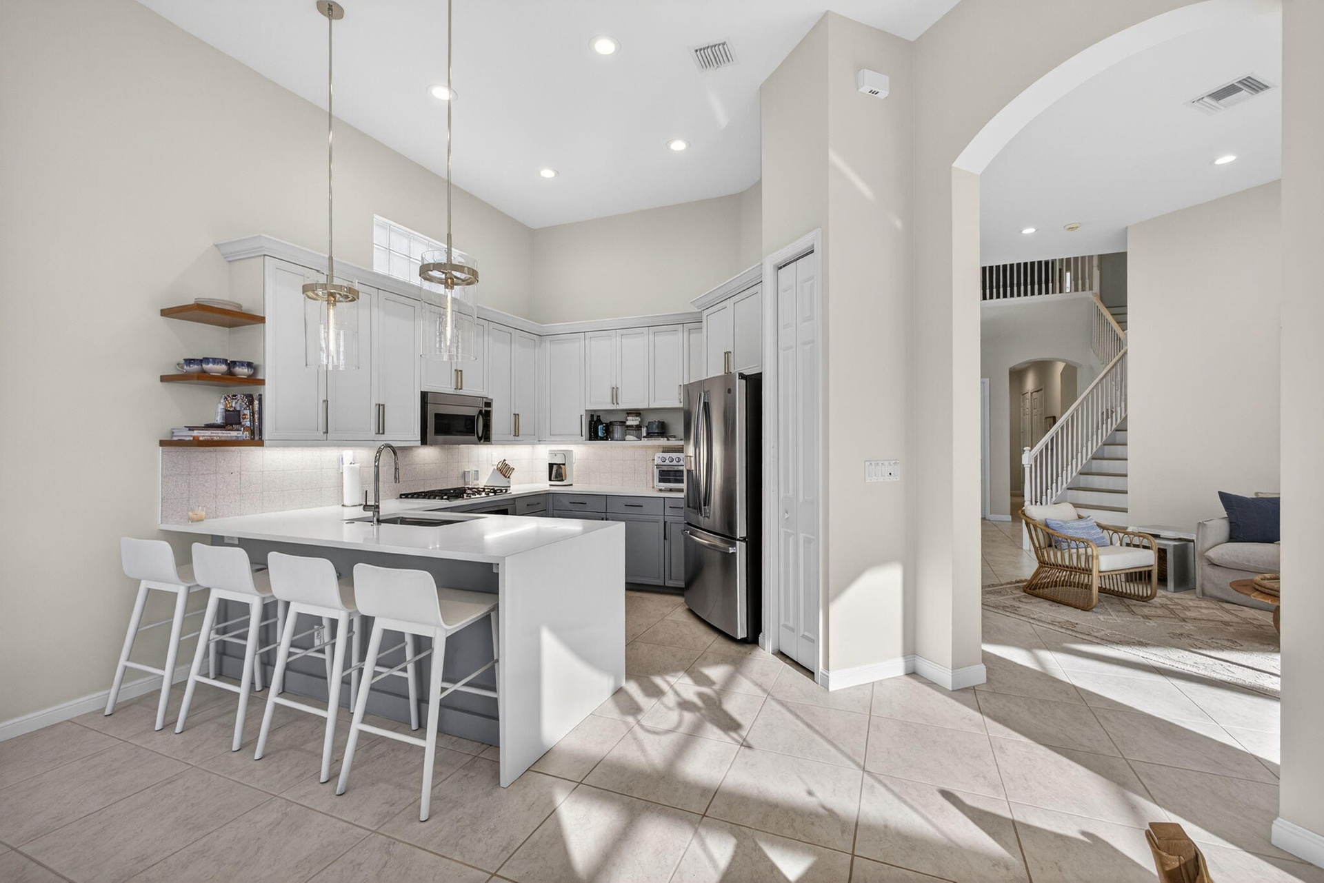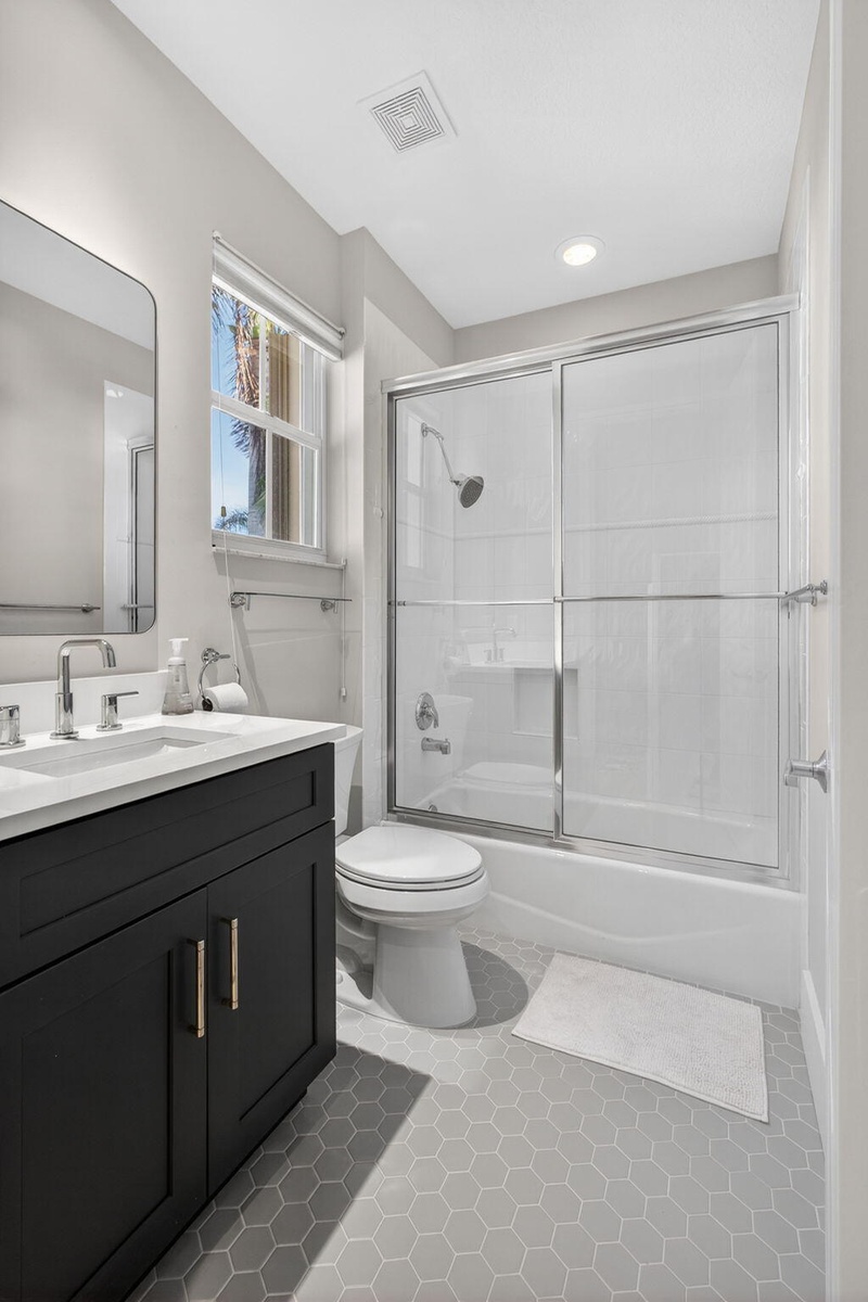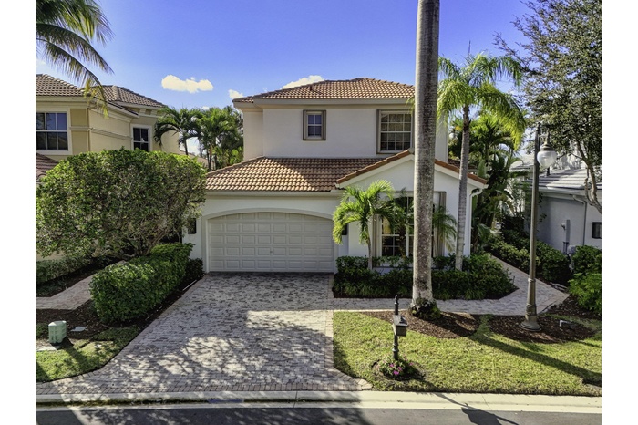 Now is the perfect time to settle into this beautifully updated four-bedroom, three-and-a-half-bath residence located in the prestigious The Country Club at Mirasol. Thoughtfully renovated and truly move-in ready, this home blends timeless elegance with modern comfort throughout. The main living areas feature gorgeous light flooring that enhances the home's open and airy feel, complemented by wood-like flooring in the bedrooms and along the staircase. Designer finishes are found throughout, including stylish lighting fixtures, LED accent lighting, and a soft, sophisticated color palette that creates a warm and inviting atmosphere. The kitchen has been tastefully renovated with quartz countertops, a dramatic waterfall edge, and a beautiful combination of white and soft blue cabinetry. The layout is both functional and inviting, making it ideal for everyday living as well as entertaining. A first-floor (second primary) guest bedroom offers privacy and flexibility with a fully renovated en-suite bath featuring a light wood-styled double-sink vanity, spacious walk-in shower, and updated lighting. This space is ideal for visiting guests or extended family. A newly added powder room provides added convenience for entertaining, and the laundry area has been thoughtfully redesigned to maximize efficiency. Ample closet space and storage are found throughout the home. Upstairs, the popular Dorado floorplan offers two additional bedrooms, a renovated shared bath, and a spacious loft area each finished with new wood-like luxury vinyl flooring to maintain a cohesive and updated look. Outdoor living is a true highlight of this home. Enjoy stunning Florida sunsets from the expansive backyard featuring a free-form, salt-chlorinated heated pool. The fully enclosed patio seamlessly extends the living space outdoors and is surrounded by lush tropical landscaping, all overlooking a beautiful wide lake creating a private and tranquil retreat. A dedicated home office adds flexibility for today's lifestyle. A sports membership offering provides access to exceptional amenities, including indoor and outdoor pickleball courts, Har-Tru tennis courts, two championship golf courses, and multiple dining venues within the community. Additional features include accordion shutters, a tankless water heater, and multiple A/C units replaced in 2020 and 2022, including a separate system serving the first-floor guest suite. This exceptional residence offers the ideal combination of style, comfort, and resort-style living and is truly a must-see.