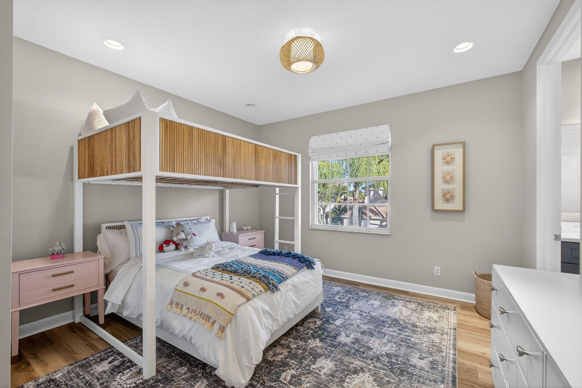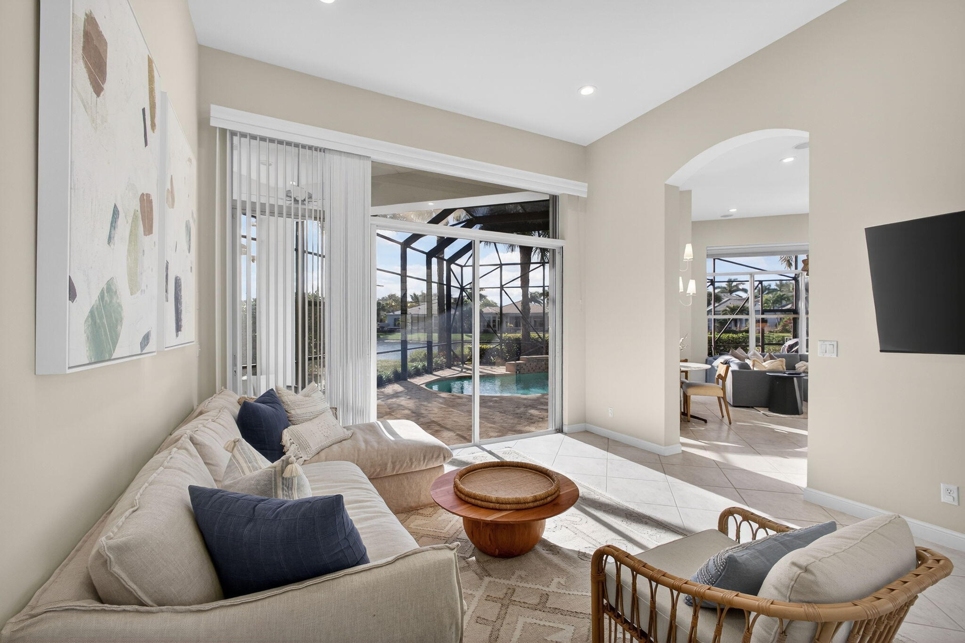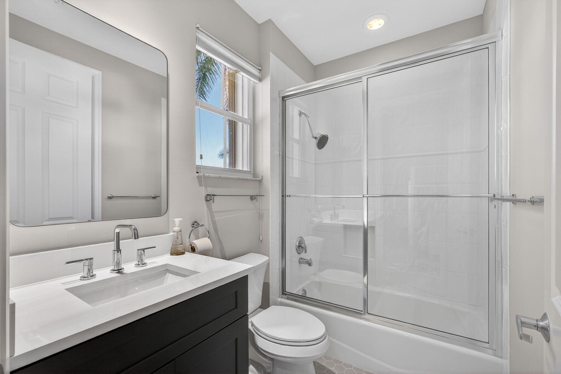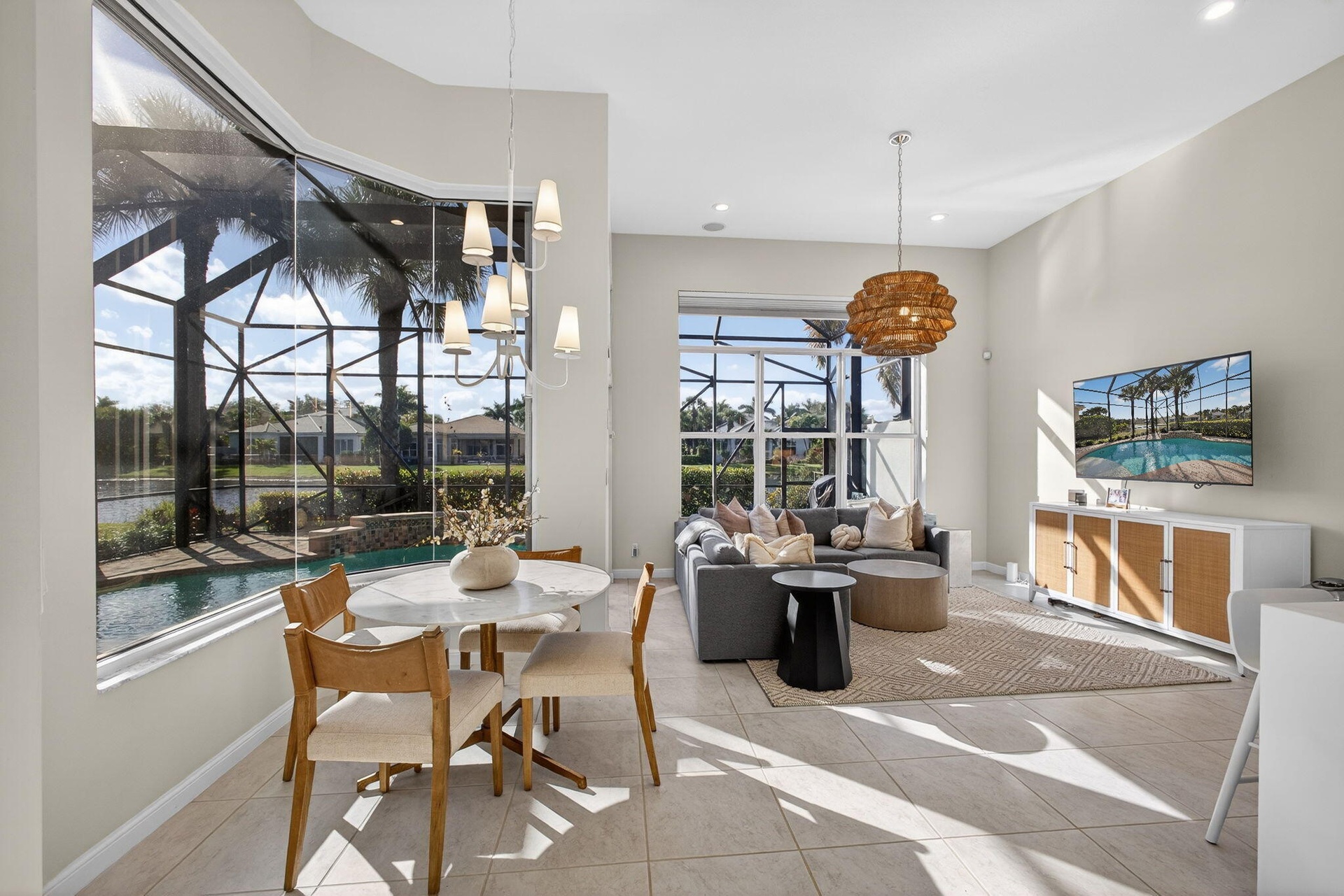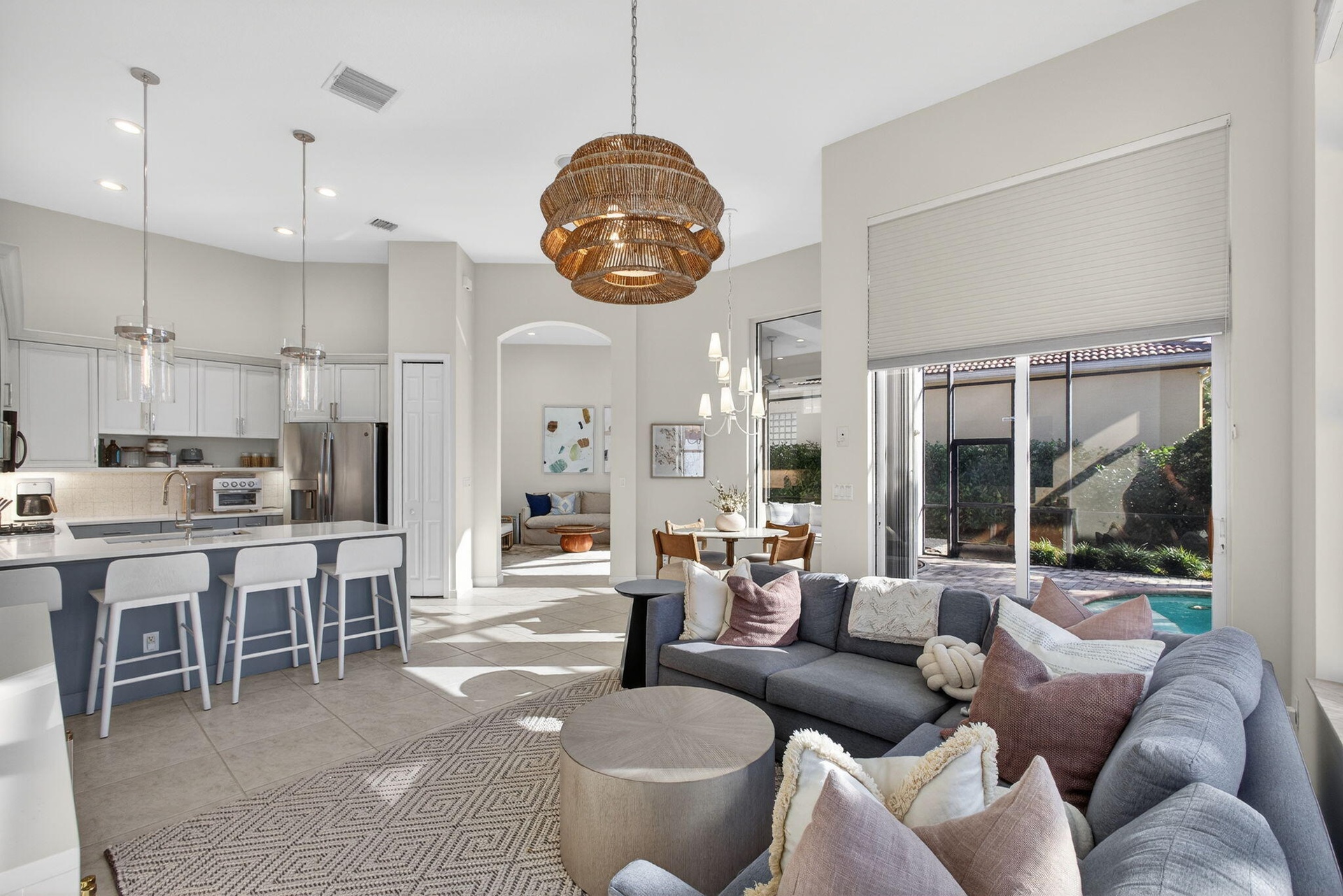 Now is the perfect time to settle into this beautifully updated four-bedroom, three-and-a-half-bath residence located in the prestigious The Country Club at Mirasol. Thoughtfully renovated and truly move-in ready, this home blends timeless elegance with modern comfort throughout. The main living areas feature gorgeous light flooring that enhances the home's open and airy feel, complemented by wood-like flooring in the bedrooms and along the staircase. Designer finishes are found throughout, including stylish lighting fixtures, LED accent lighting, and a soft, sophisticated color palette that creates a warm and inviting atmosphere. The kitchen has been tastefully renovated with quartz countertops, a dramatic waterfall edge, and a beautiful combination of white and soft blue cabinetry. The layout is both functional and inviting, making it ideal for everyday living as well as entertaining. A first-floor (second primary) guest bedroom offers privacy and flexibility with a fully renovated en-suite bath featuring a light wood-styled double-sink vanity, spacious walk-in shower, and updated lighting. This space is ideal for visiting guests or extended family. A newly added powder room provides added convenience for entertaining, and the laundry area has been thoughtfully redesigned to maximize efficiency. Ample closet space and storage are found throughout the home. Upstairs, the popular Dorado floorplan offers two additional bedrooms, a renovated shared bath, and a spacious loft area each finished with new wood-like luxury vinyl flooring to maintain a cohesive and updated look. Outdoor living is a true highlight of this home. Enjoy stunning Florida sunsets from the expansive backyard featuring a free-form, salt-chlorinated heated pool. The fully enclosed patio seamlessly extends the living space outdoors and is surrounded by lush tropical landscaping, all overlooking a beautiful wide lake creating a private and tranquil retreat. A dedicated home office adds flexibility for today's lifestyle. A sports membership offering provides access to exceptional amenities, including indoor and outdoor pickleball courts, Har-Tru tennis courts, two championship golf courses, and multiple dining venues within the community. Additional features include accordion shutters, a tankless water heater, and multiple A/C units replaced in 2020 and 2022, including a separate system serving the first-floor guest suite. This exceptional residence offers the ideal combination of style, comfort, and resort-style living and is truly a must-see.