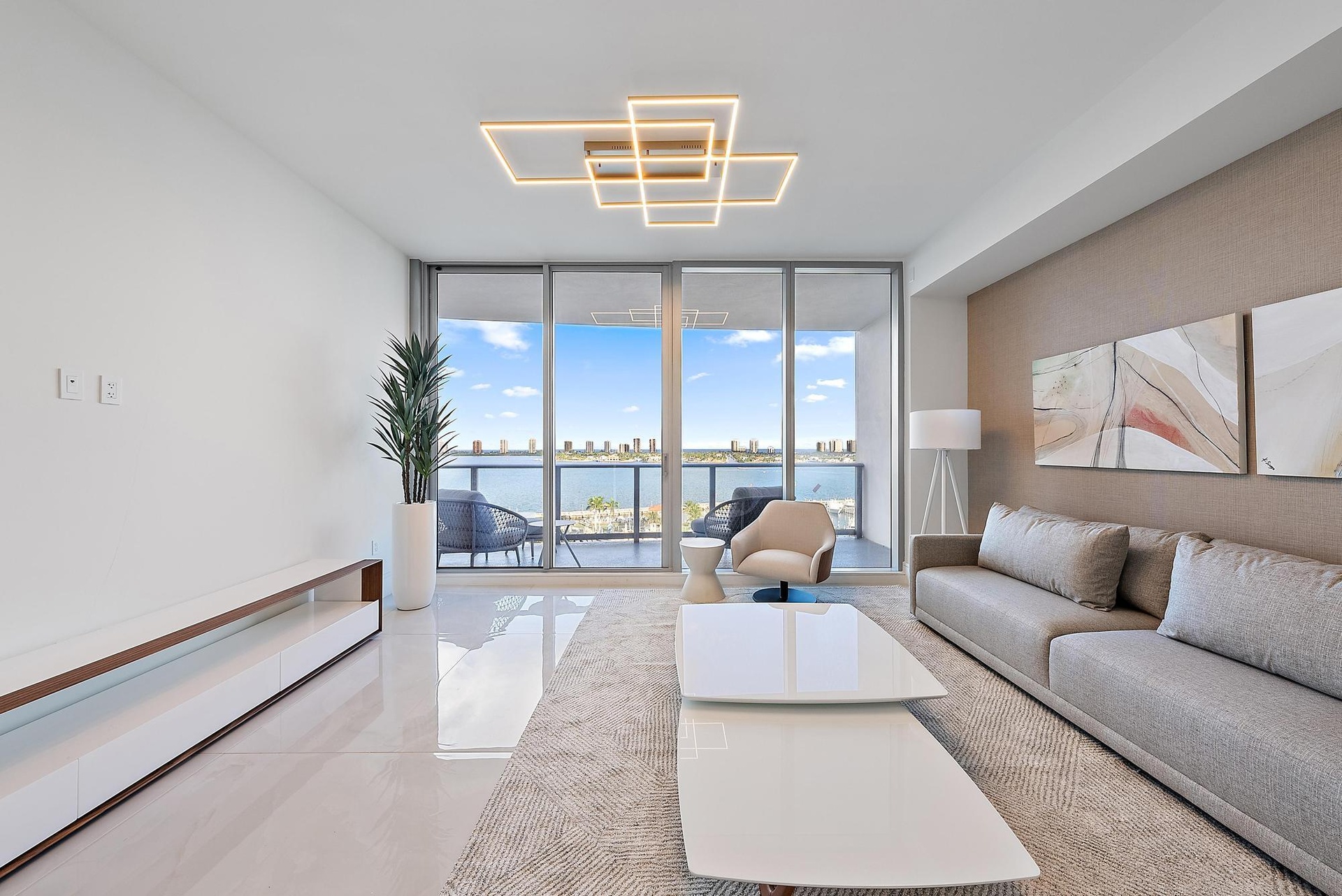 High-floor residence at Nautilus 220 offering rare dual water views of both the Intracoastal and Atlantic, ideally positioned within the tower to capture straight-out, eye-level sightlines. This impeccably designed 3-bedroom, 3.5-bath plus den home features interiors by Stephen G with curated finishes, custom lighting, and window treatments throughout. Floor-to-ceiling glass frames expansive east and west-facing water views, while the open layout is ideal for seasonal or lock-and-leave living. Nautilus 220 is a new luxury waterfront development with resort-style amenities including a marina, wellness center, pool deck, dining, and concierge services. A professionally curated designer furniture package is available, offering a turnkey option for immediate enjoyment. Experience the ultimate in luxury living at Nautilus 220. Enjoy resort-style amenities on a sprawling one-acre deck featuring a pool, spa, fire pits, putting green, yoga deck, and dog park, alongside a club room, cinema, golf simulator, valet, and 24-hour concierge. Inside, discover a spin studio, billiards and card tables, kids' playroom, teen gaming lounge, and more. Take in breathtaking 360-degree views from the rooftop lap pool and spa. Additional conveniences include 24-hour onsite security, management, and electric car charging. With waterfront dining, boutique retail, offices, a café, and private access, N220 offers a lifestyle where every detail is designed for comfort, entertainment, and sophistication.