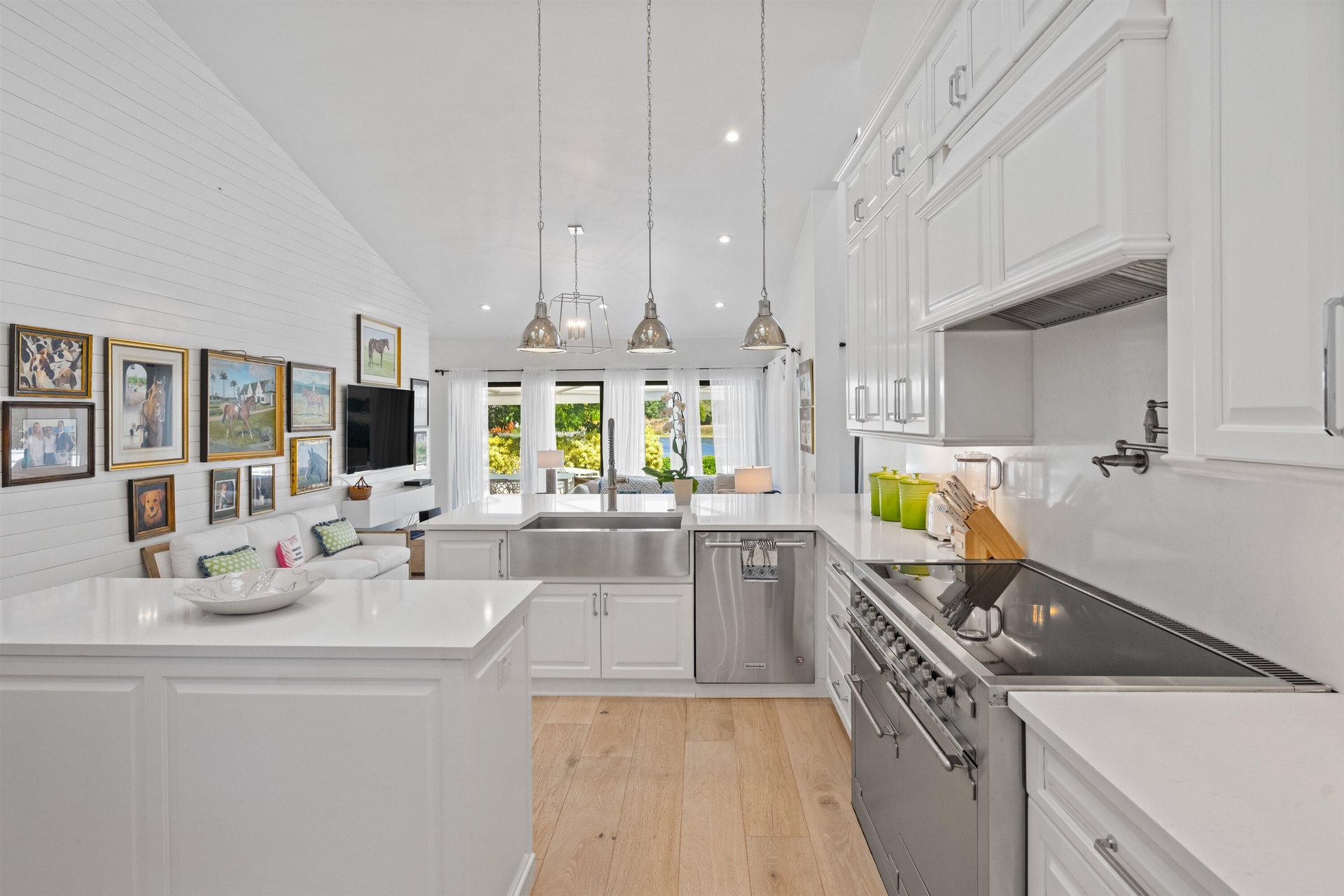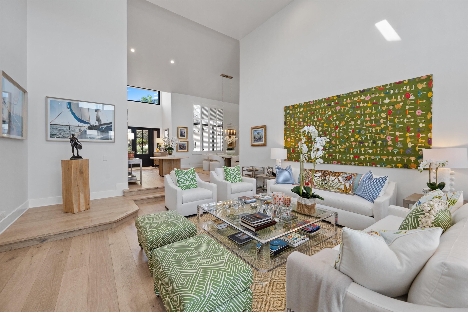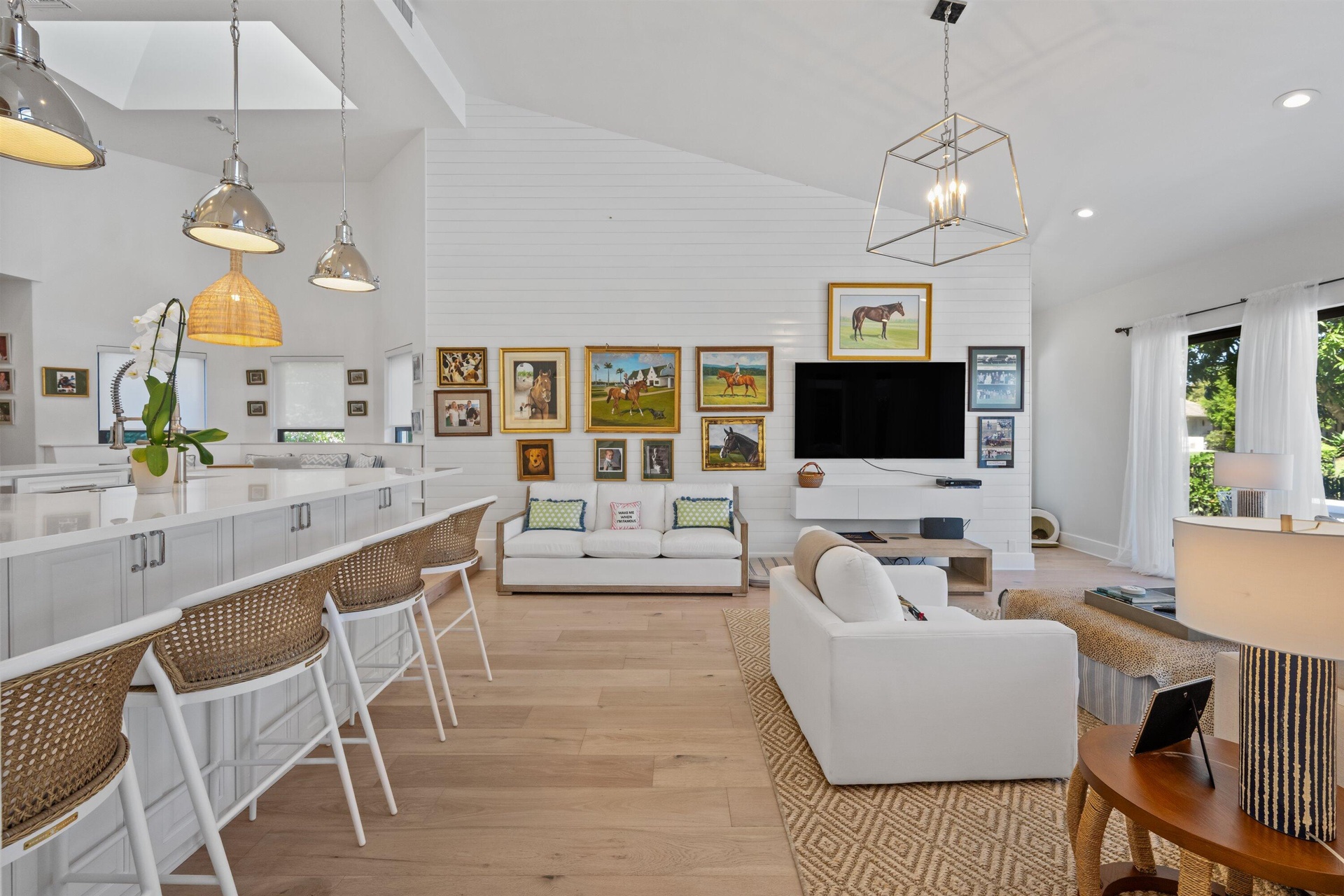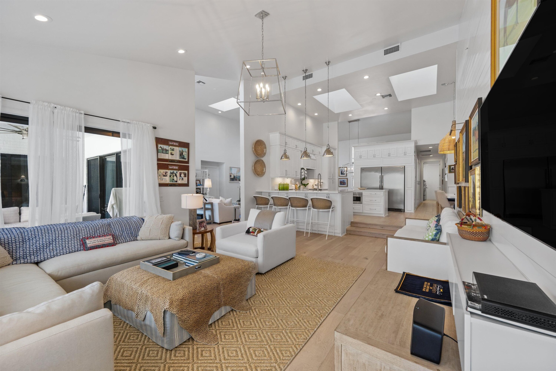 Soaring vaulted ceilings, skylights, and expansive windows fill the interiors with natural light, complementing the crisp neutral palette and sophisticated finishes throughout. The home has been upgraded with wood flooring, adding warmth and continuity to the open-concept design. The layout flows seamlessly into a well-appointed chef's kitchen with quartz countertops, custom cabinetry, a center island, and professional-grade stainless steel appliances. The spacious primary suite provides a tranquil retreat with a spa-inspired bath, while each additional bedroom offers its own beautifully finished en-suite bathroom.