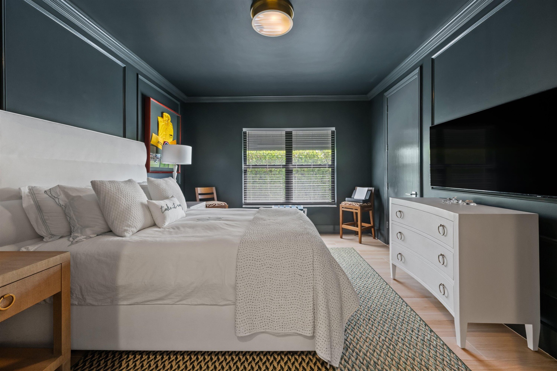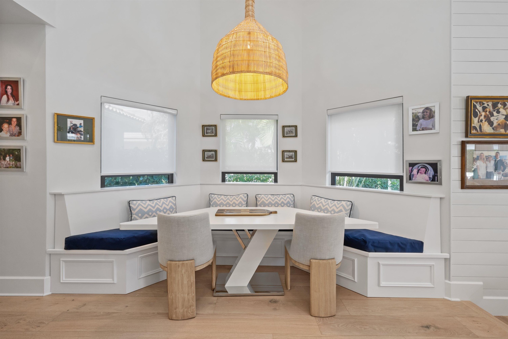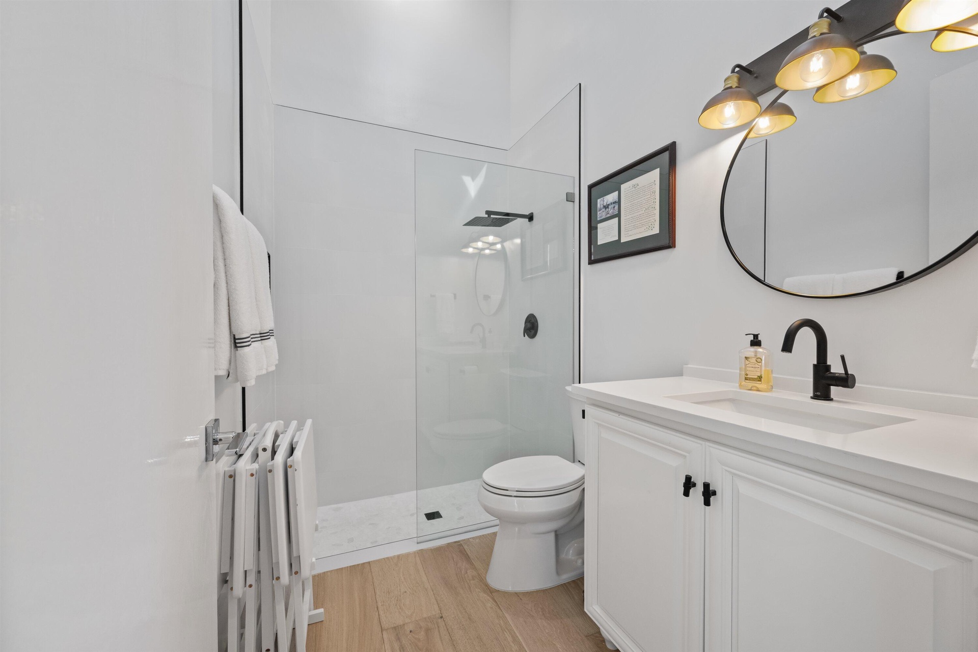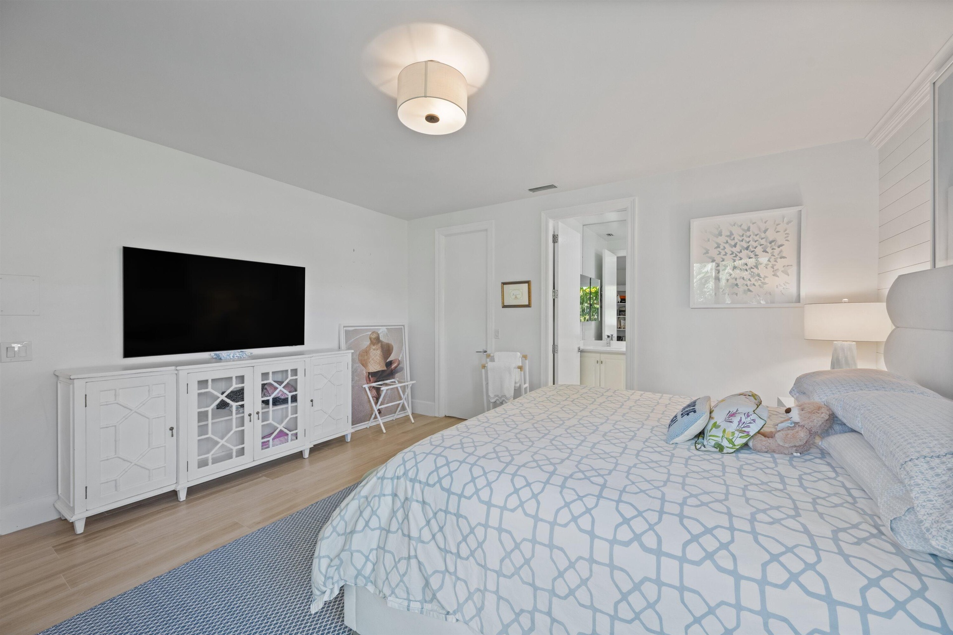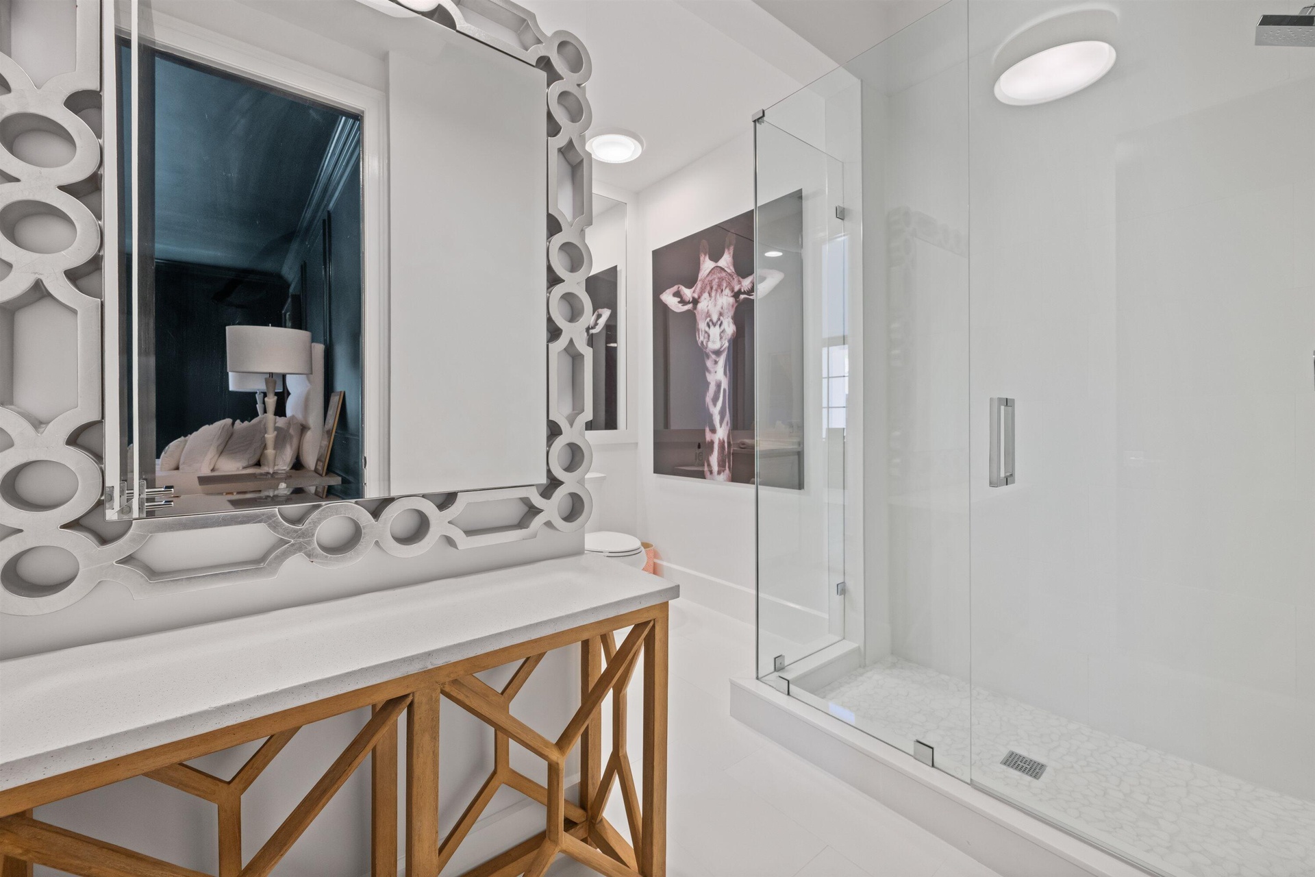 Soaring vaulted ceilings, skylights, and expansive windows fill the interiors with natural light, complementing the crisp neutral palette and sophisticated finishes throughout. The home has been upgraded with wood flooring, adding warmth and continuity to the open-concept design. The layout flows seamlessly into a well-appointed chef's kitchen with quartz countertops, custom cabinetry, a center island, and professional-grade stainless steel appliances. The spacious primary suite provides a tranquil retreat with a spa-inspired bath, while each additional bedroom offers its own beautifully finished en-suite bathroom.