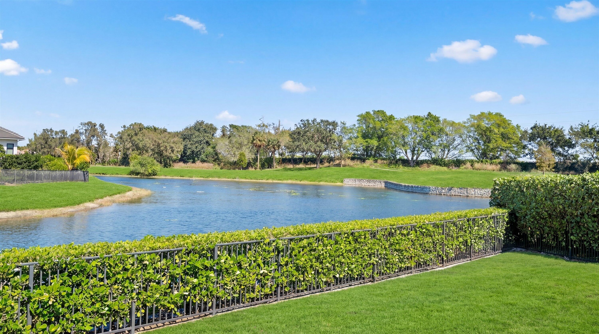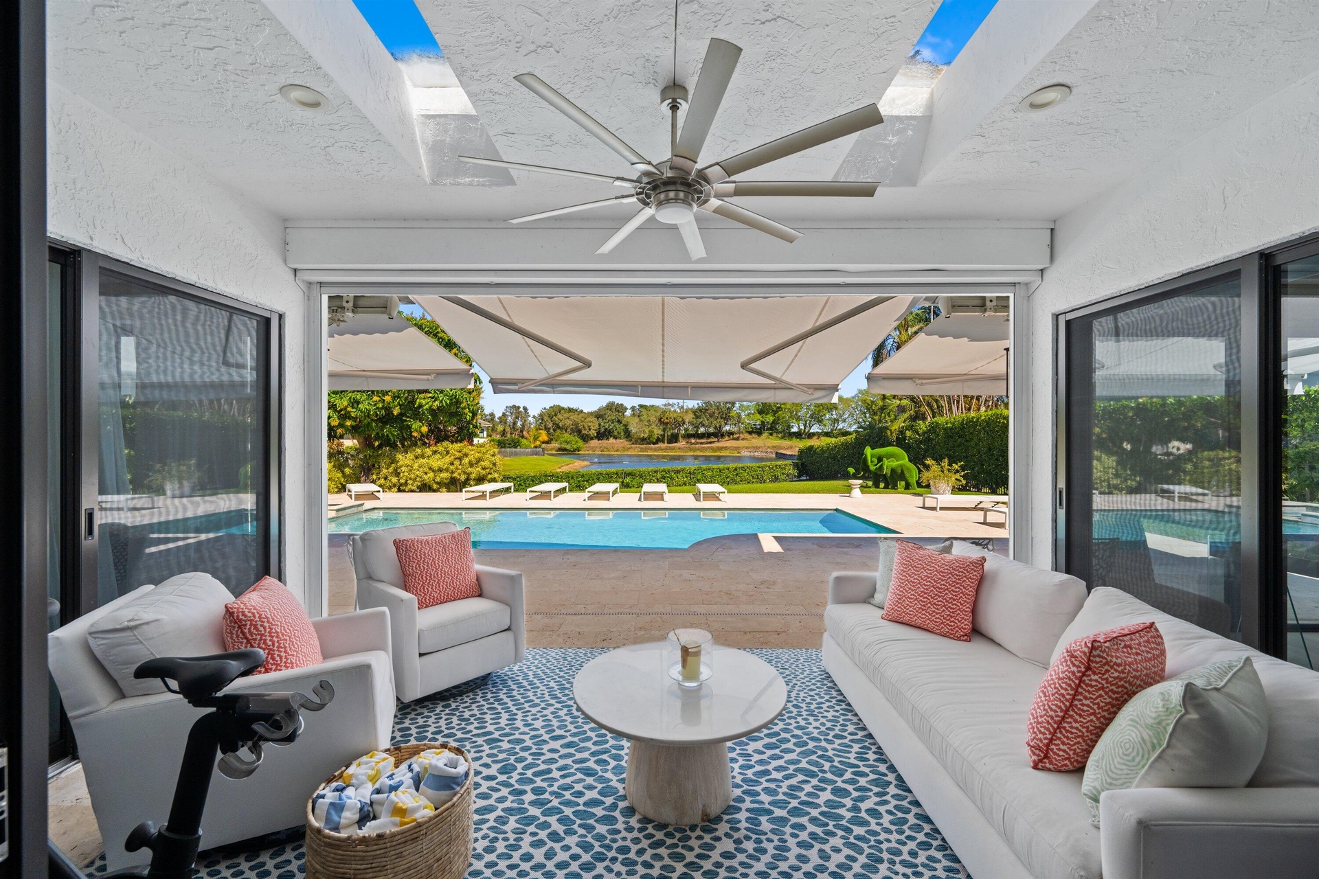 Outdoors, a travertine pool deck surrounds the pool and spa, creating an elegant setting to relax and enjoy serene lake views and lush tropical landscaping. A covered patio enhances the home's seamless indoor-outdoor lifestyle.