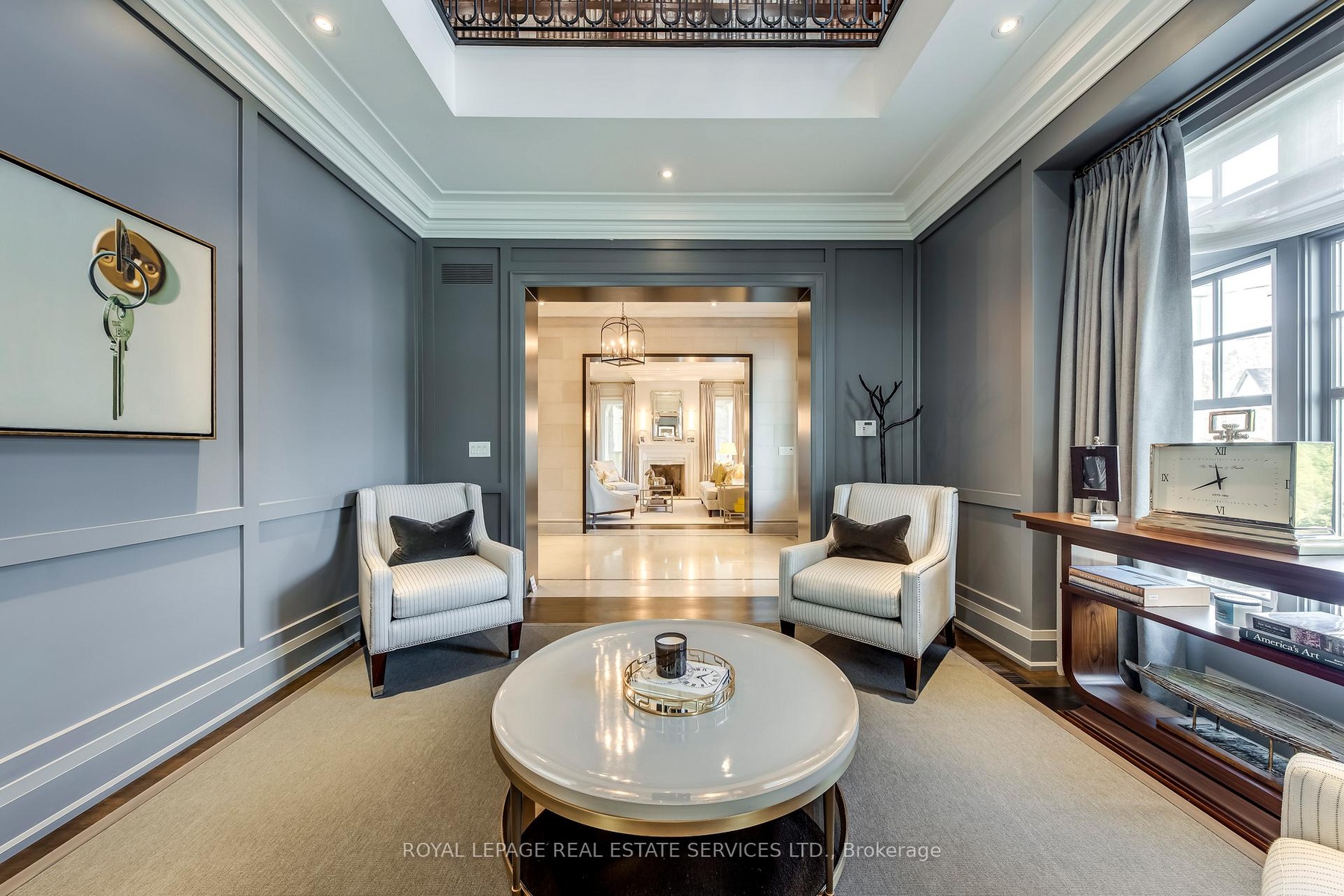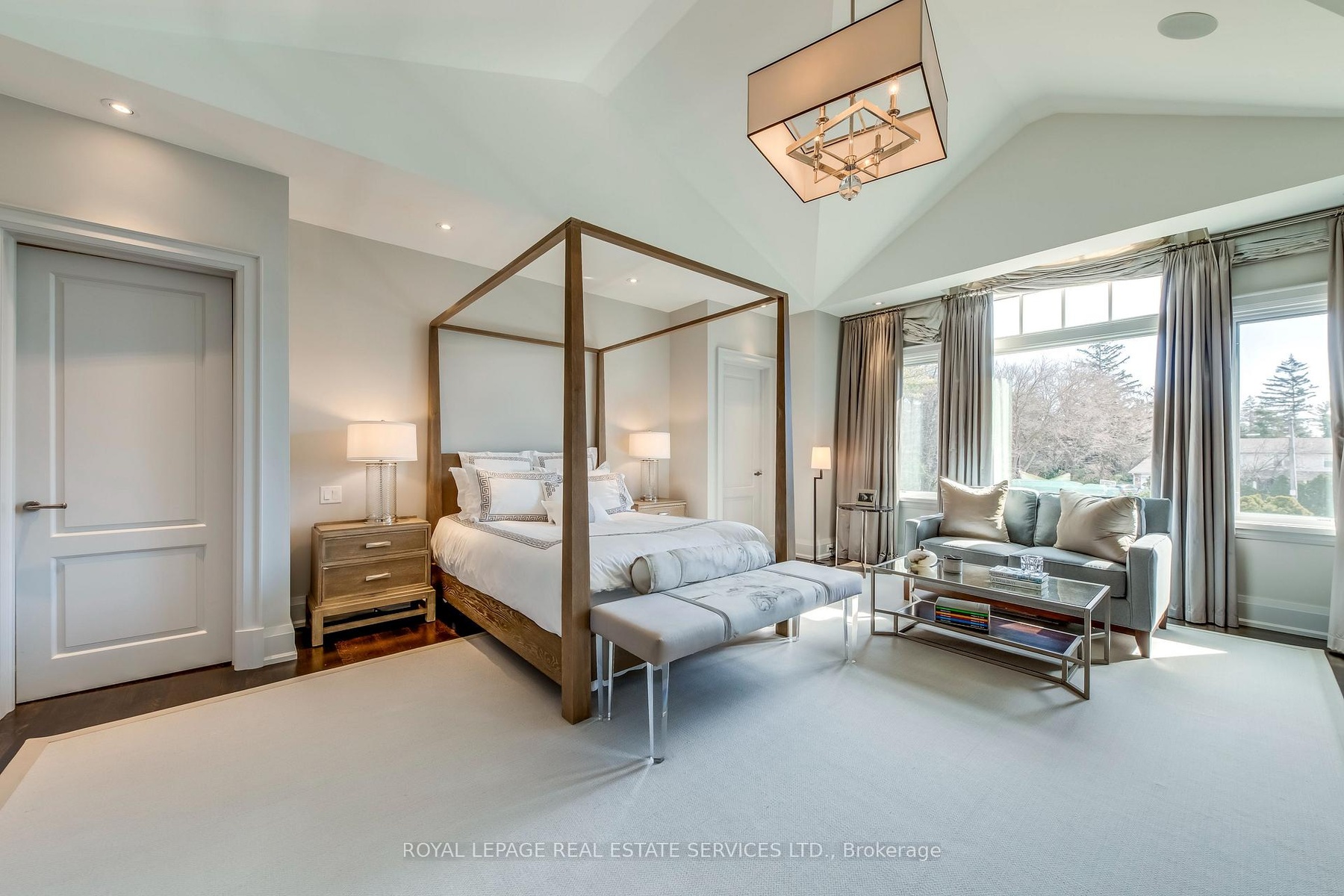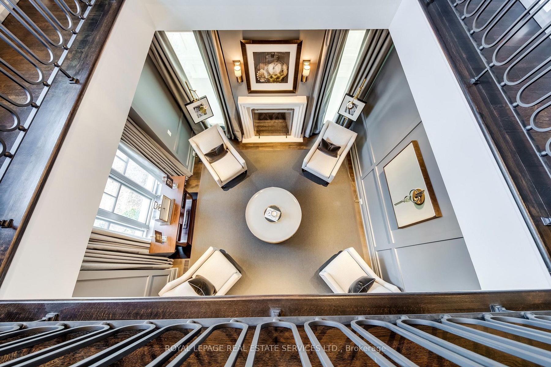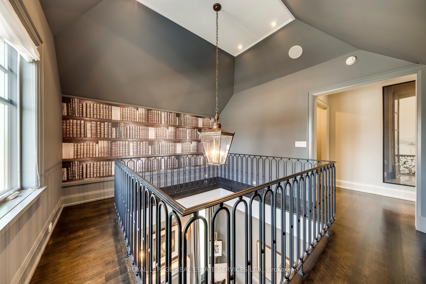 Elegant Custom Estate in Prestigious Southeast Oakville. Experience refined living in this stunning custom residence offering over 4,800 sq ft above grade and more than 7,300 sq ft of total living space. Thoughtfully designed by Michael Pettes and expertly built by PCM, this home showcases timeless architecture and exceptional craftsmanship throughout. The main level exudes European sophistication, featuring plaster crown mouldings, custom drapery, designer wall sconces, and intricate architectural detailing. A dramatic main floor library impresses with soaring ceilings, a gas fireplace, and a striking wrought-iron catwalk above. The grand formal dining room comfortably accommodates large gatherings, perfect for elegant entertaining. At the heart of the home is a Downsview chef's kitchen complete with a large centre island, servery, and seamless flow into the breakfast area and spacious family room. The upper level offers an outstanding layout highlighted by a wide skylit hallway-ideal for displaying art or family memories. All four generously sized bedrooms feature private ensuites and ample closets. The luxurious primary retreat boasts a cathedral ceiling, dressing room, and spa-inspired ensuite with a built-in bookshelf beside the soaker tub. The fully finished lower level is designed for both relaxation and entertaining, featuring a fifth bedroom, full bath, expansive recreation room with wet bar, and a stone-accent wine cellar. A large laundry room with extensive counter space and a wide winding walk-up to the backyard adds convenience. Additional highlights include a main floor den, upper-level study, heated interlock driveway, oversized garage with car lift capability, covered rear porch, and dual furnaces and A/C units. Ideally located within walking distance to top-rated schools and just minutes to shopping, amenities, and major highways, this exceptional home offers luxury, functionality, and an unbeatable Southeast Oakville lifestyle.