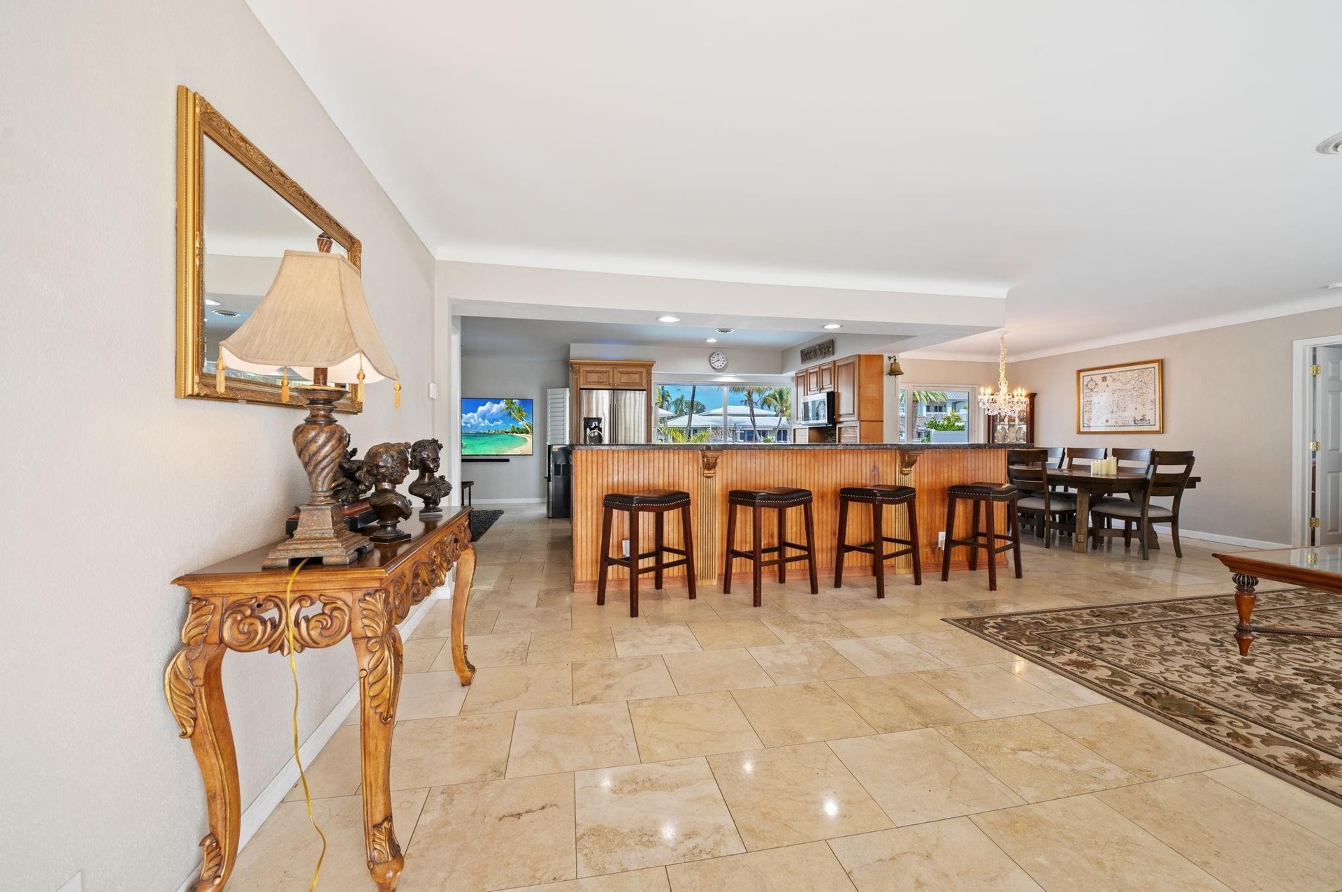 Experience the ultimate waterfront lifestyle from this beautiful 4 bedroom 3 bathroom home! Perfectly positioned 2 homes from the Intracoastal with direct ocean access and no fixed bridges, offering stunning indoor-outdoor living and backyard boating from the 80ft dock. Open floor plan with an abundance of natural light, all rooms designed to maximize the water views. Kitchen has wood cabinets, granite counters and bar, stainless appliances, pantry. Family room off the kitchen, fully dining area and beautiful lounge with bay windows. Primary bedroom overlooks the outdoors, updated marble bath with step in shower, custom closet. 2nd and 3rd modern beds share a Jack and Jill bath; 4th is spacious and has awesome water and salt water pool views currently being used as an office. All tastefull Experience the ultimate waterfront lifestyle from this beautiful 4 bedroom 3 bathroom home! Perfectly positioned 2 homes from the Intracoastal with direct ocean access and no fixed bridges, offering stunning indoor-outdoor living and backyard boating from the 80ft dock. Open floor plan with an abundance of natural light, all rooms designed to maximize the water views. Kitchen has wood cabinets, granite counters and bar, stainless appliances, pantry. Family room off the kitchen, fully dining area and beautiful lounge with bay windows. Primary bedroom overlooks the outdoors, updated marble bath with step in shower, custom closet. 2nd and 3rd modern beds share a Jack and Jill bath; 4th is spacious and has awesome water and salt water pool views currently being used as an office. All tastefully remodeled in a contemporary style. Plantation shutters throughout, hurricane impact windows and doors, tile and wood floors, tankless water heater, washer and dryer and in the oversized 2 car garage, circular driveway with plenty of room for multiple cars or boats, recycled water for the sprinkler system. No homeowner's association and the most sought after street in Harbor Village.